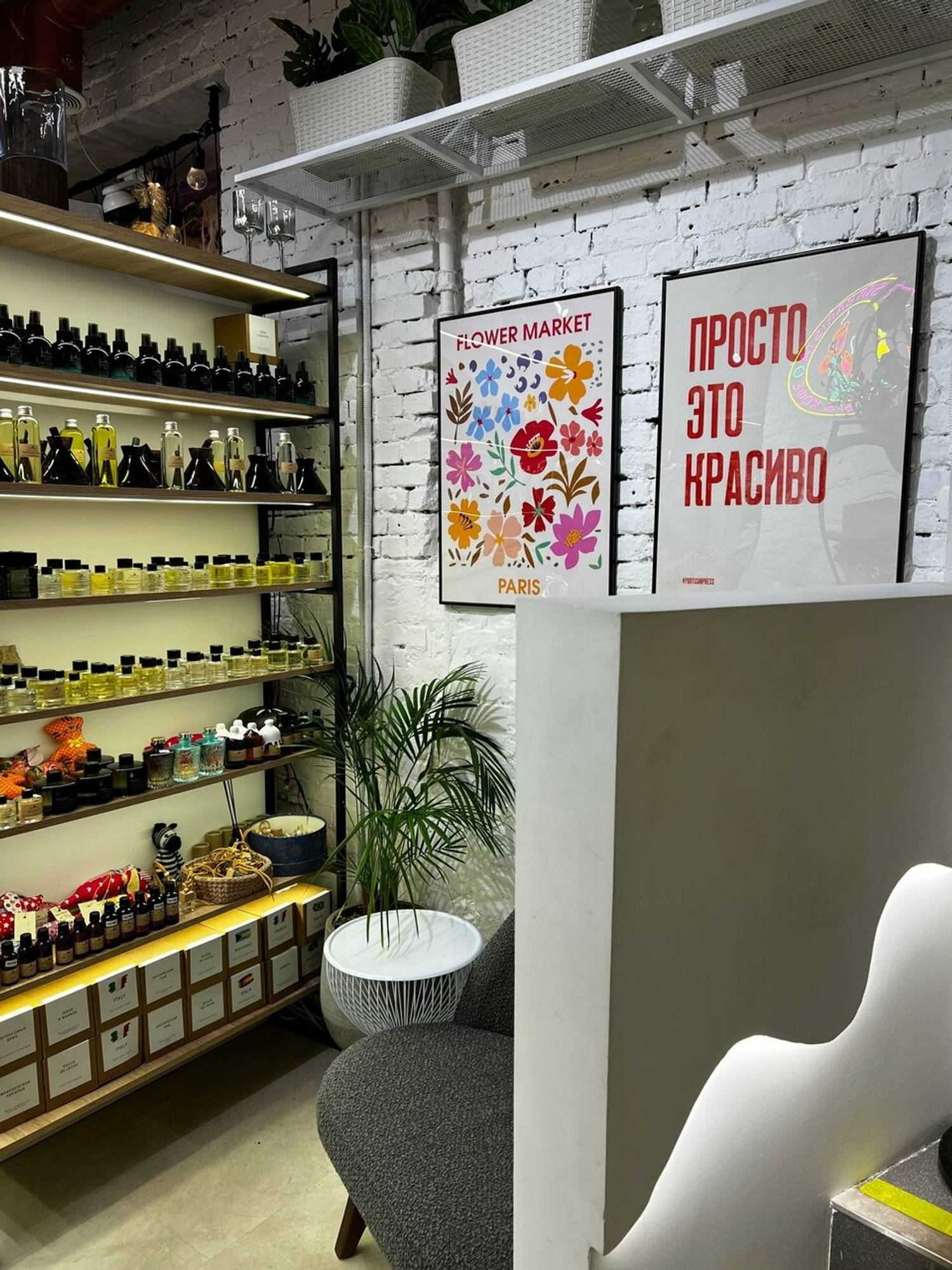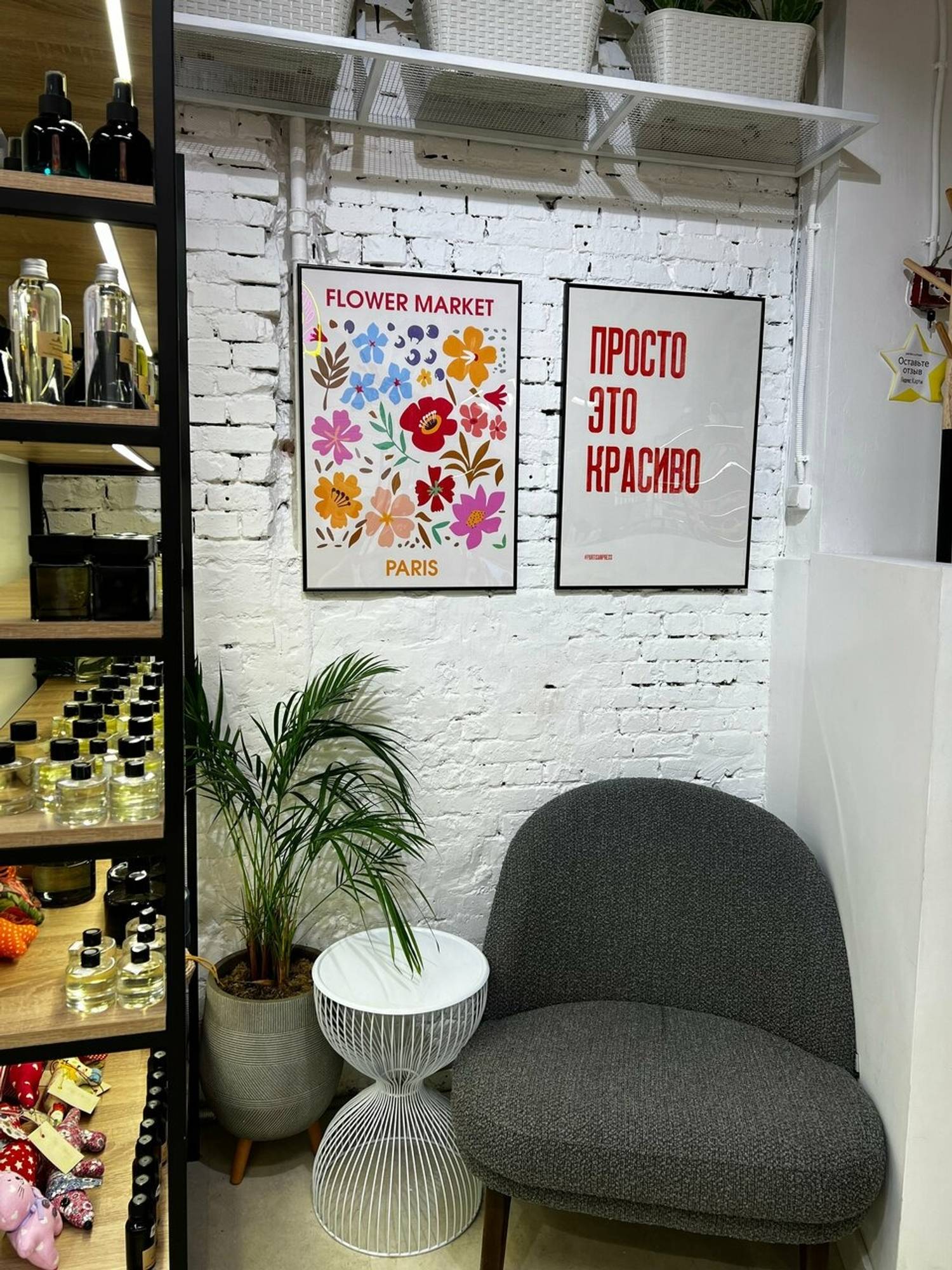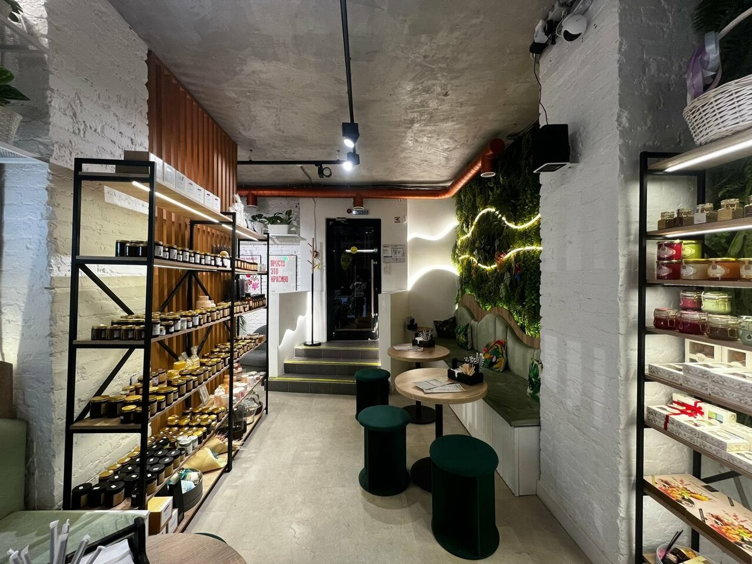 Атмосфера. Главный акцент интерьера — живая зеленая стена с пышными растениями, подсвеченная плавной волнообразной подсветкой. Круглые пуфики изумрудного цвета, полки со свечами и картина с ботаническими мотивами добавляют пространству  художественного шарма. Даже на белой стойке заказа можно заметить изящные рисунки листьев, которые подчеркивают общую концепцию.