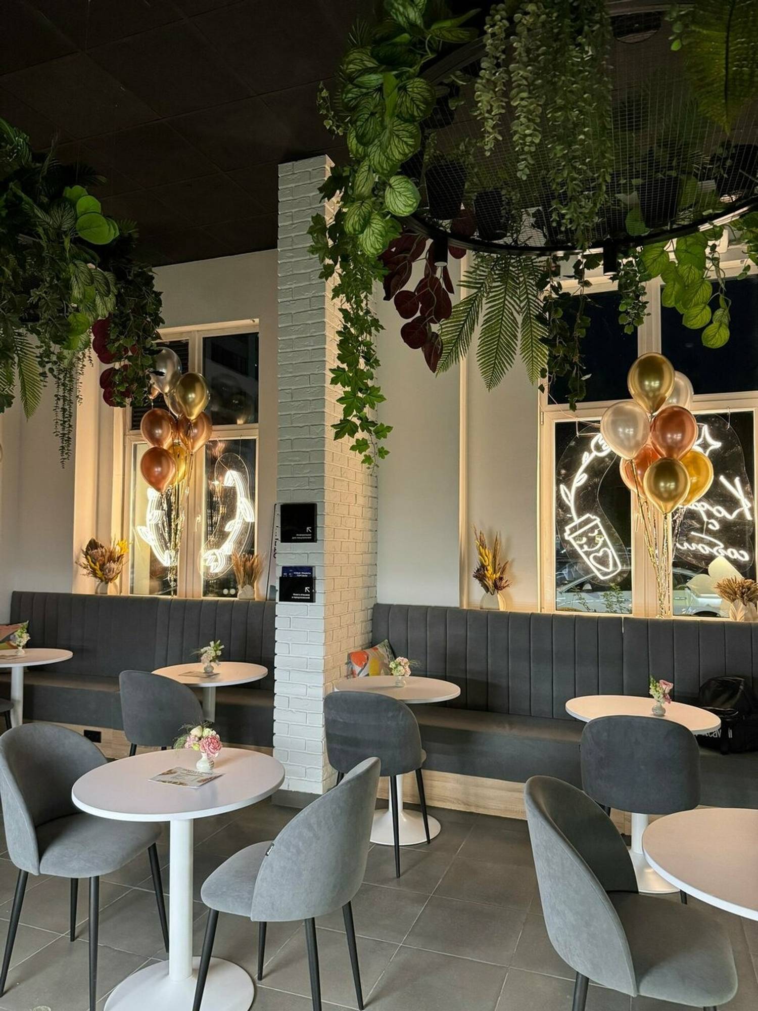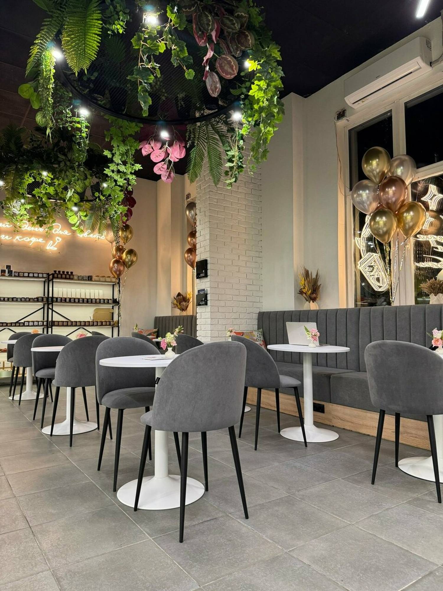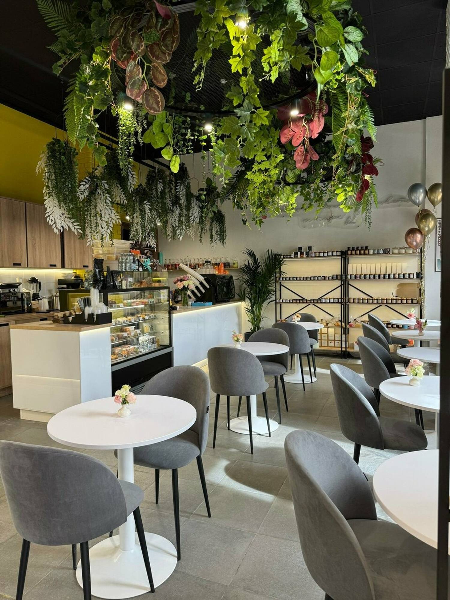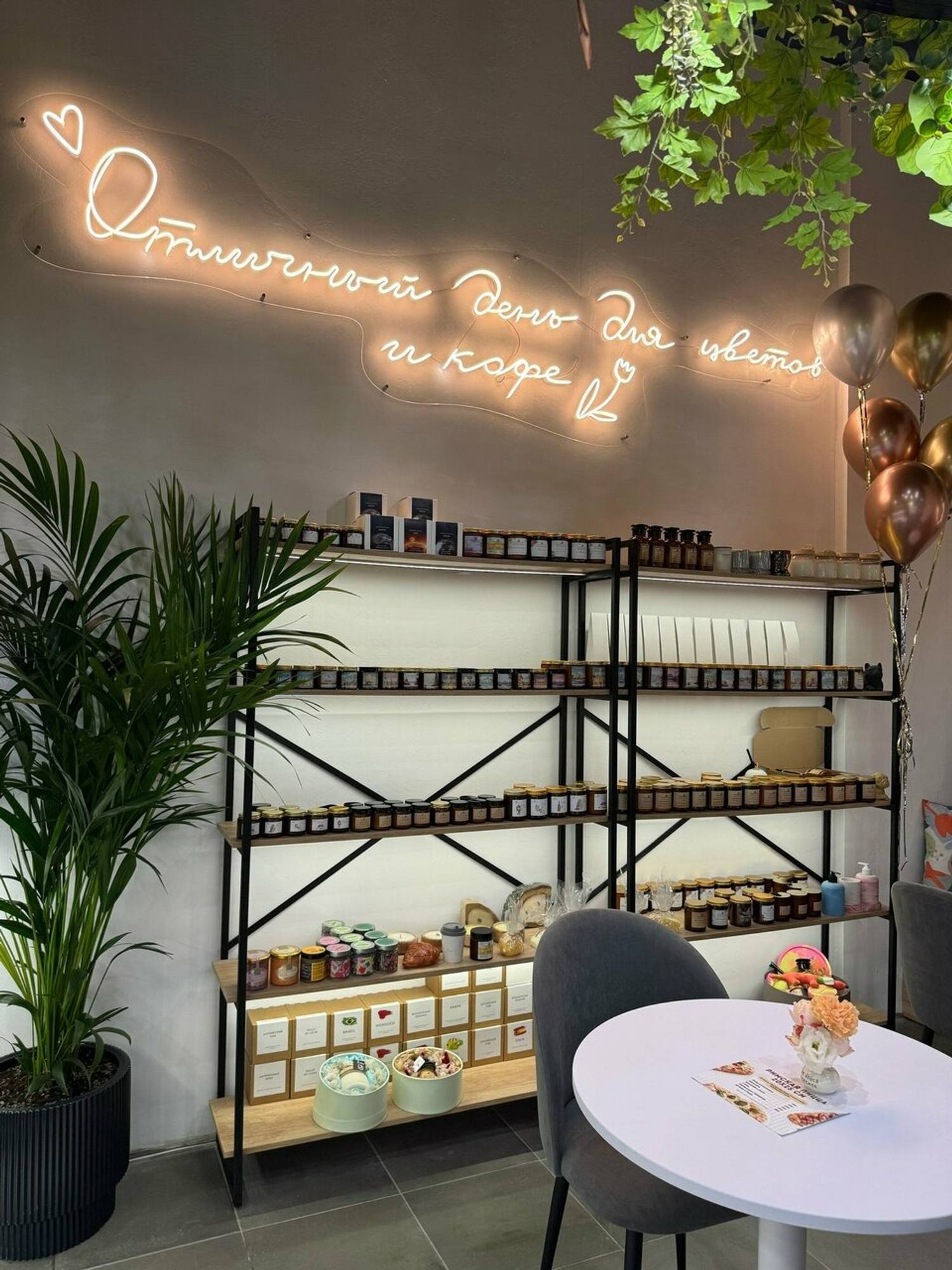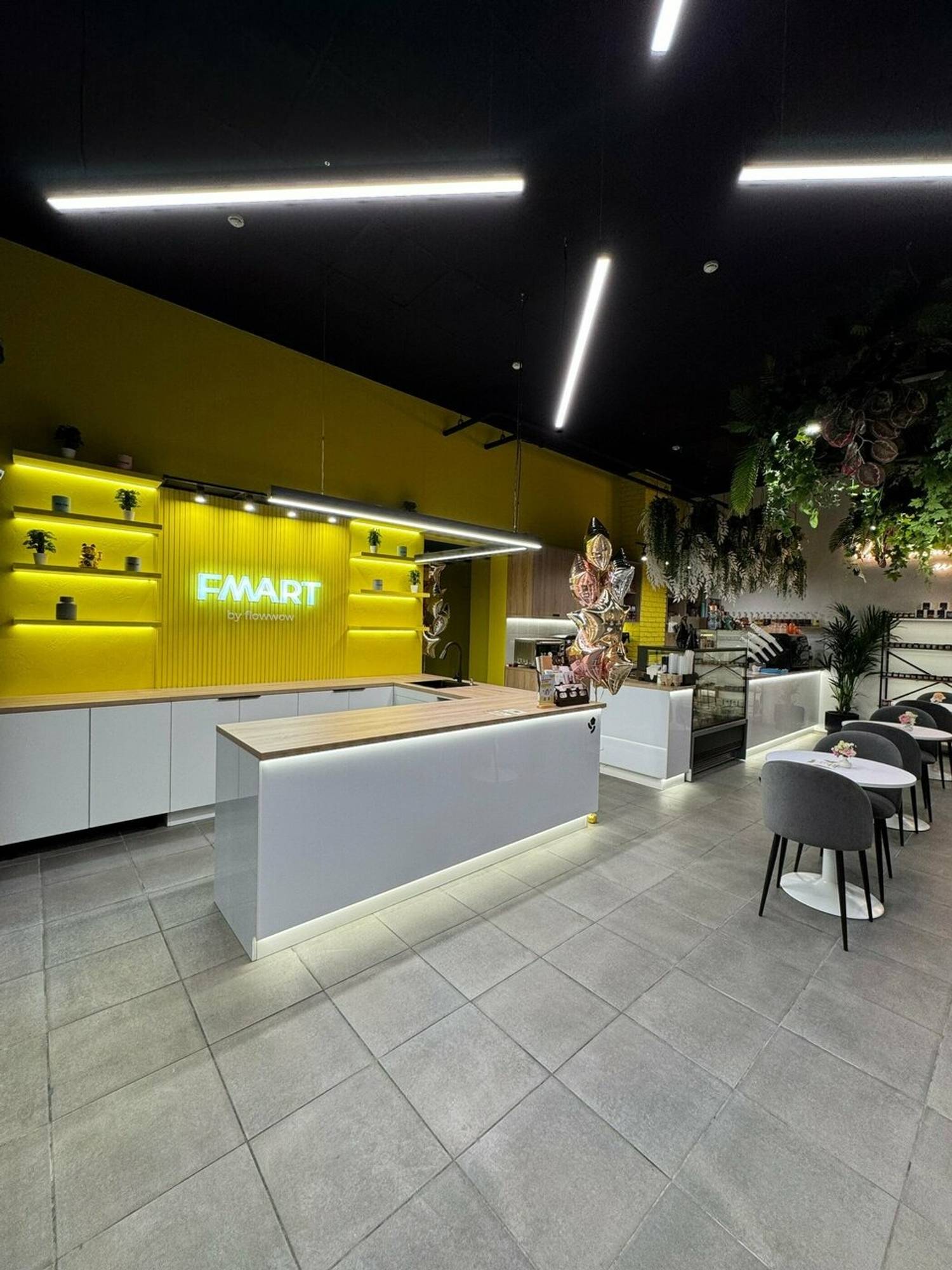 Атмосфера. Интерьер сочетает эстетику цветочной мастерской и современной кофейни: люстра, украшенная живыми растениями, создает романтичное настроение, а белые столы, серые мягкие стулья и диван добавляют комфорта. Яркие акценты задают светящаяся надпись «Отличный день для цветов и кофе», неоновые изображения кофейных стаканов на окнах и желтая стена с фактурой «в рубчик» и логотипом «Fmart».