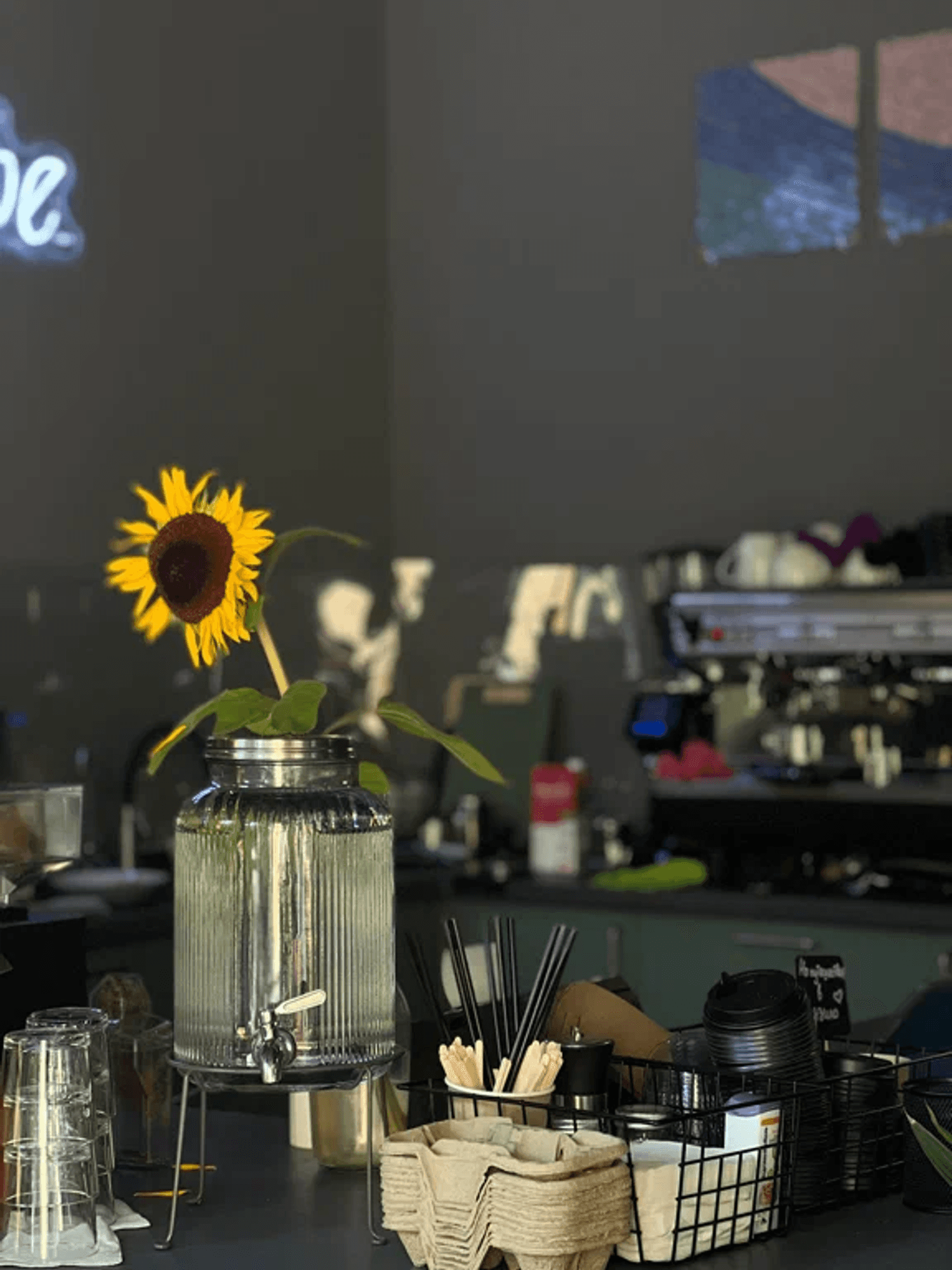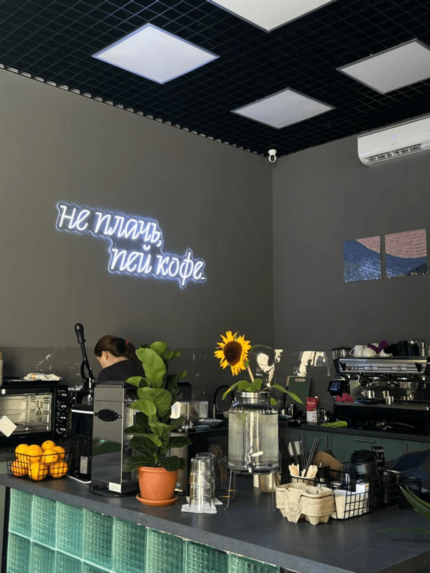 Еда и напитки. В меню — широкий выбор кофе: от классического эспрессо, американо и латте до фильтра и воронки. Также есть бамбл вишня-миндаль и раф апельсин-шоколад. Из еды есть драники, киш с курицей и грибами, круассан с бужениной.