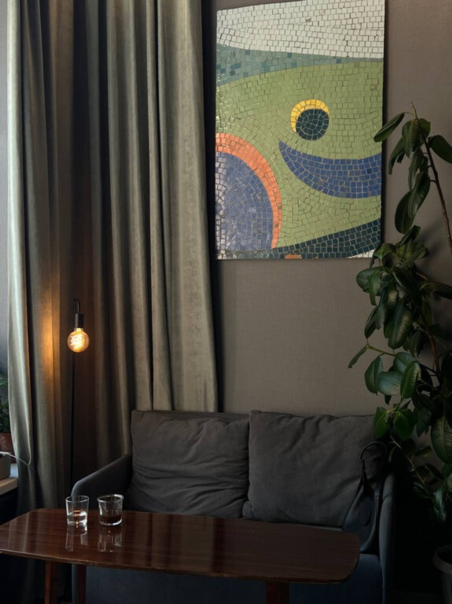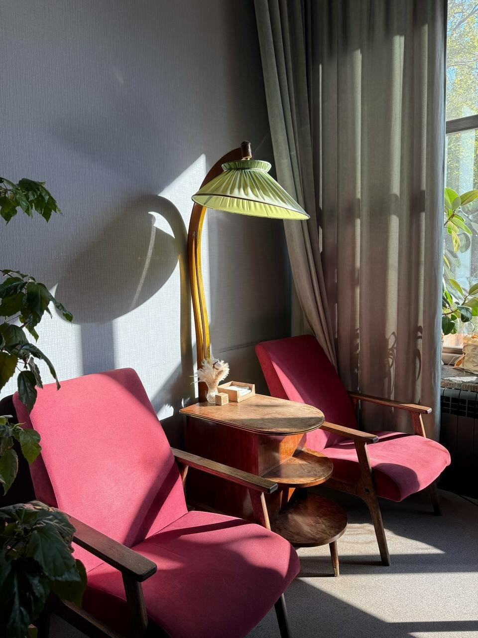 Атмосфера. Высокие потолки, панорамные окна и светлые стены с пейзажными мозаичными панно формируют ощущение простора и свободы. Интерьер гармонично сочетает ретро-элементы и современный комфорт: уютные кресла в красных тонах, серые диваны, стеклянный бар и зеленый торшер.