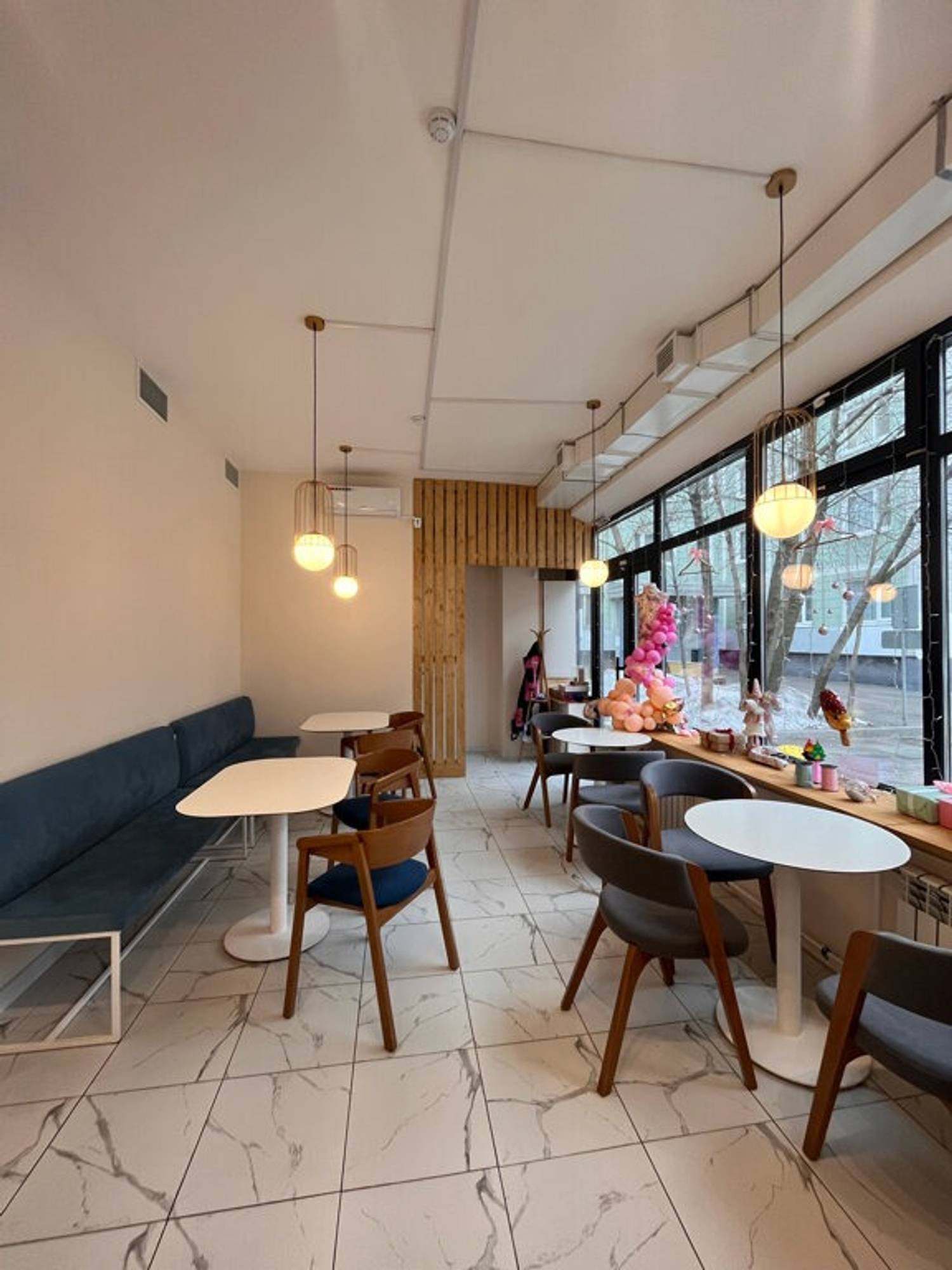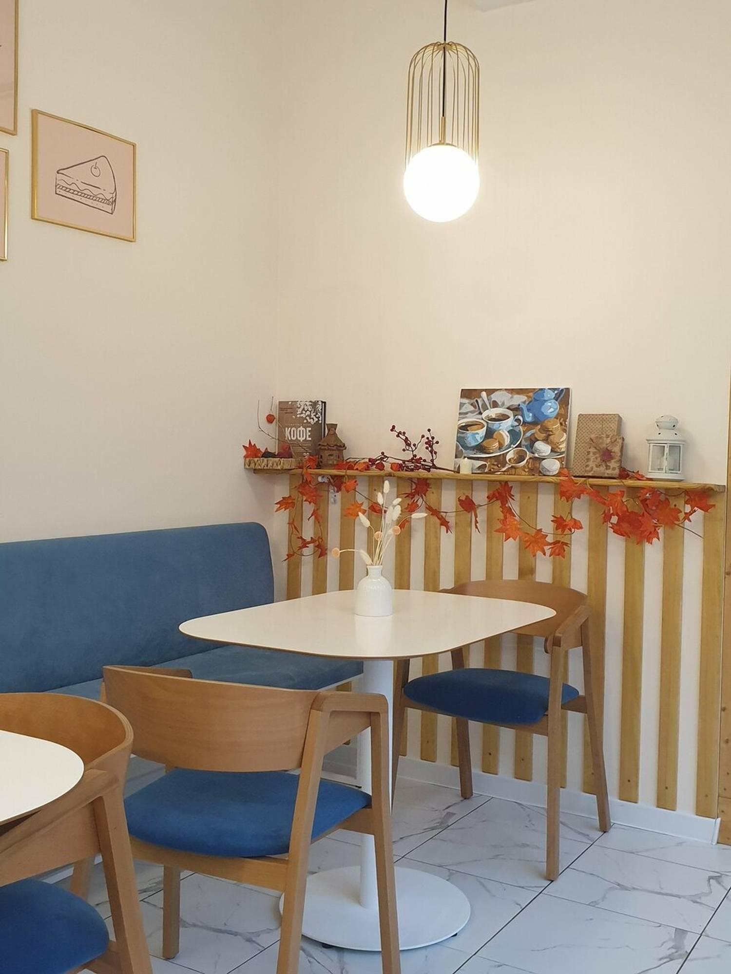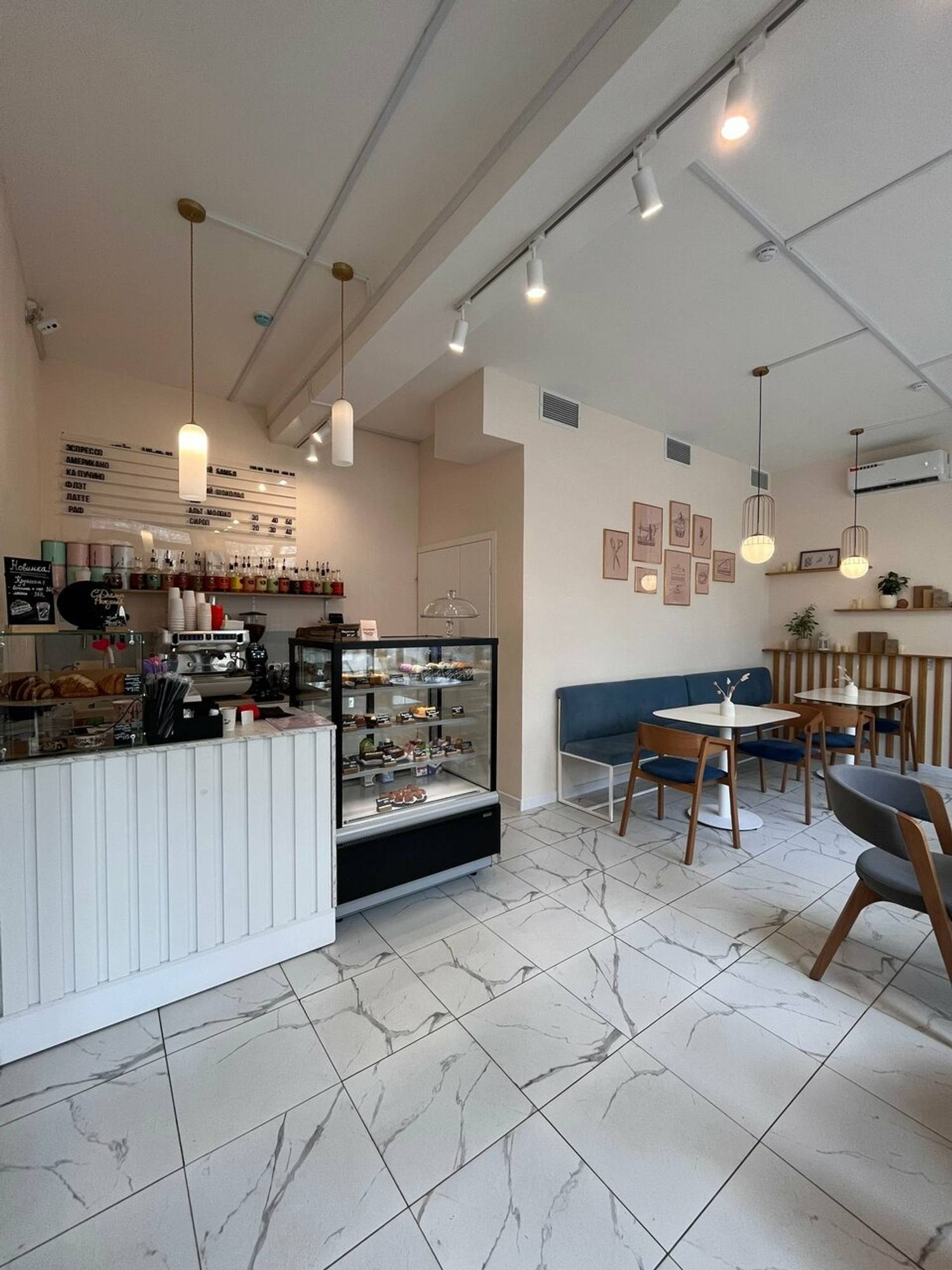 Атмосфера. Светлое пространство с пастельной палитрой: большие окна, мраморный пол и белая стойка заказов. Бежевые картины, полки с искусственными цветами, книги и свечи добавляют камерности, а серые диваны и белые стулья располагают к неспешному отдыху. Наклейки-сердечки на зеркале у входа задают дружелюбный тон.