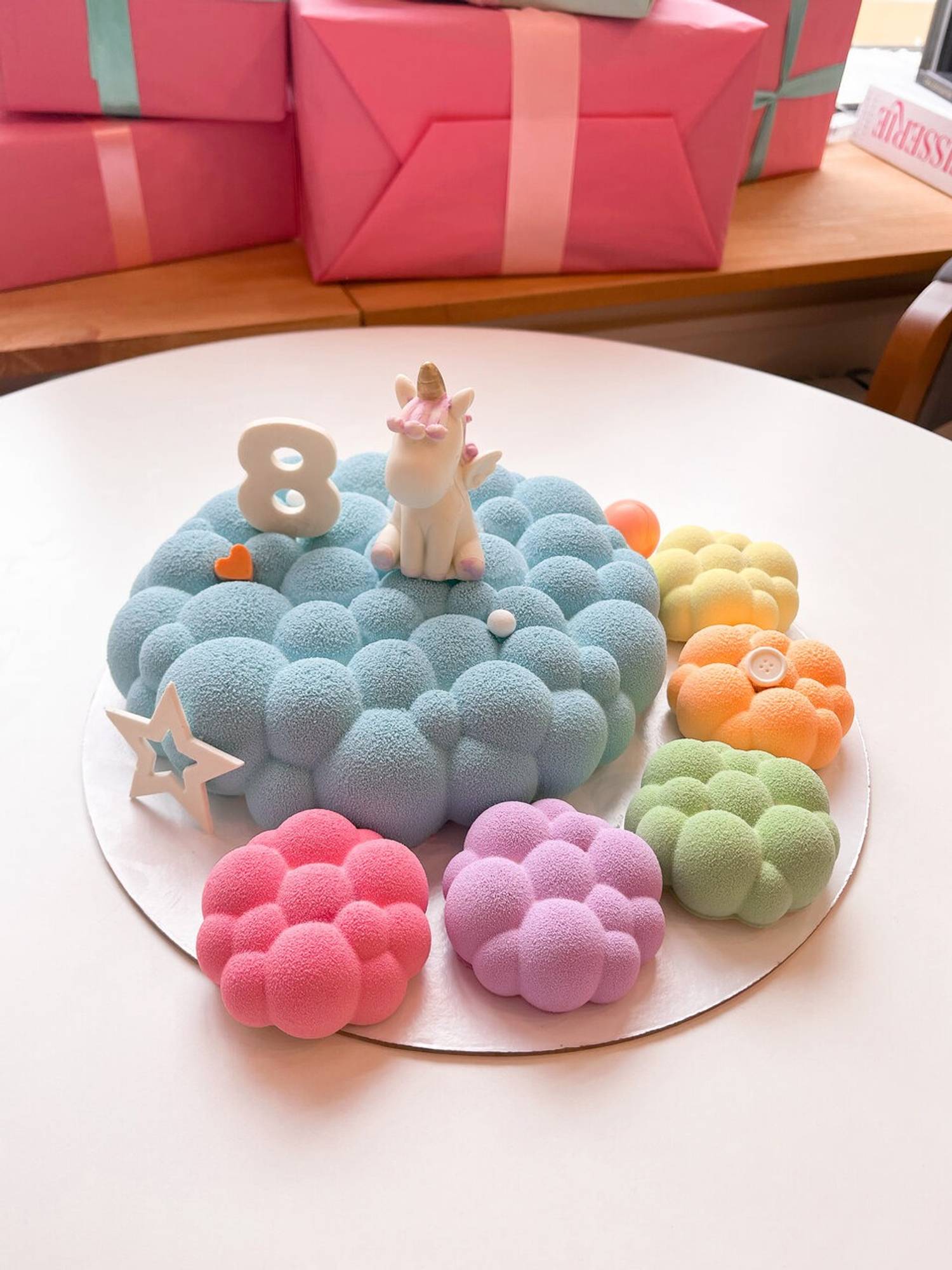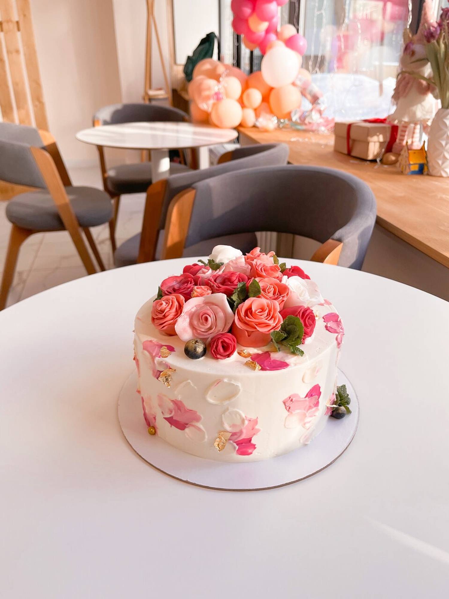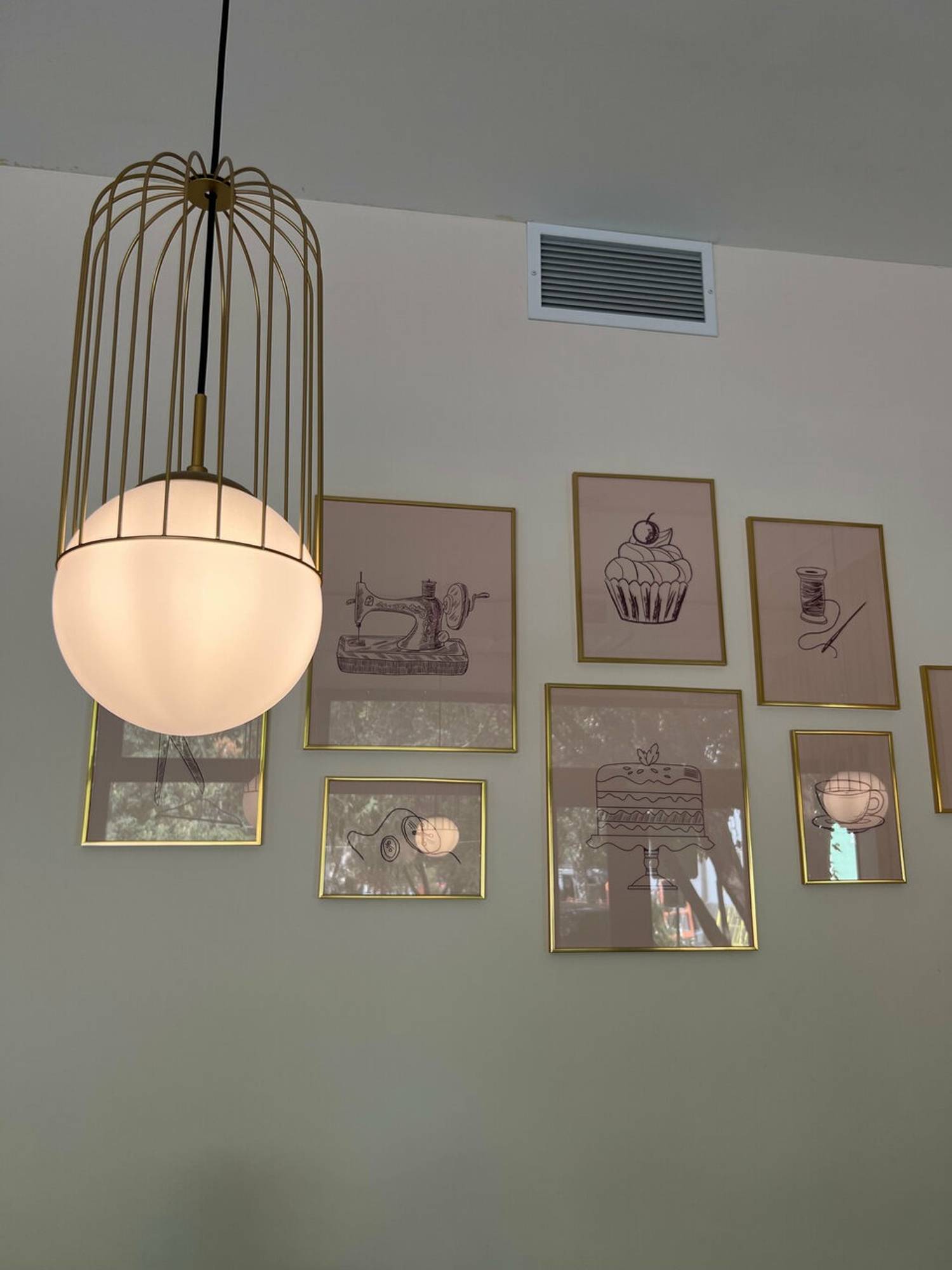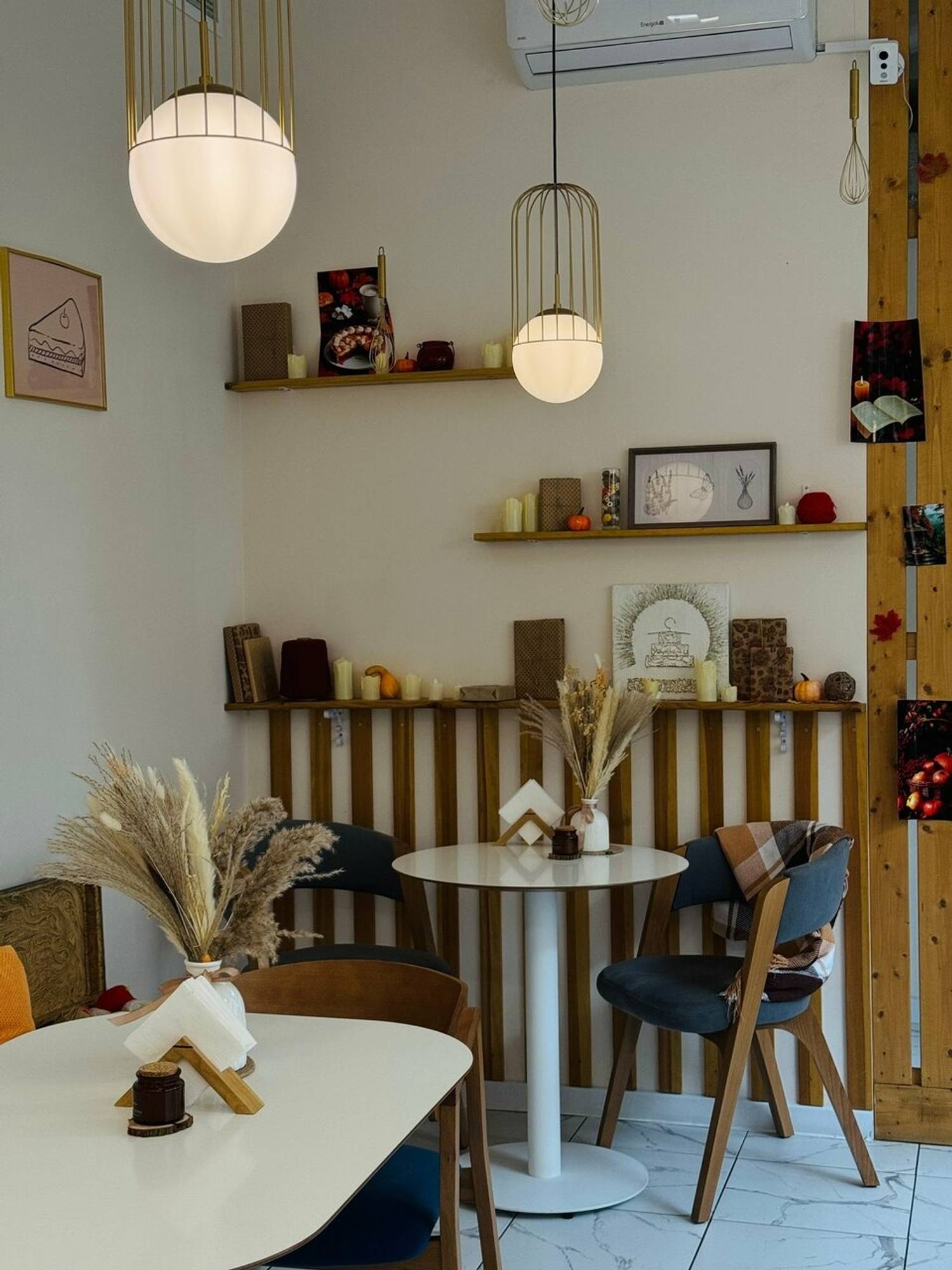 Атмосфера. Светлое пространство с пастельной палитрой: большие окна, мраморный пол и белая стойка заказов. Бежевые картины, полки с искусственными цветами, книги и свечи добавляют камерности, а серые диваны и белые стулья располагают к неспешному отдыху. Наклейки-сердечки на зеркале у входа задают дружелюбный тон.