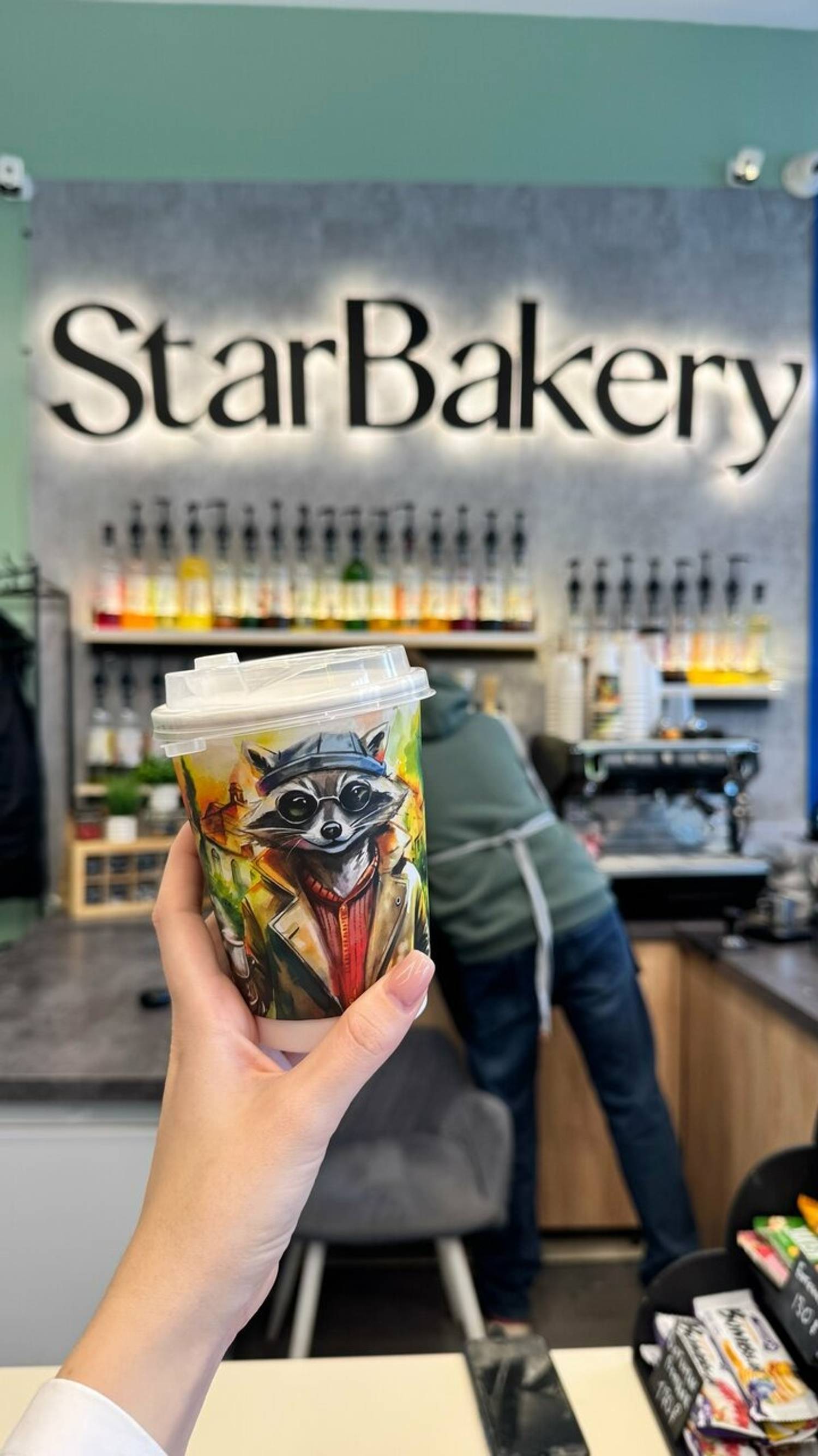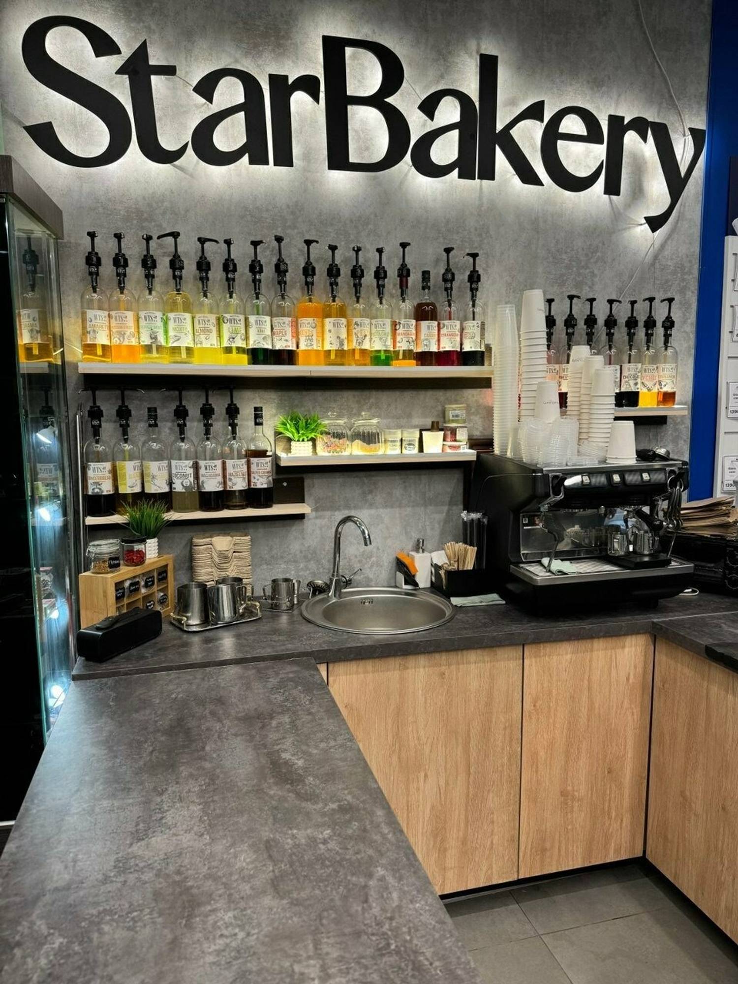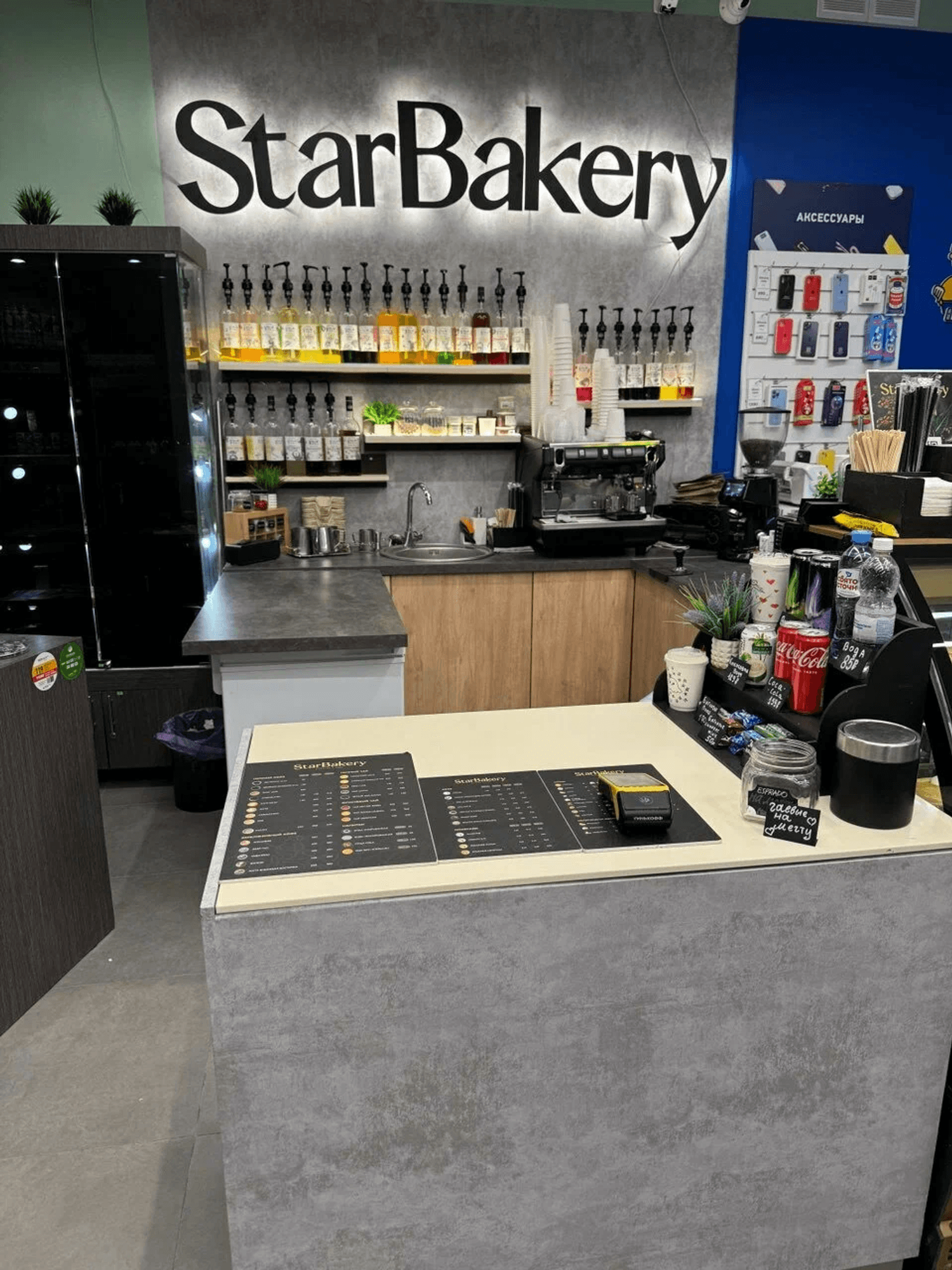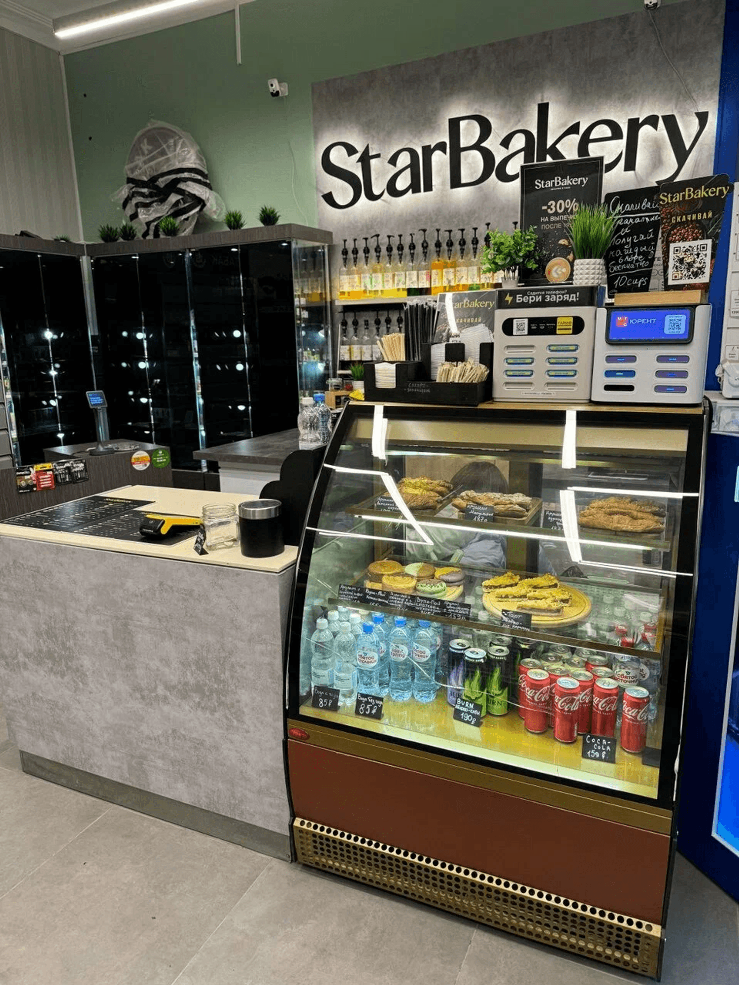 Атмосфера. Интерьер в лаконичном городском стиле: серая стойка и стены служат нейтральным фоном для яркой черной надписи с подсветкой, которая становится акцентом за барной зоной. На стеклянных витринах можно увидеть выпечку и газировку в бутылках.