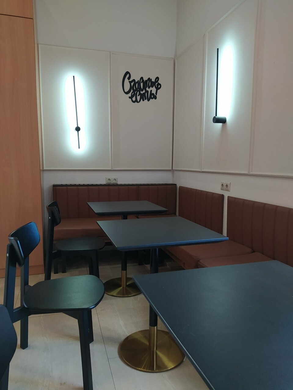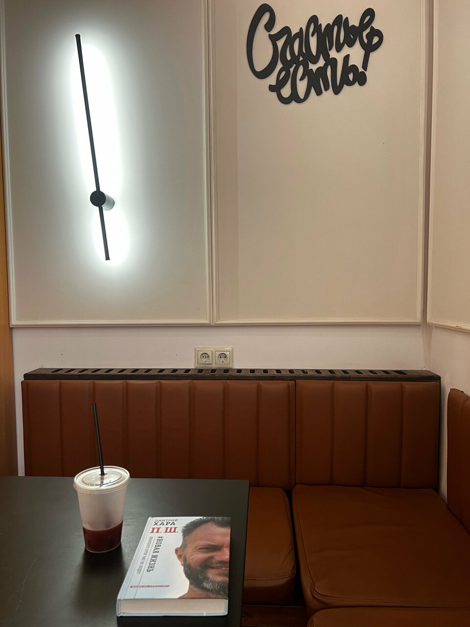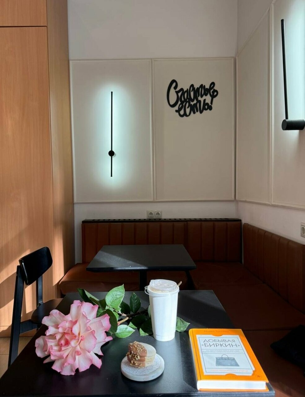 Атмосфера. Пространство в теплой натуральной гамме со стойкой из темных деревянных панелей и мягкие коричневые диваны. Особый шарм интерьеру придают оригинальные черные бра в виде протянутых ветвей, а настенная надпись «счастье есть» поднимает настроение гостям.