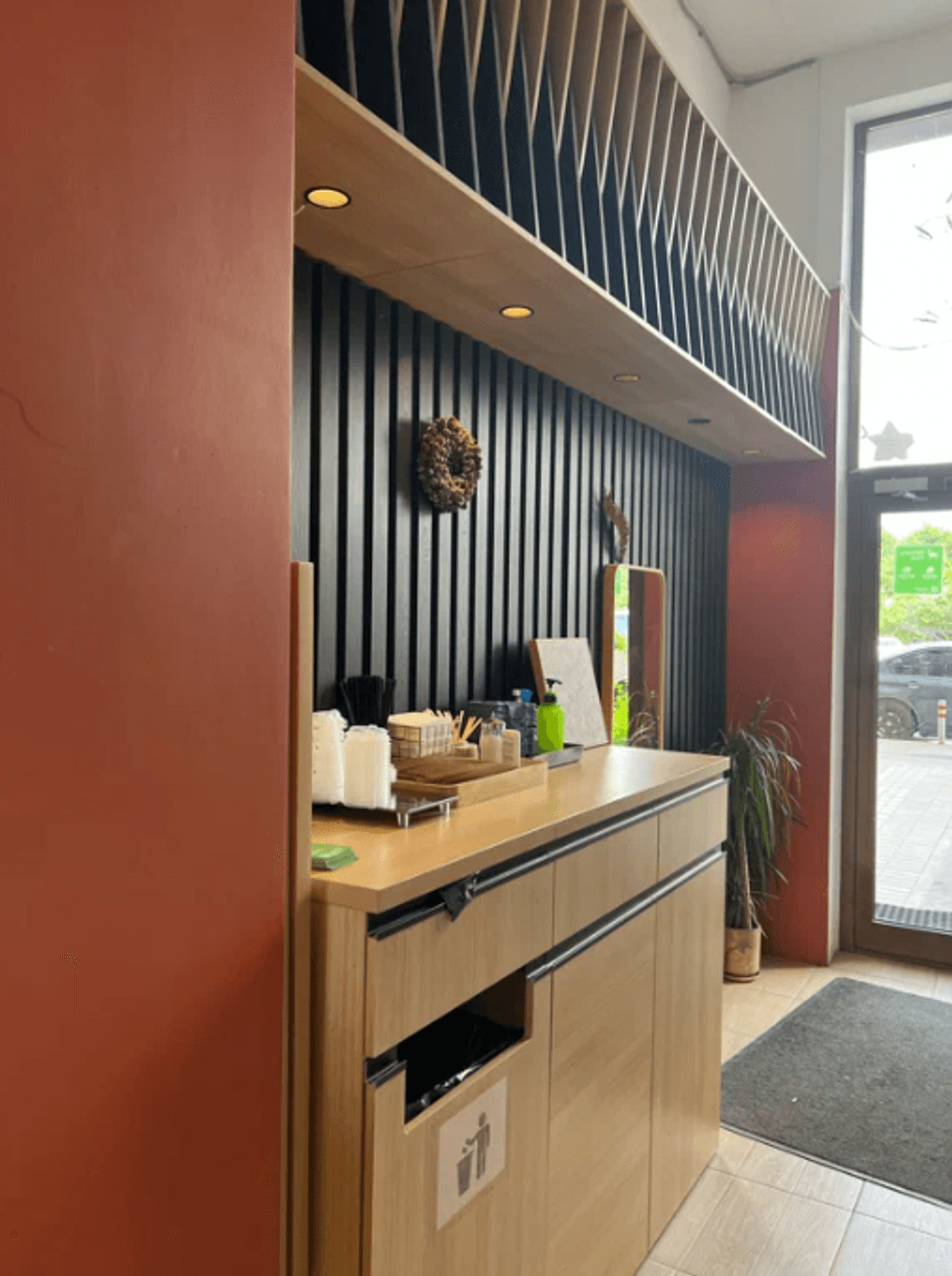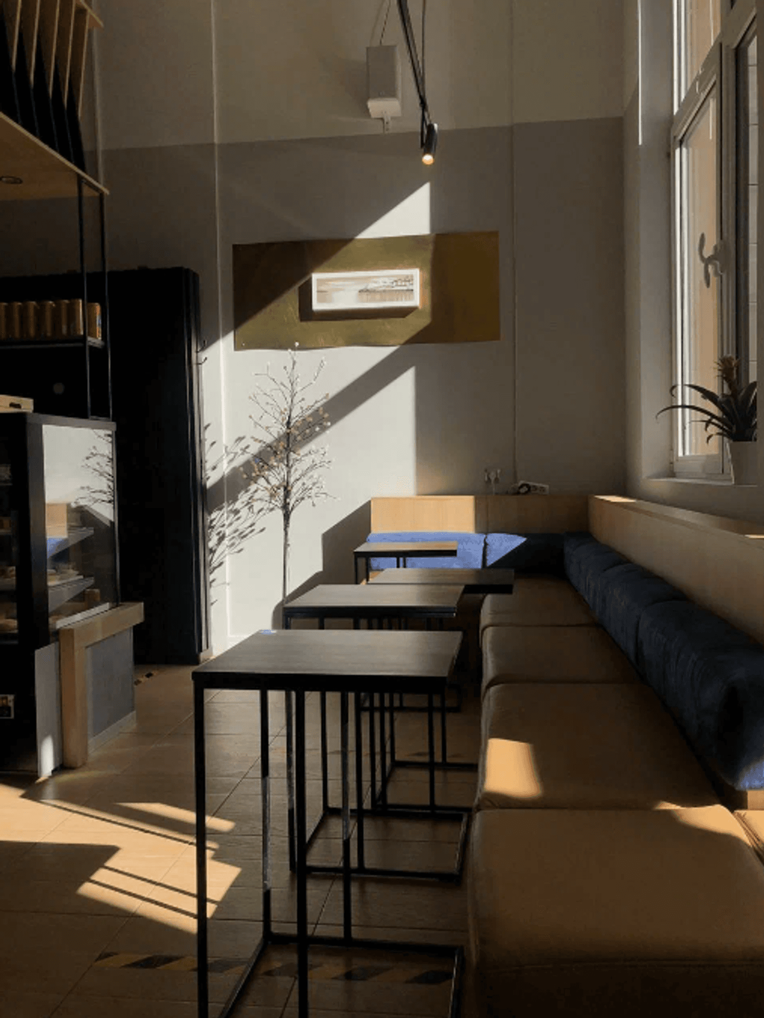 Атмосфера. Внутри простые высокие черные столы и мягкие диваны. Есть комоды со всех необходимым для вашего напитка: крышками, сахаром.