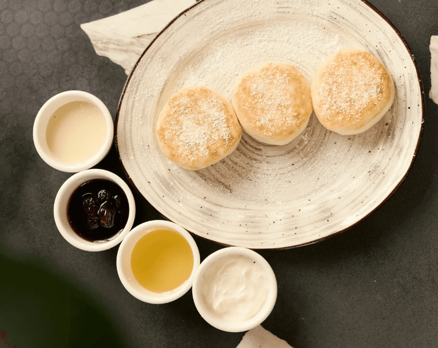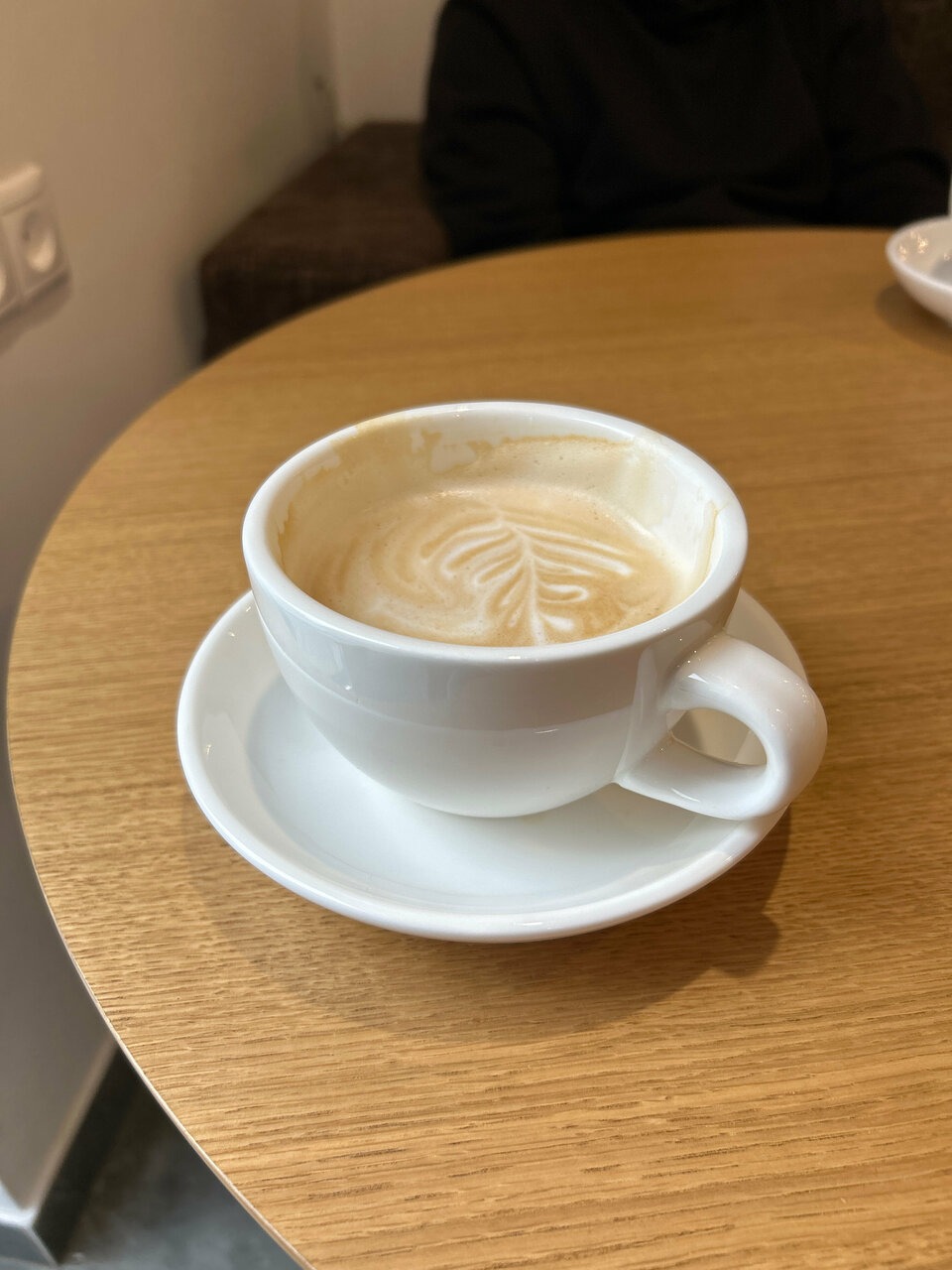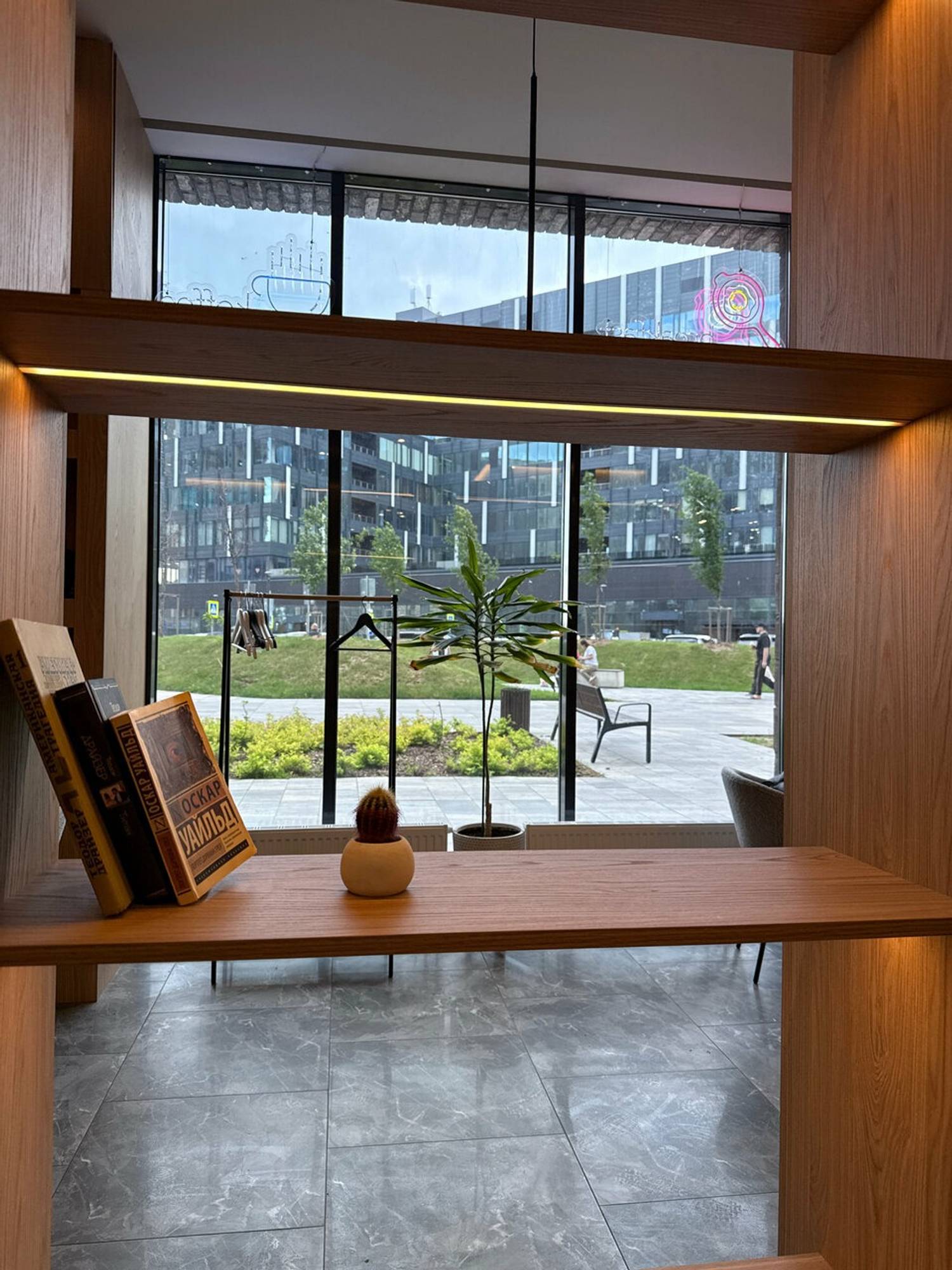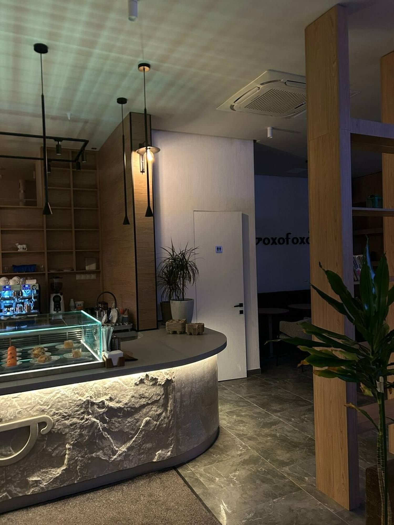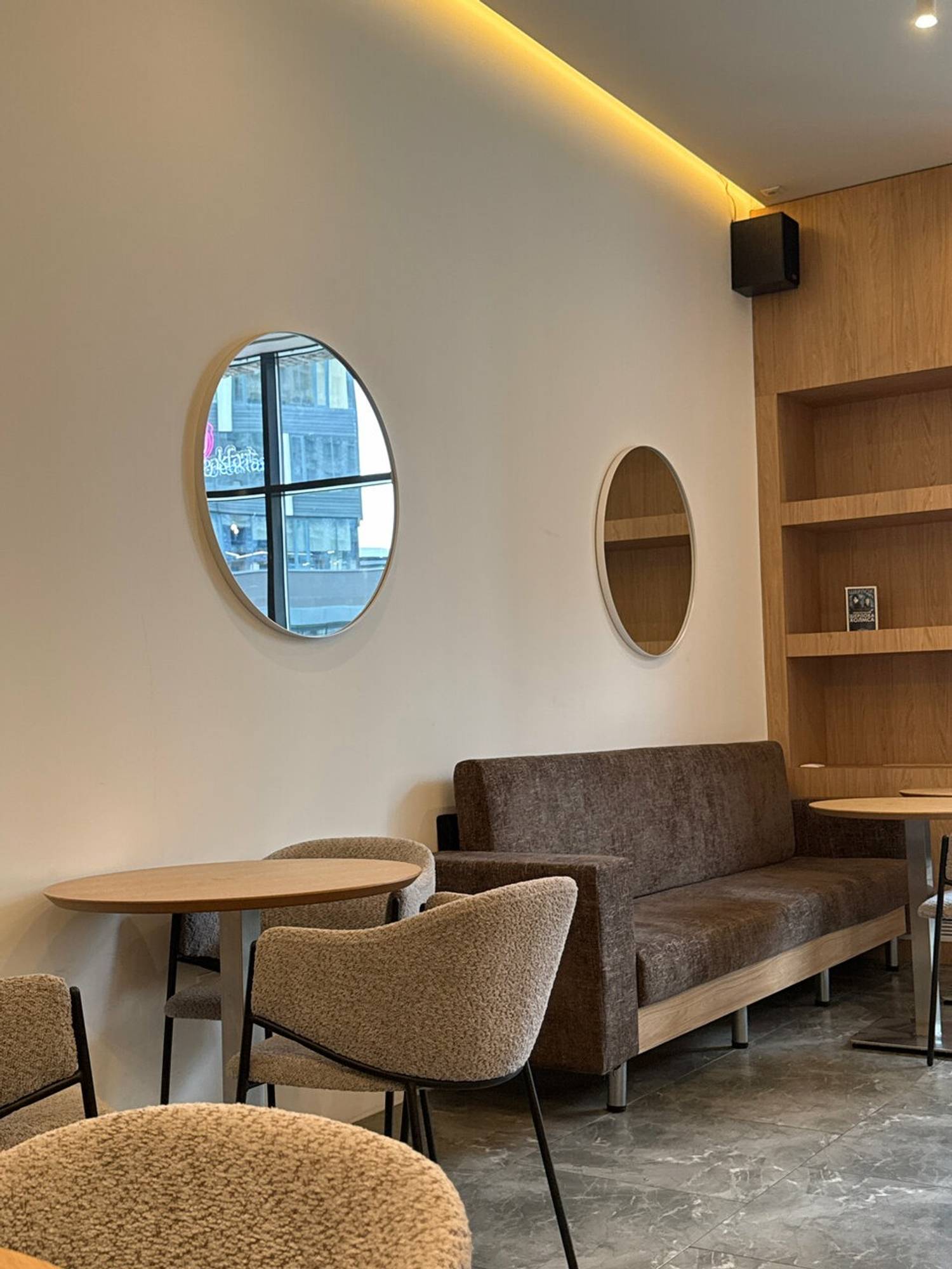 Атмосфера. Кофейня в светлых тонах с акцентом на натуральные материалы и современный дизайн. Центральным элементом служит фактурная серая стойка с мягкой подсветкой. Светлые стены украшены круглыми зеркалами и деревянными полками.