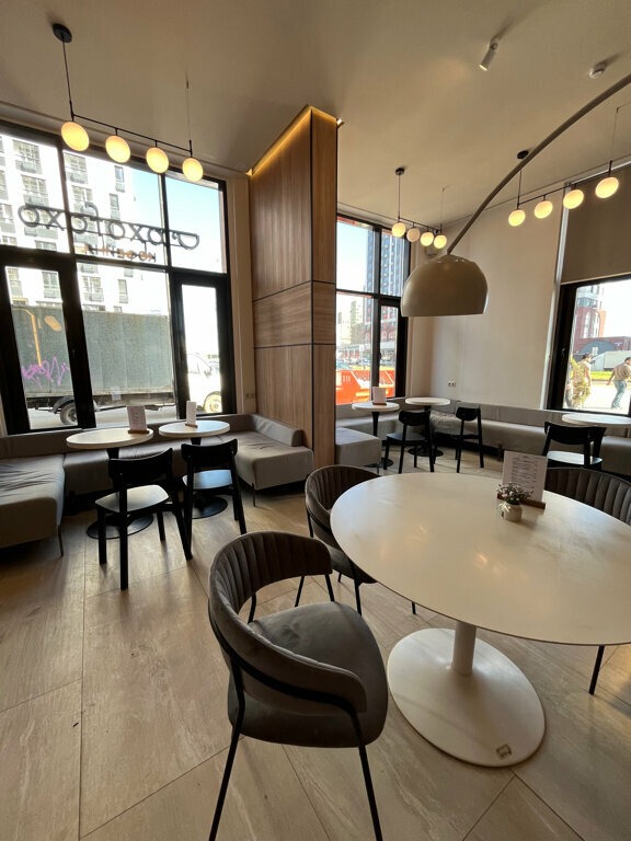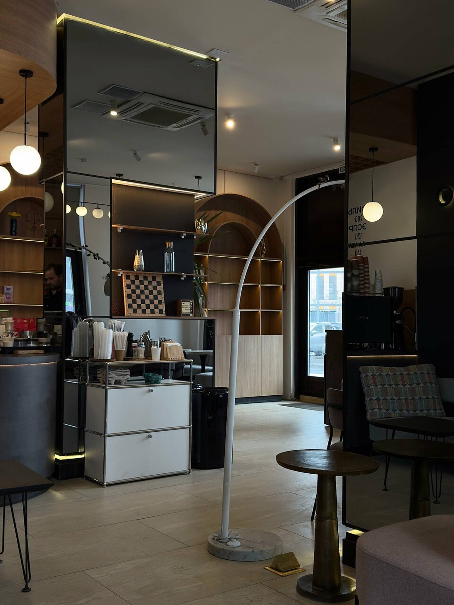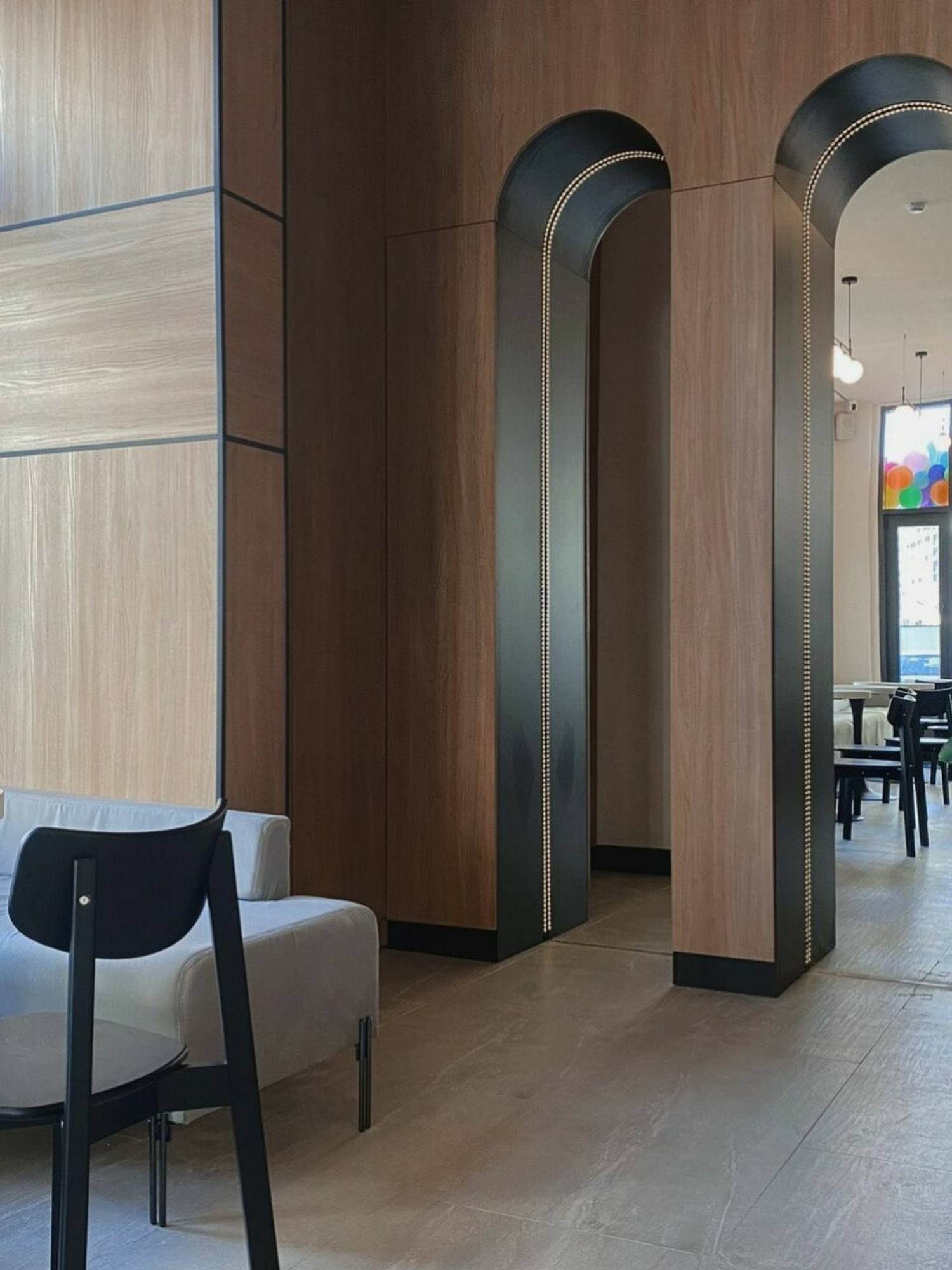 Атмосфера. Интерьер выполнен в лаконичном стиле: светлое пространство с высокими потолками визуально разделено деревянной перегородкой. Контрастную ноту вносит черная акцентная стена с подсветкой, на которой выделяется название кофейни. Изящная тонкая арка ведет в соседний зал, а белые круглые столы создают ощущение легкости и порядка.