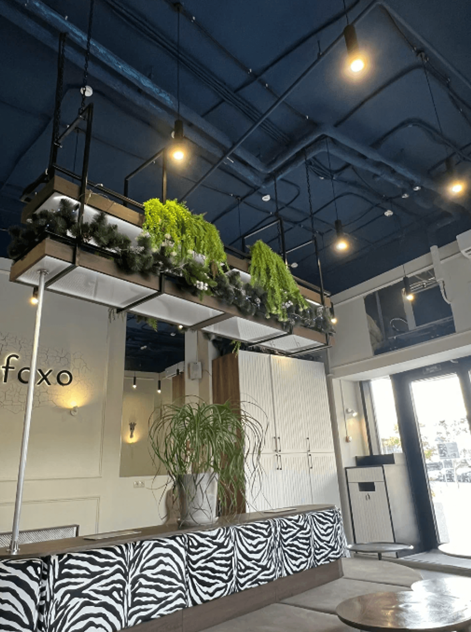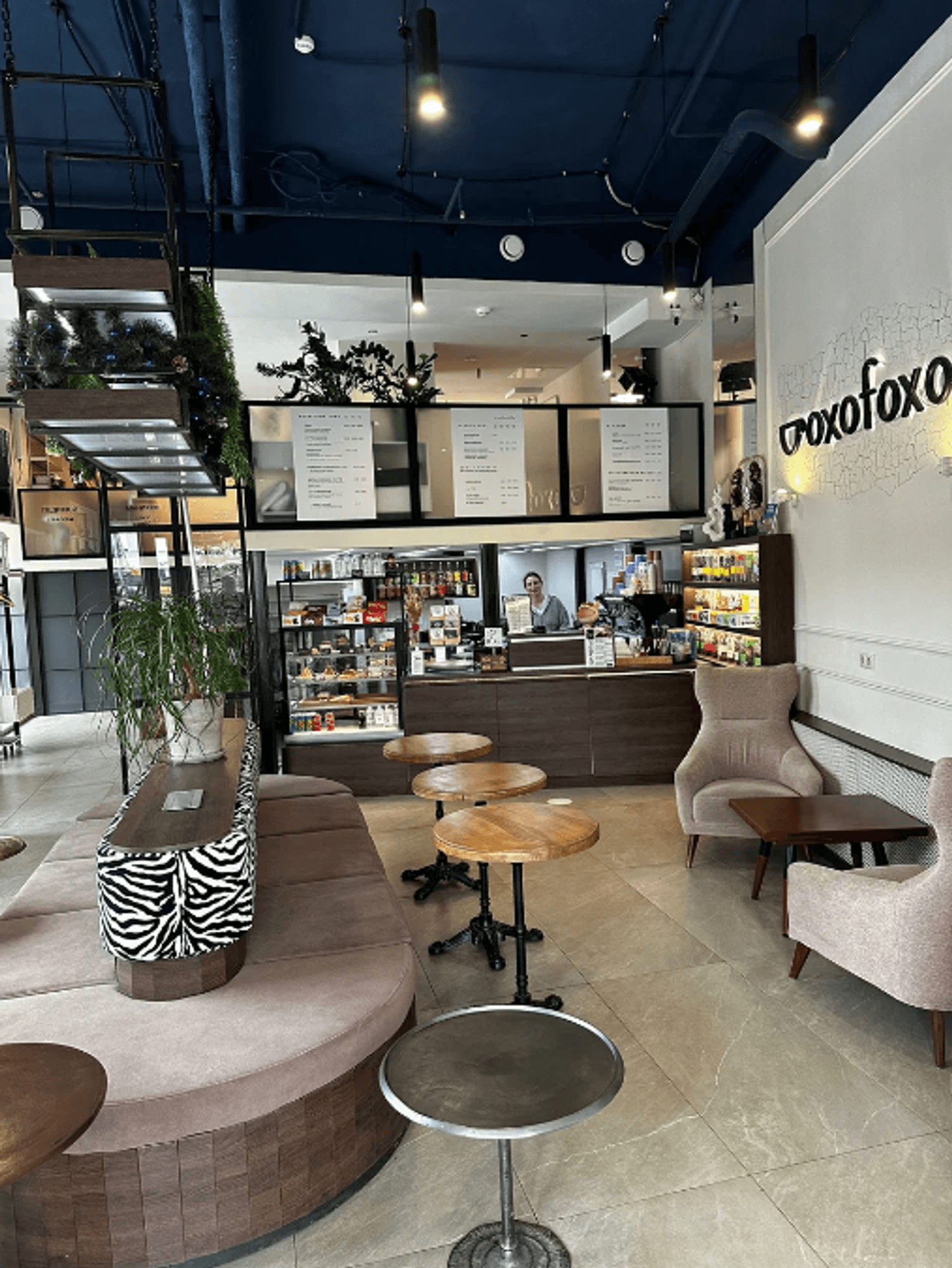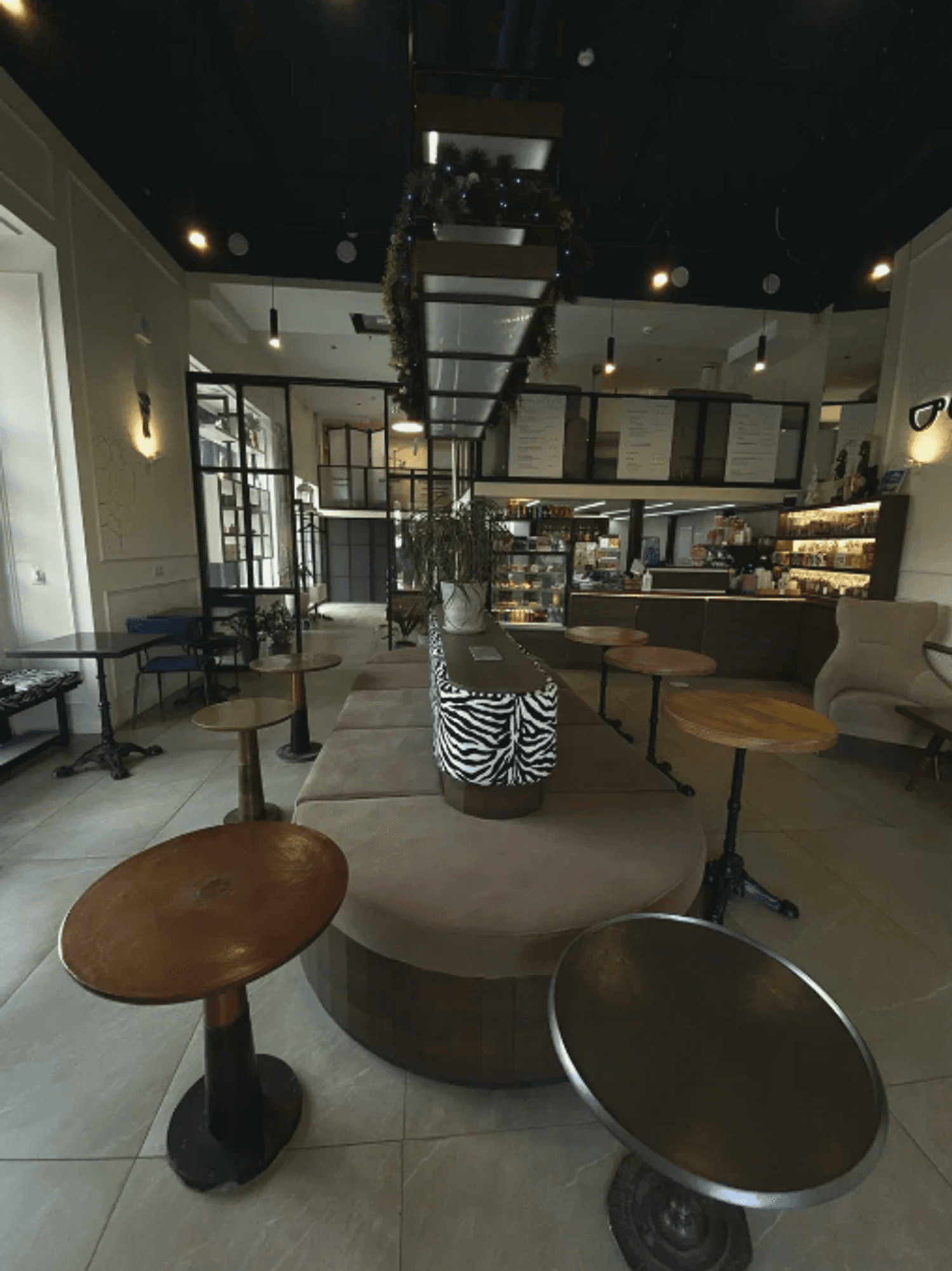 Атмосфера. Пространство в спокойных светло-коричневых тонах с яркой стеной с черными буквами названия заведения и эффектной подсветкой. Особенно стильно выглядят необычные диваны с принтом под зебру, включая круглую композицию.