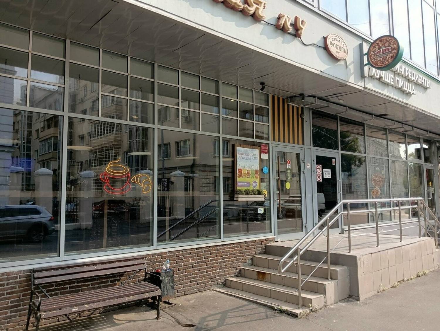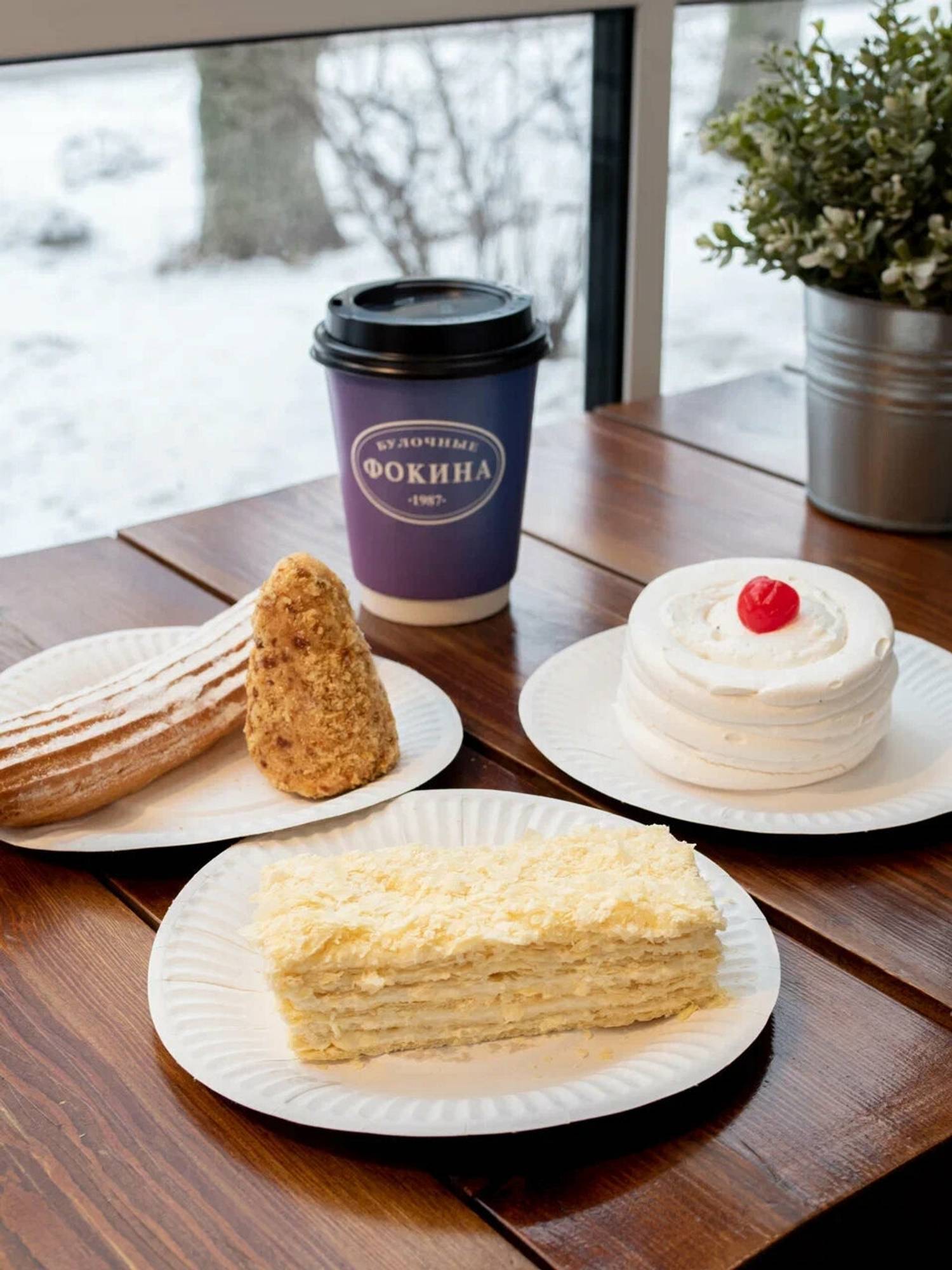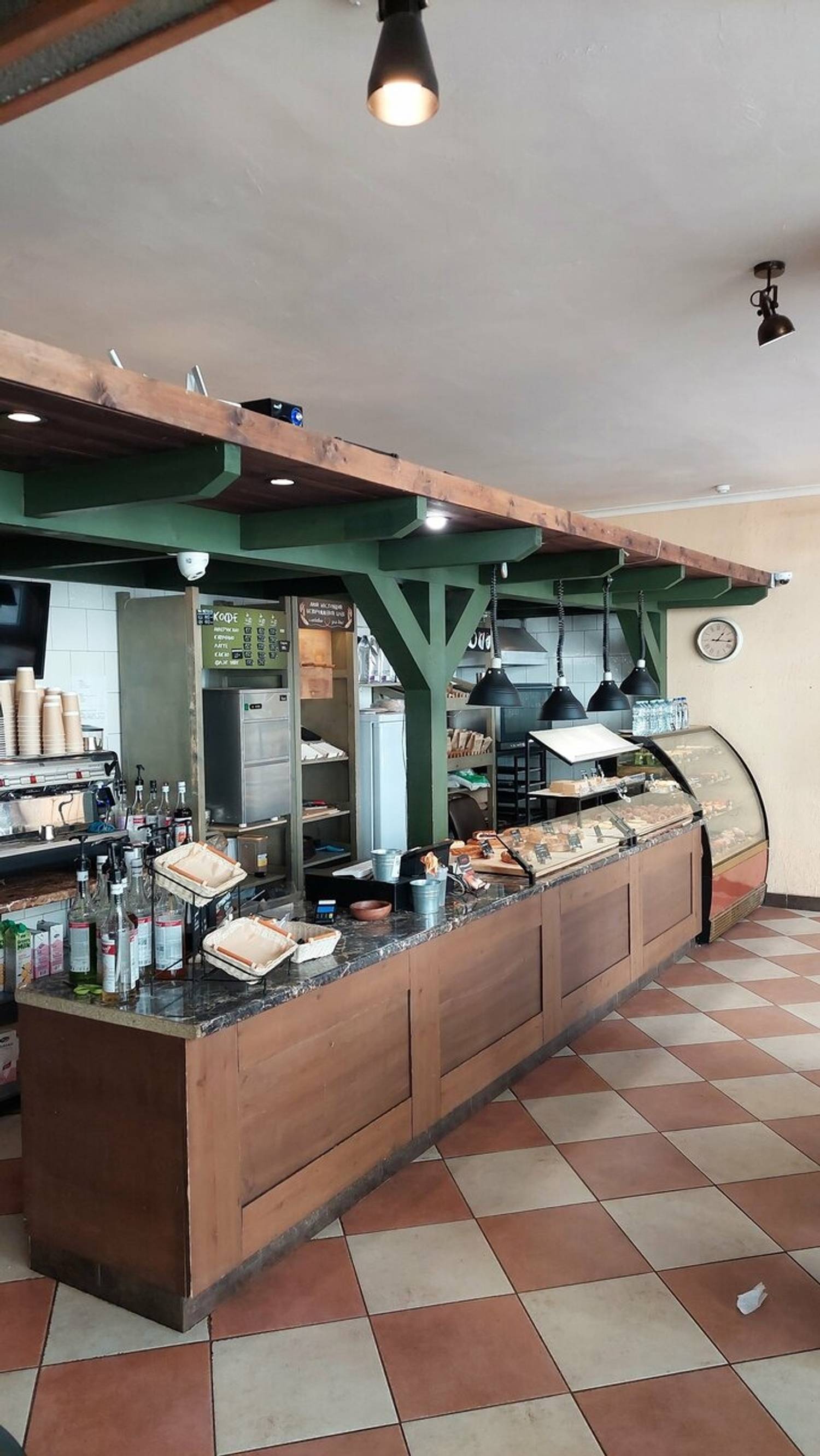 Еда и напитки. Здесь можно попробовать улитки с творогом, круассаны, пироги с капустой, творогом или курицей, а также десерты вроде торта «Манго-маракуйя». Кофейная карта включает американо, латте и капучино с возможностью взять напиток с собой.