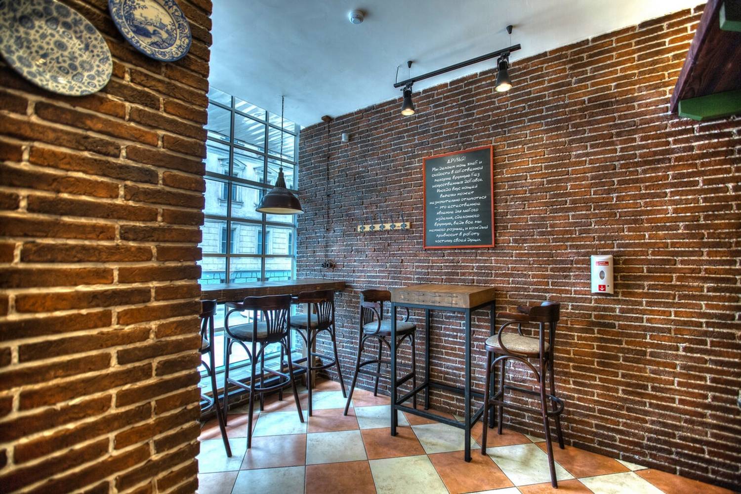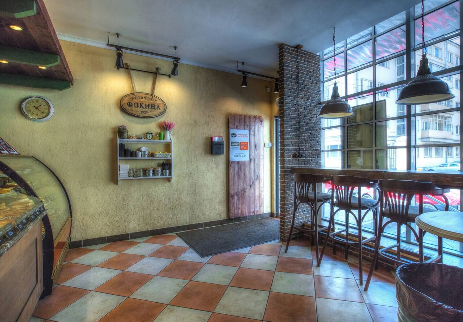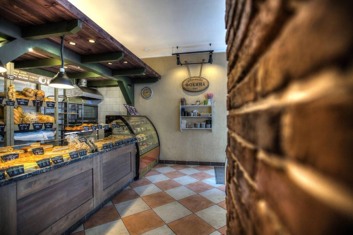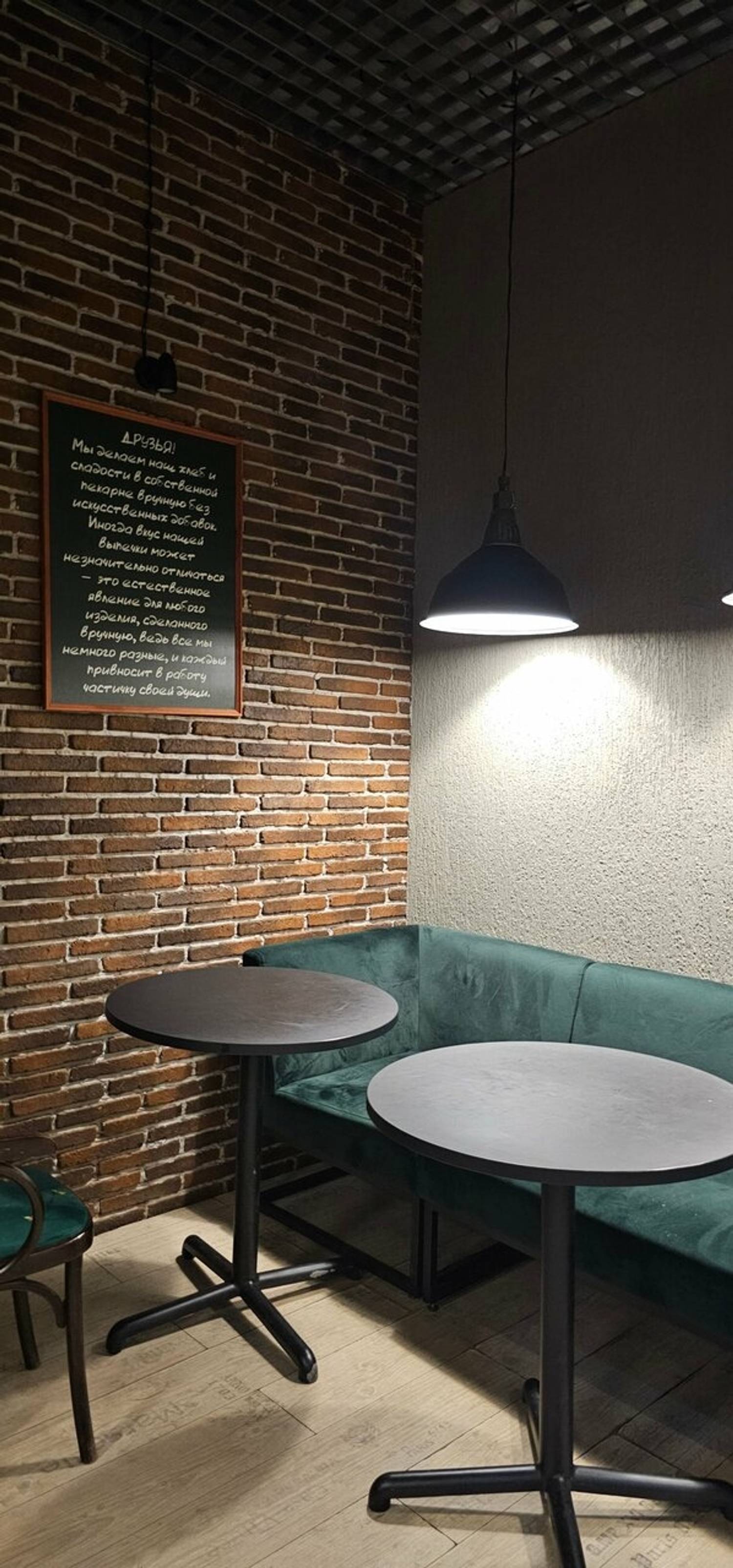 Атмосфера. Интерьер сохраняет фирменный стиль сети: кирпичная кладка, винтажные детали и уютное освещение. Венские стулья, деревянные столы и оформленные под старину витрины словно переносят гостей в атмосферу московской булочной прошлого века.