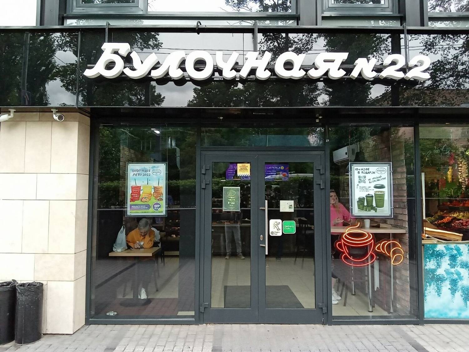 Еда и напитки. В ассортименте — круассаны, булочки с сыром и корицей, сладкие пироги с брусникой и яблоком, а также сытные варианты с ветчиной и курицей. Из десертов — чизкейк «Нью-Йорк», рулеты «Фисташка-малина» и «Захер». Напитки включают классический американо, латте и капучино в трех разных объемах.