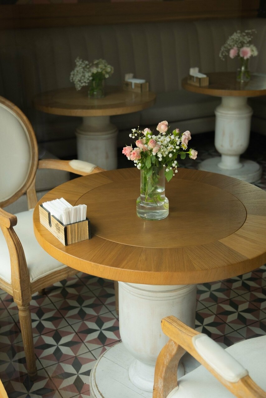 Атмосфера. Интерьер в сдержанной палитре серых, бежевых и пыльно-розовых тонов создает стильную и спокойную обстановку. Здесь уделено много внимания акцентам: деревянное панно на стене, декоративный камин и мягкие стулья. Все это формирует уютное и продуманное заведение, где будет комфортно всей семье благодаря детской комнате, расположенной на втором этаже.