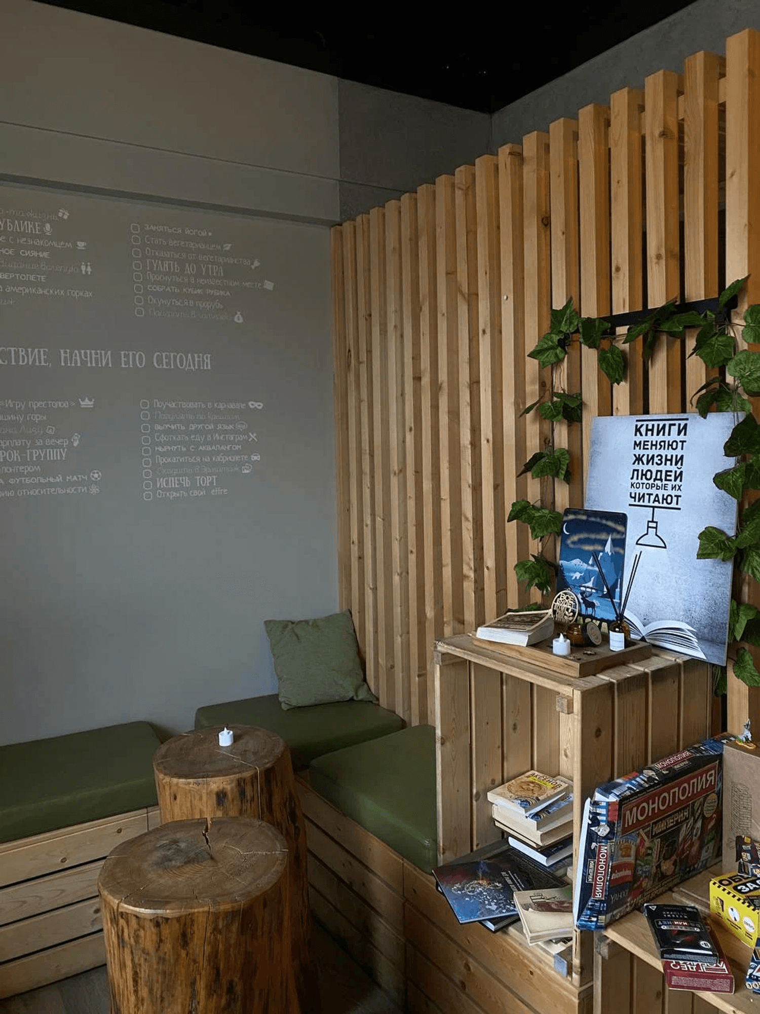 Атмосфера. Пространство оформлено в теплых натуральных тонах: мягкие деревянные скамейки и зоны с подушками создают ощущение домашнего уюта, а посадка на подоконнике с декоративными подушками добавляет камерности. Над барной стойкой расположен выразительный декоративный элемент, стилизованный под горный рельеф.