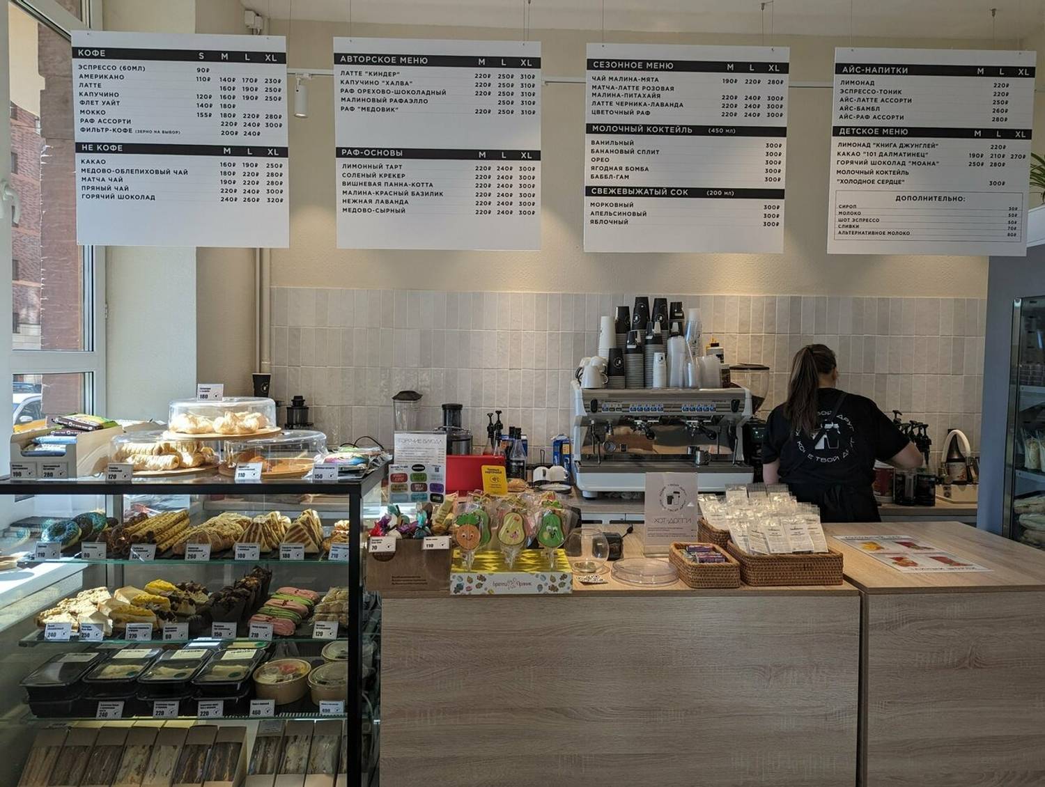 Еда и напитки. В меню кофе: эспрессо, американо, капучино, а также авторские варианты, например, орехово-шоколадный раф или матча-латте малина-питахайя. Среди сезонных напитков есть глинтвейн, какао чили-апельсин и кленовый раф.