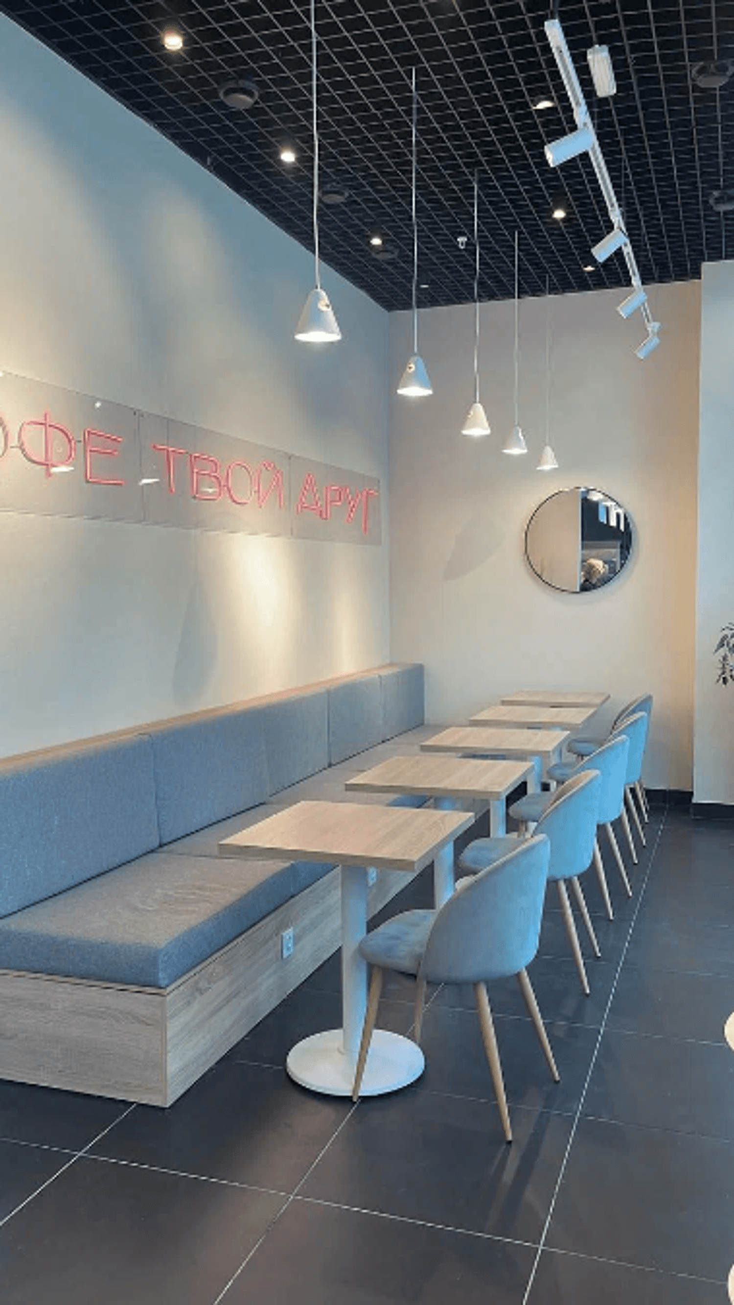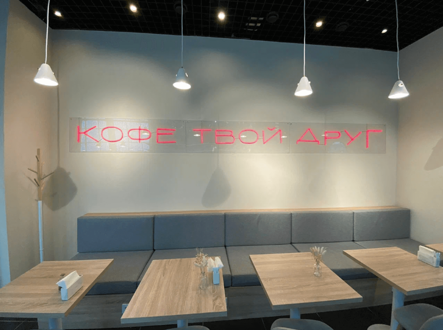 Атмосфера. Небольшая кофейня с неоновой красной надписью «кофе твой друг», серыми диванами, деревянной мебелью и мягкими серыми стульями.
