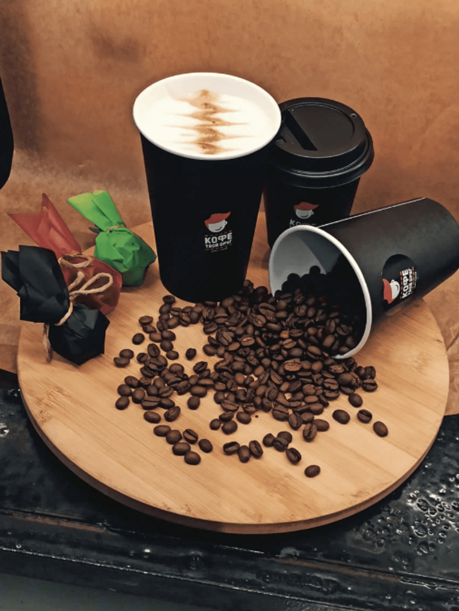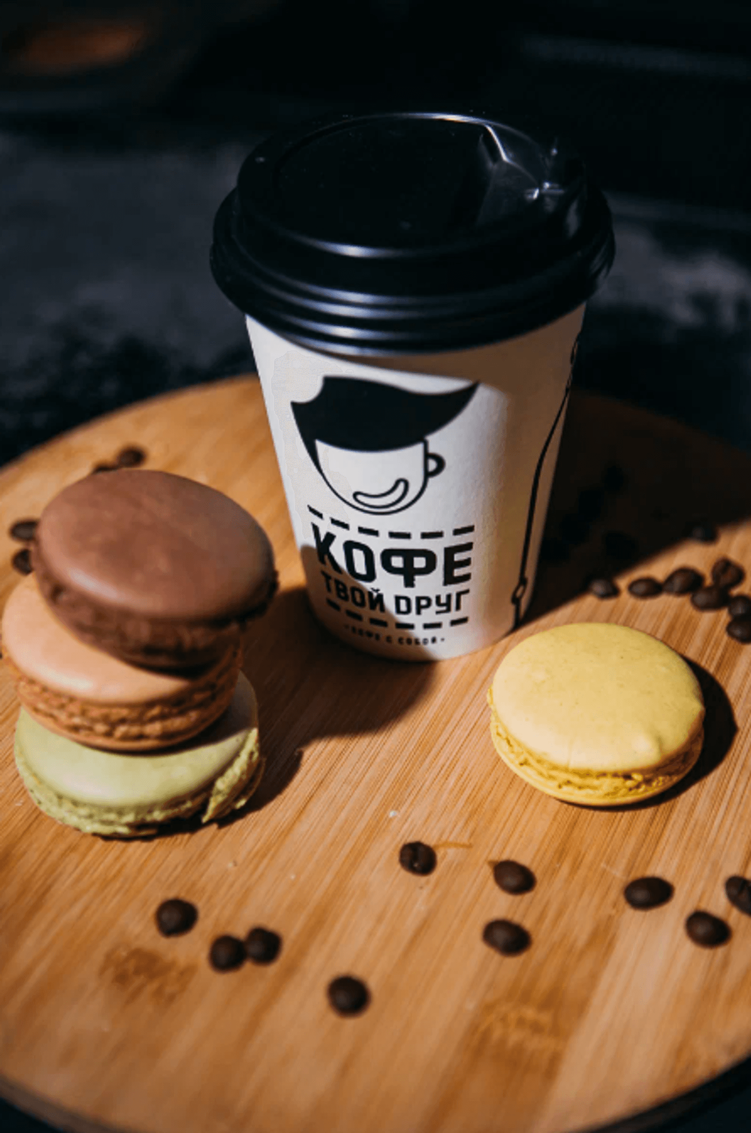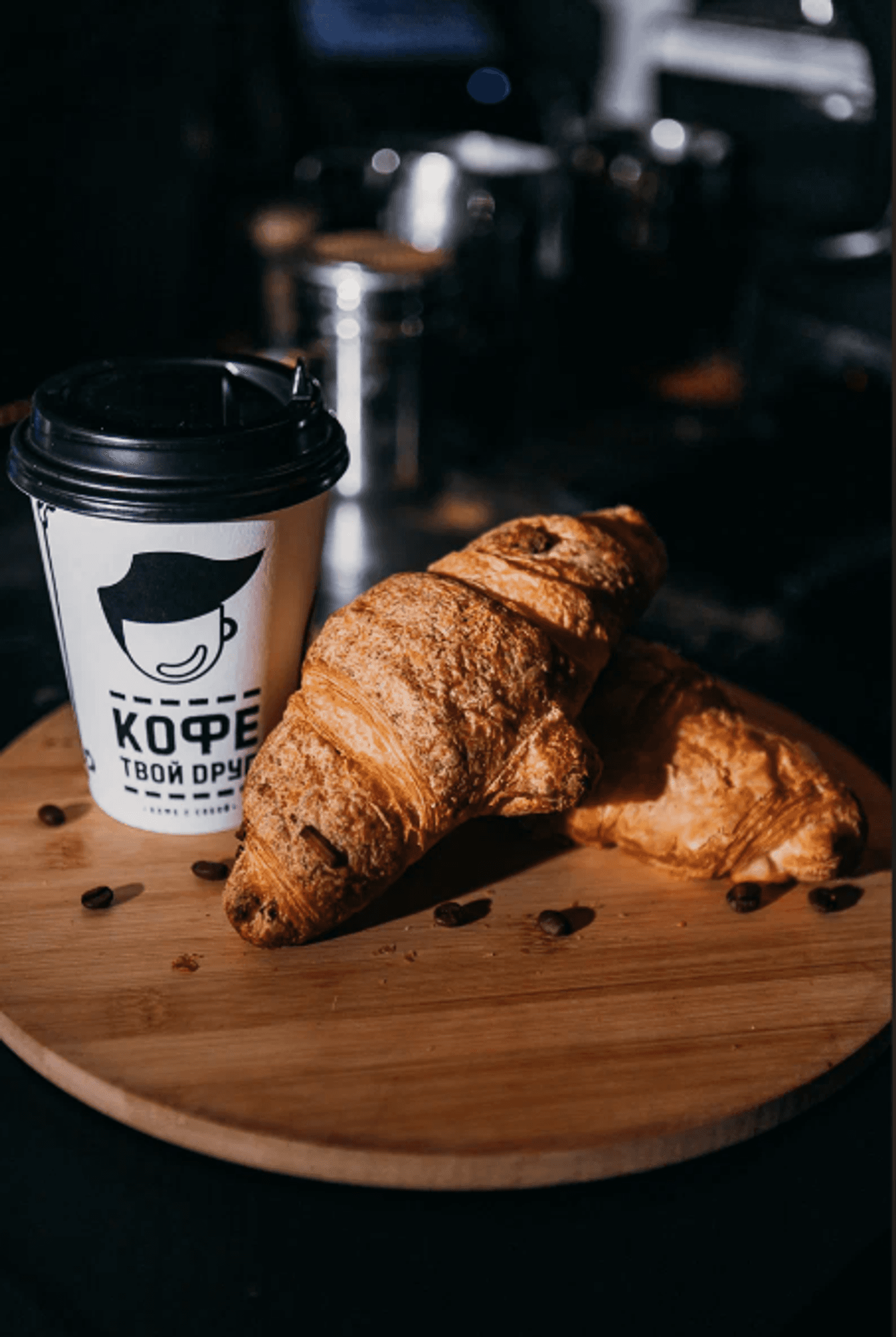 Атмосфера. Небольшая точка в черно-белом стиле с названием сети. Здесь можно взять кофе и выпечку с собой.