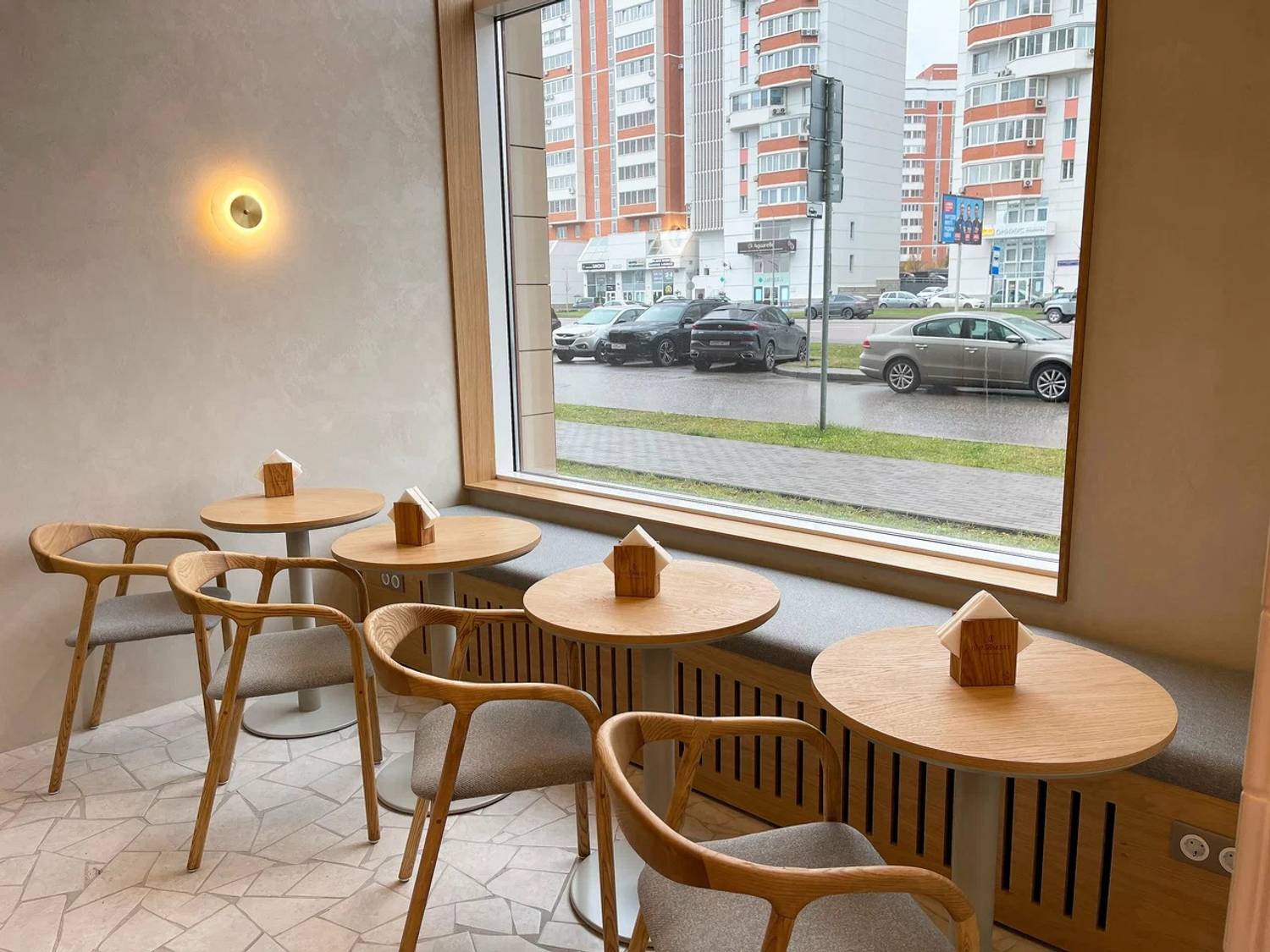 Атмосфера. Лаконичный и теплый интерьер в индустриальном стиле: у окна расположены деревянные столы и стулья. У стойки заказа — элегантная надпись золотыми буквами.