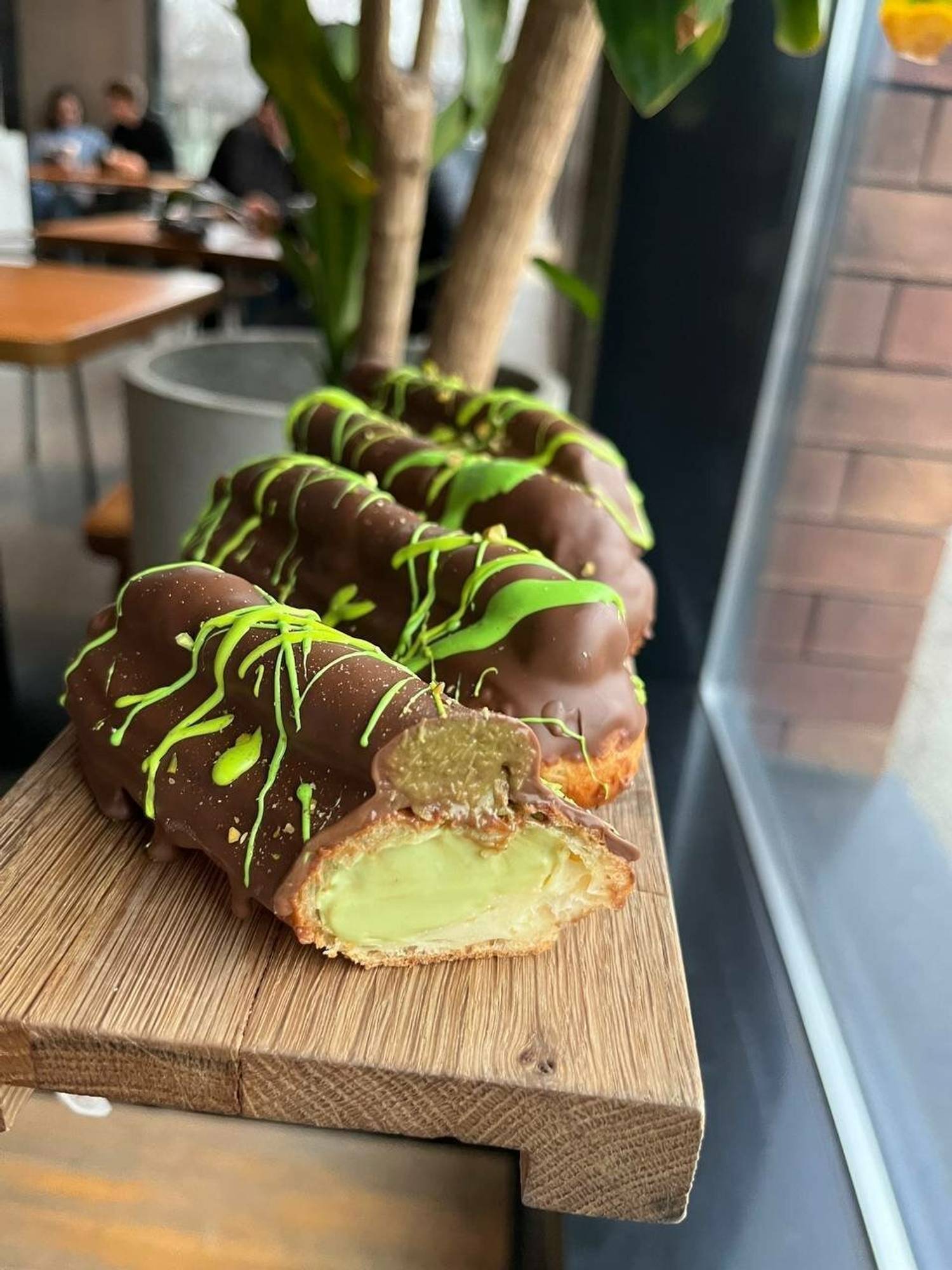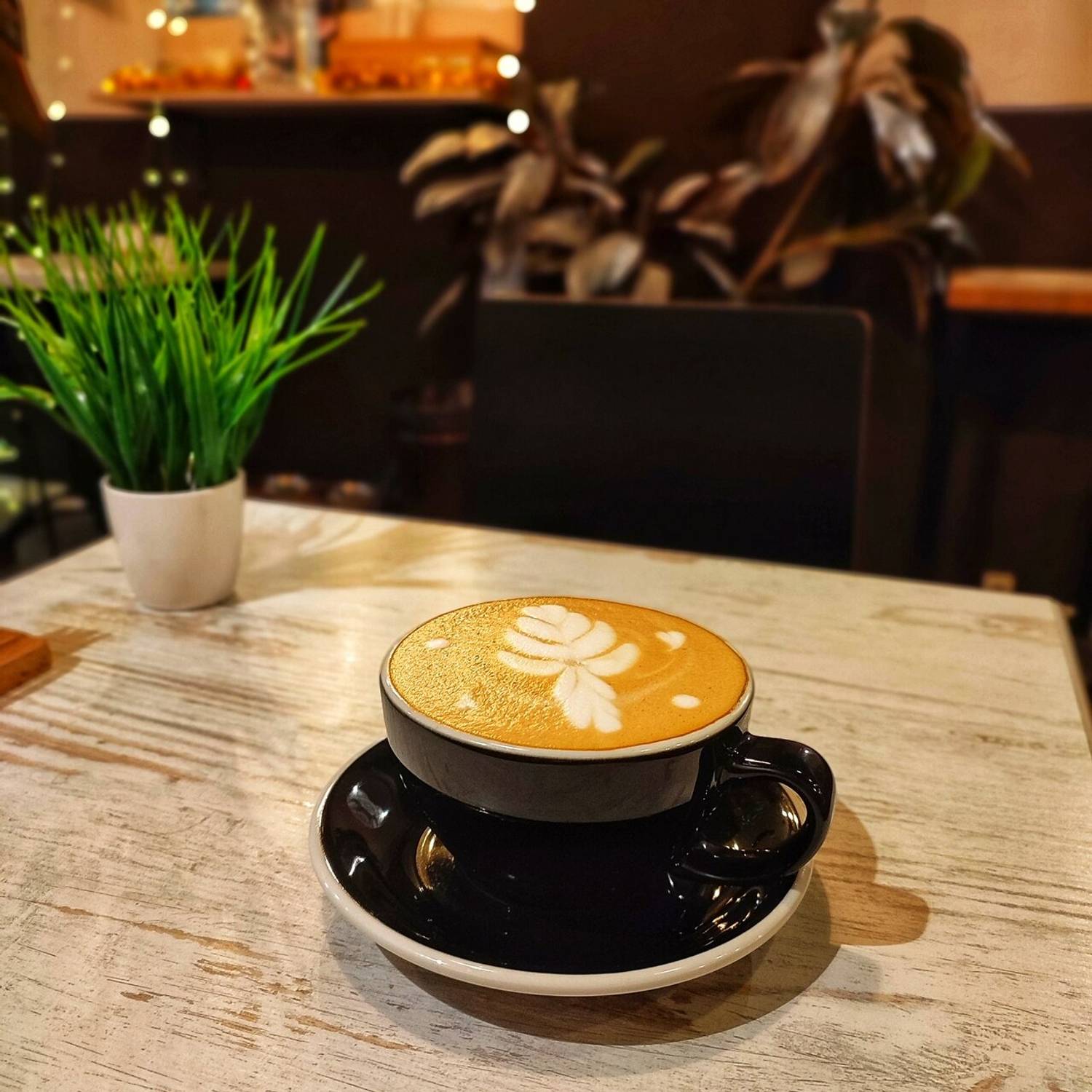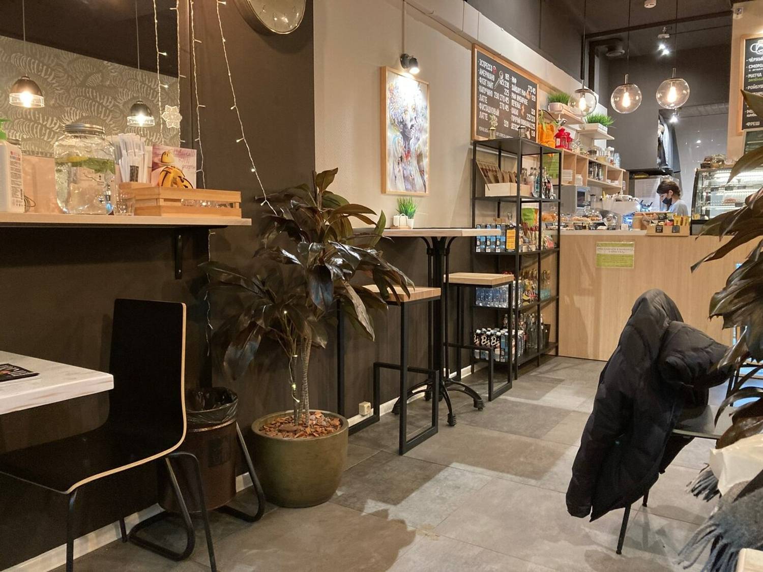 Атмосфера. Здесь светлая деревянная стойка, черные металлические стеллажи с батончиками и уютные растения в кадках создают гармоничную обстановку. Это дог-френдли кофейня.