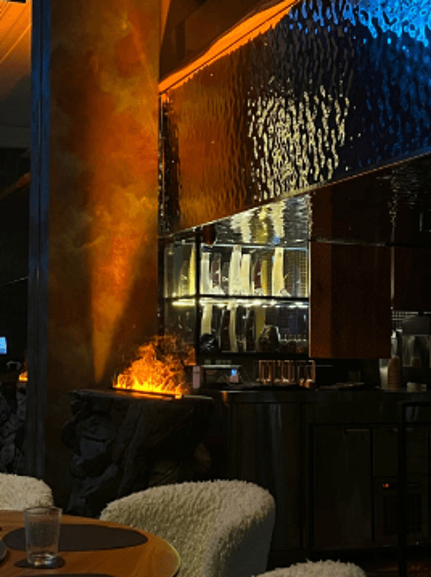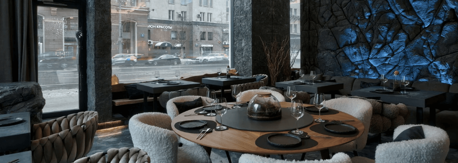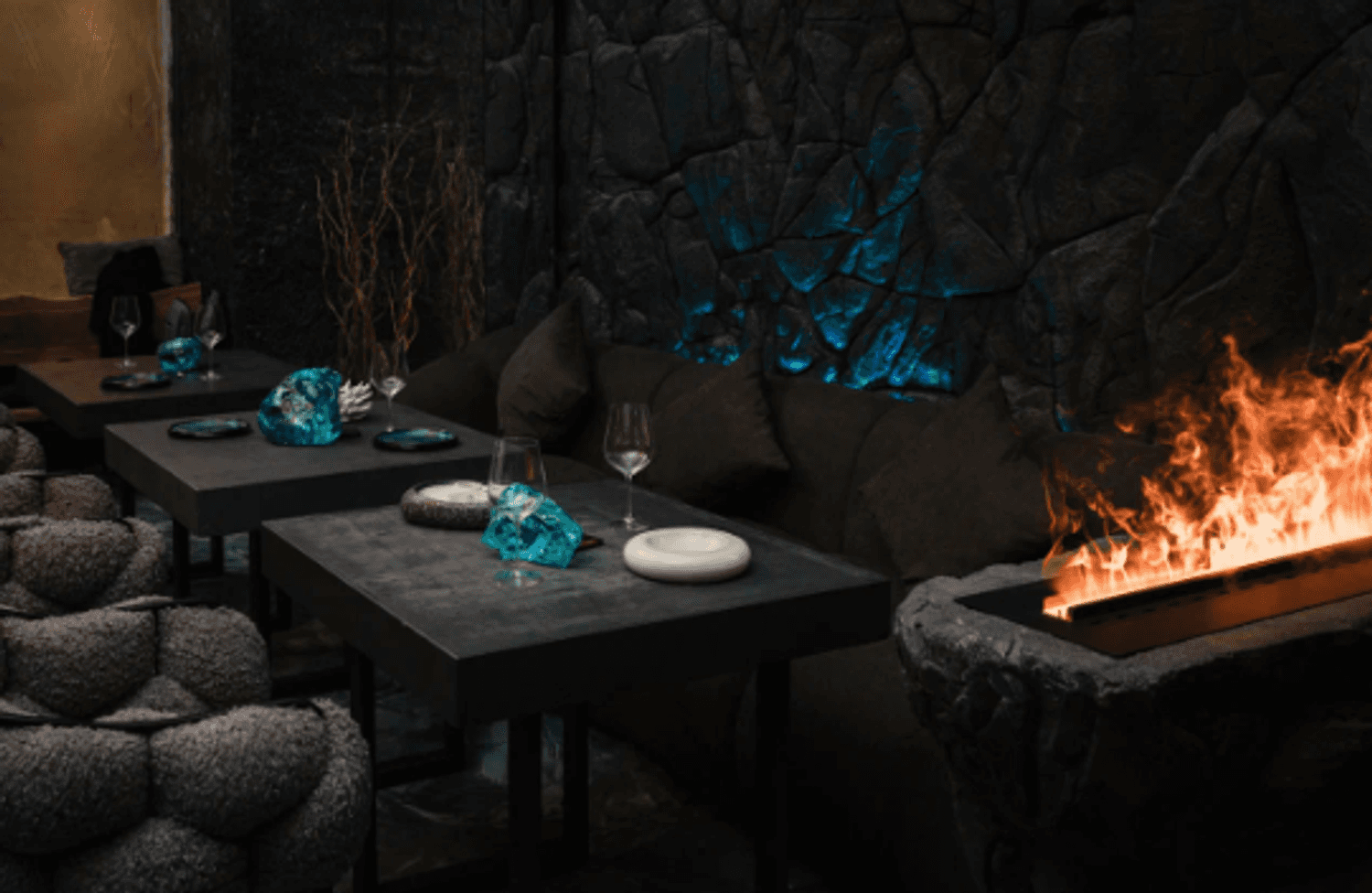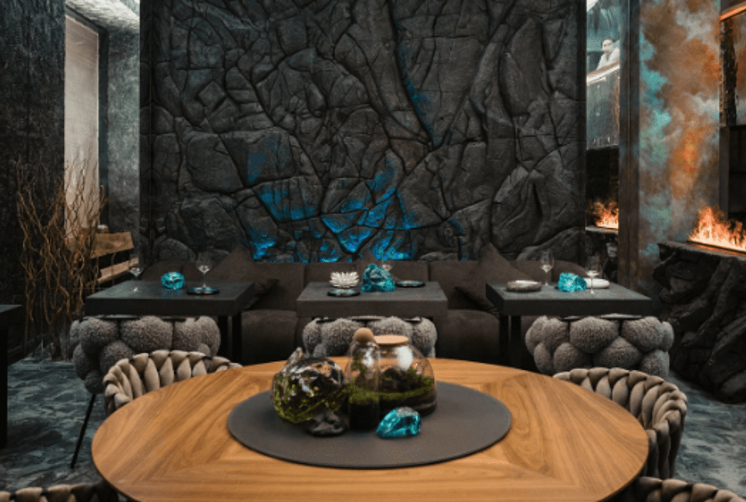 Внутри — темные стены, подсвеченные текстуры камня, кристаллы, легкий дым, языки огня в камине. Интерьер собран на стыке природы и фантазии: северные мотивы, мягкий свет, акцент на детали. Пространство делится на зоны — можно выбрать укромный уголок или устроиться ближе к бару.