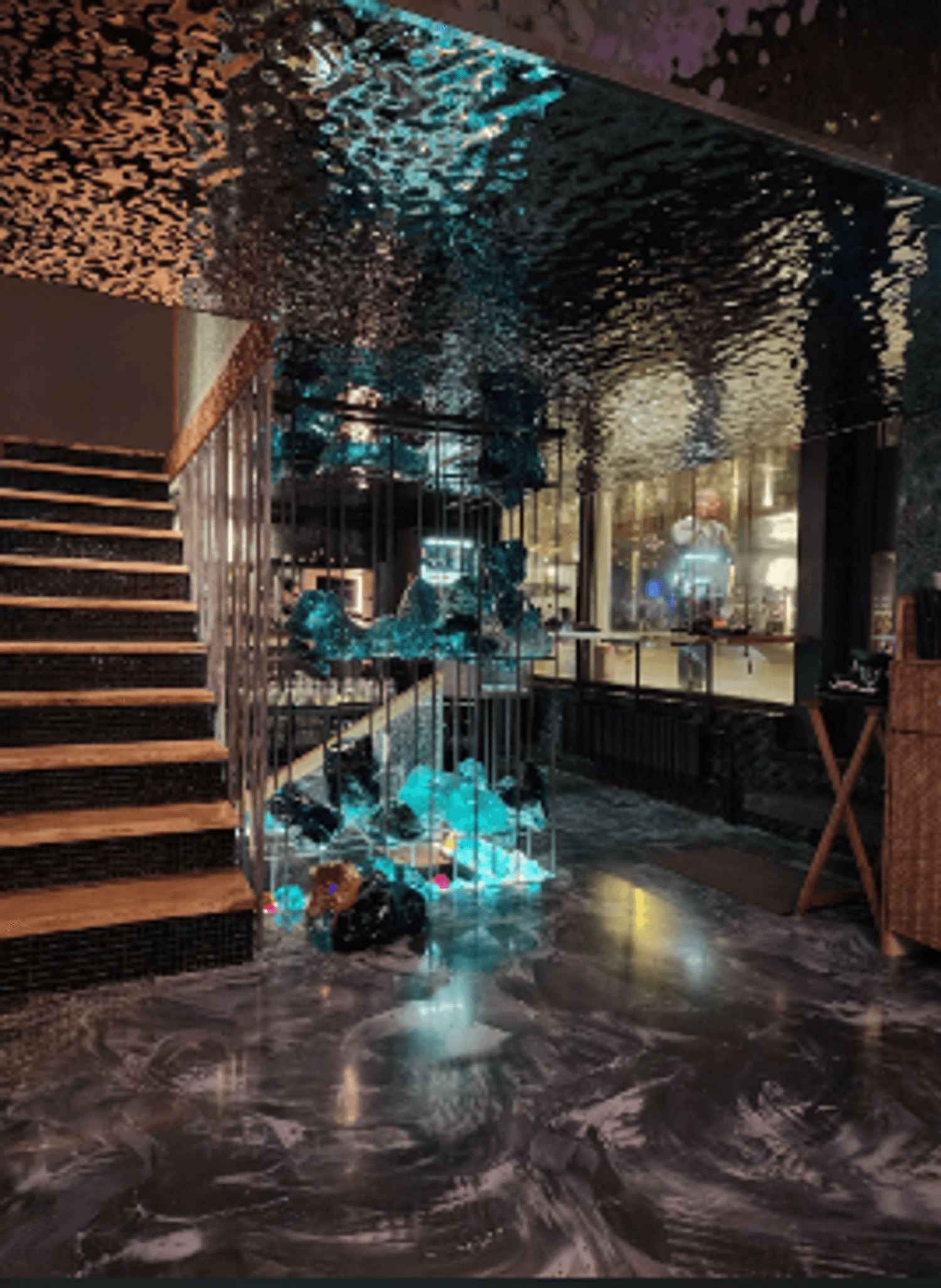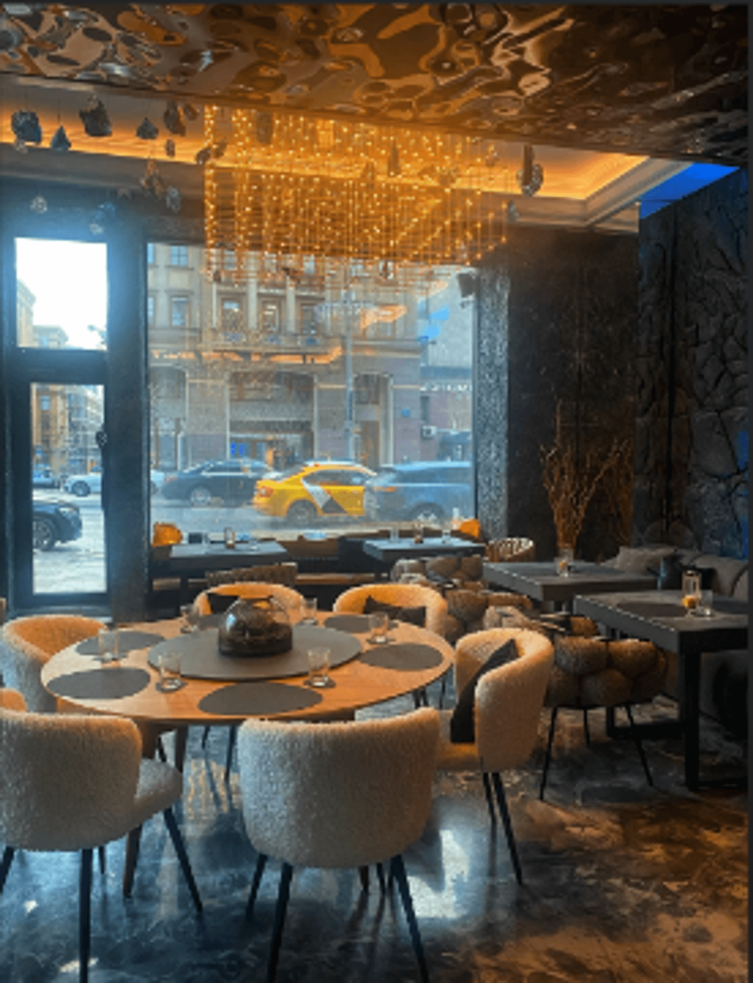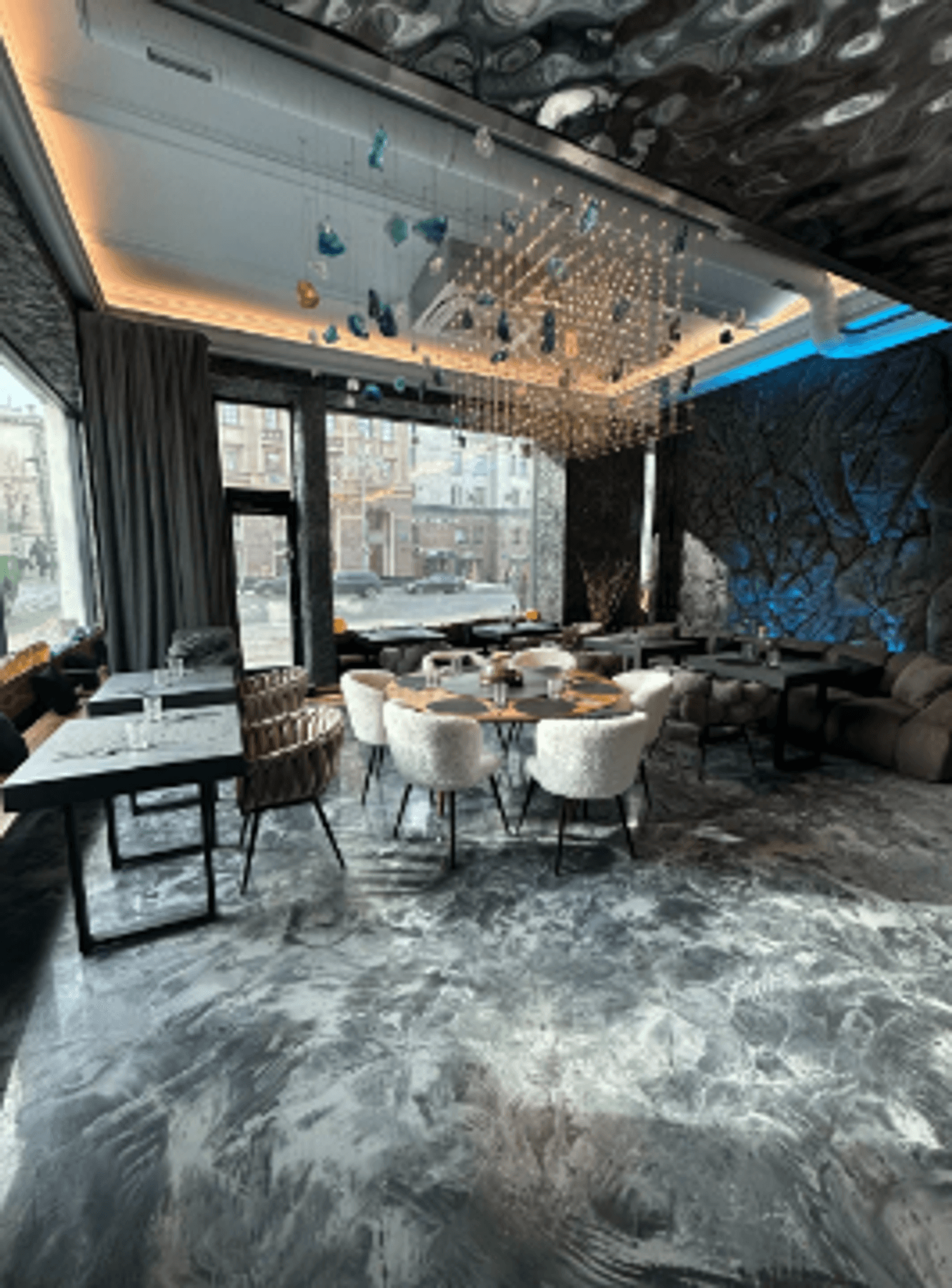 Внутри — темные стены, подсвеченные текстуры камня, кристаллы, легкий дым, языки огня в камине. Интерьер собран на стыке природы и фантазии: северные мотивы, мягкий свет, акцент на детали. Пространство делится на зоны — можно выбрать укромный уголок или устроиться ближе к бару.