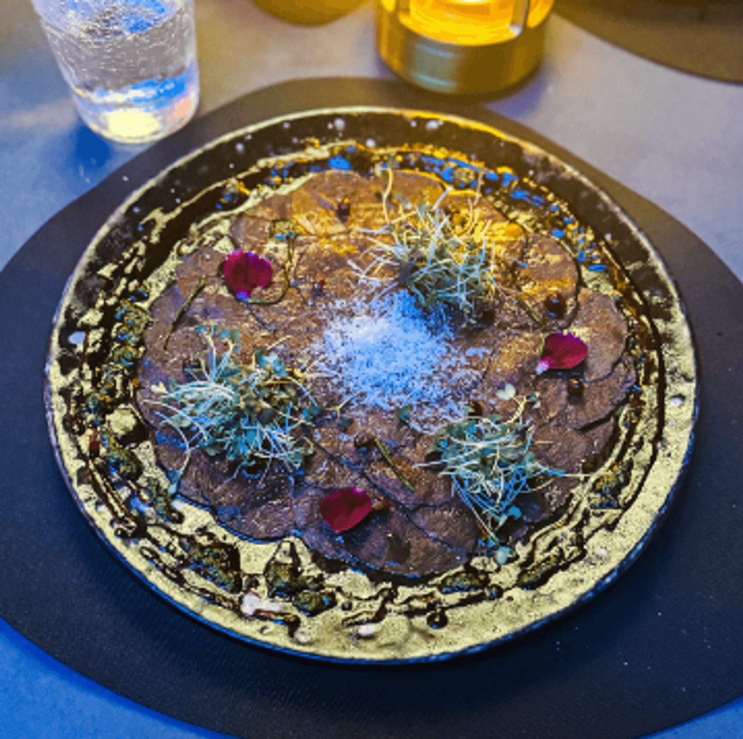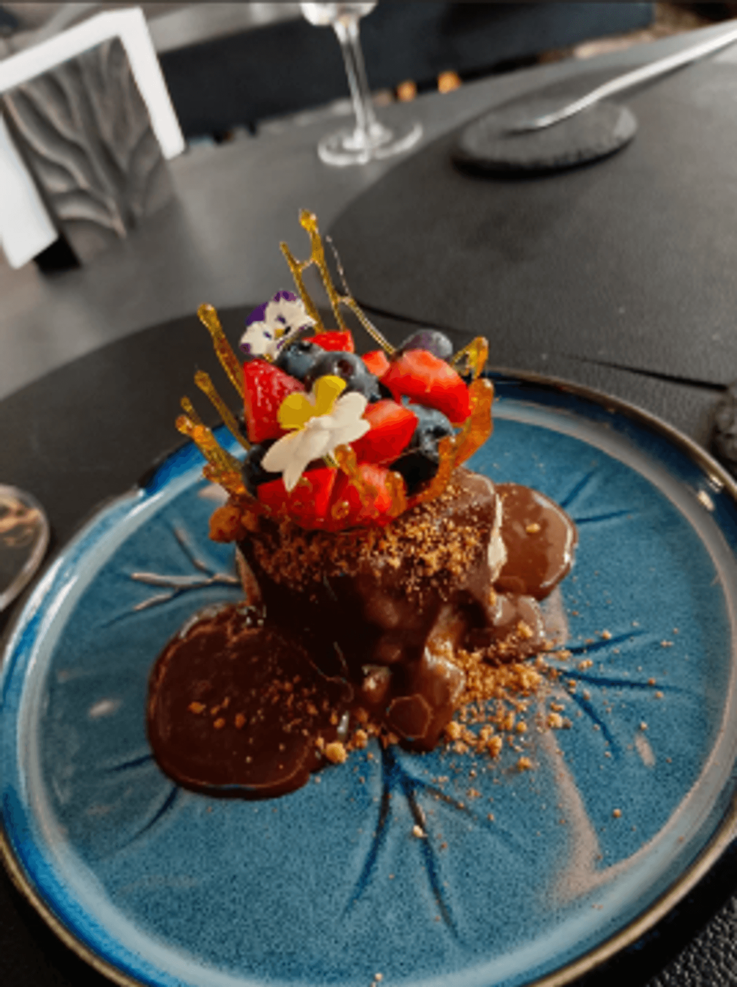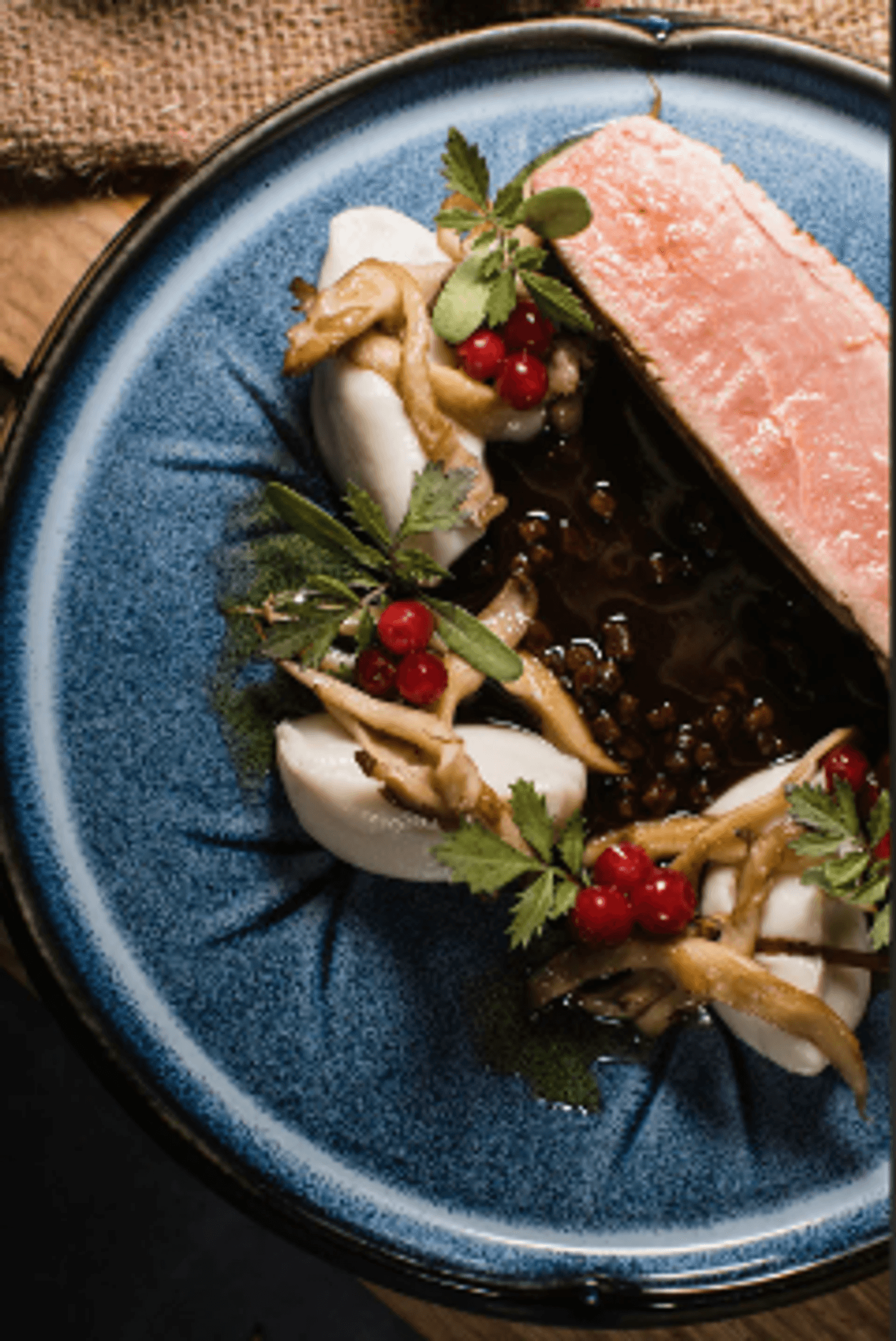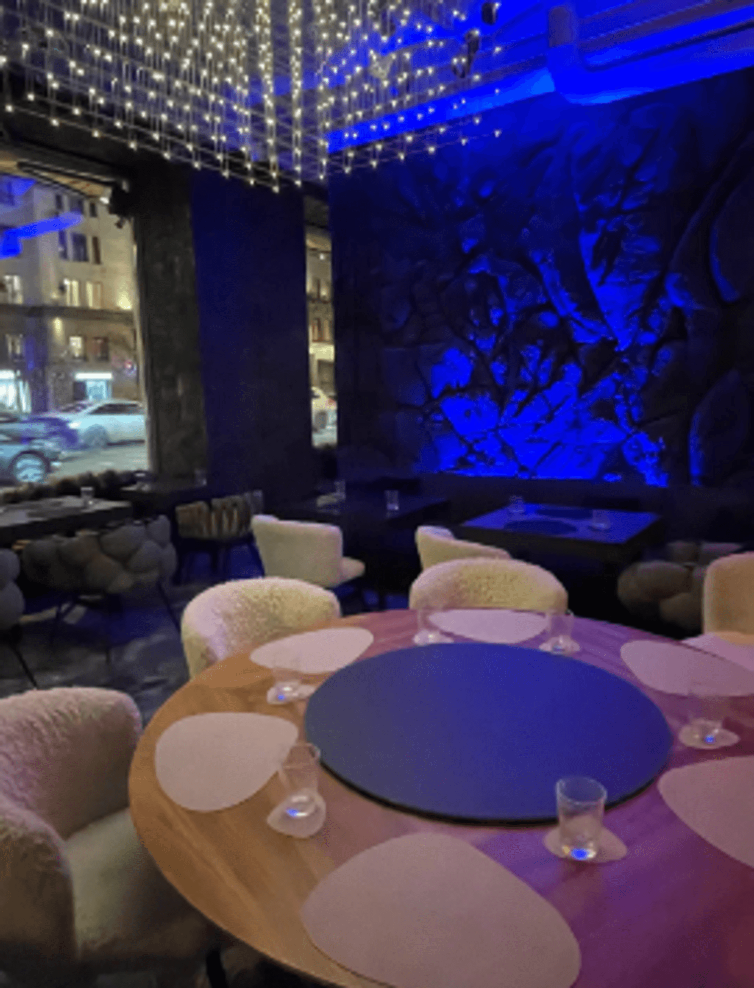 Внутри — темные стены, подсвеченные текстуры камня, кристаллы, легкий дым, языки огня в камине. Интерьер собран на стыке природы и фантазии: северные мотивы, мягкий свет, акцент на детали. Пространство делится на зоны — можно выбрать укромный уголок или устроиться ближе к бару.