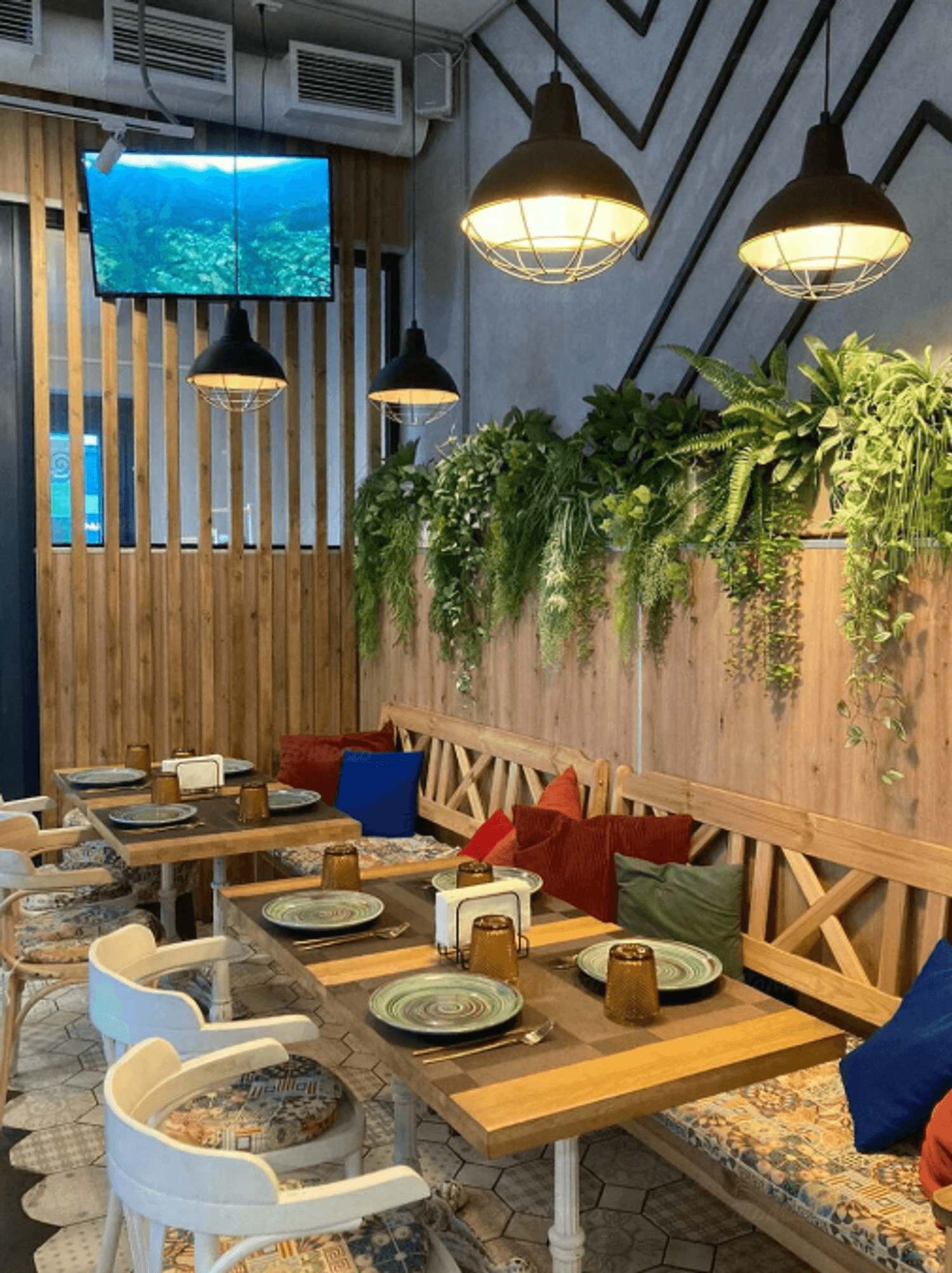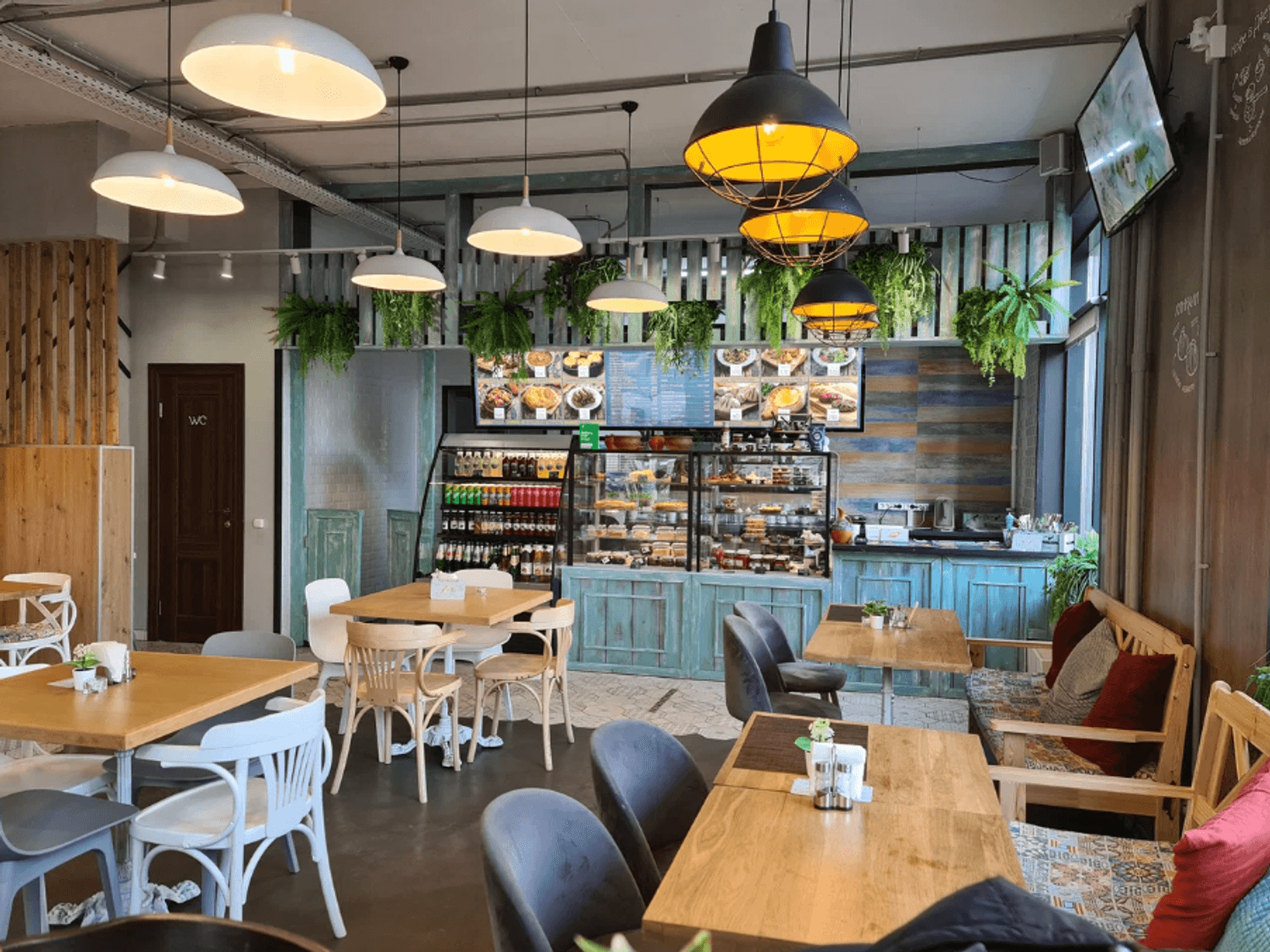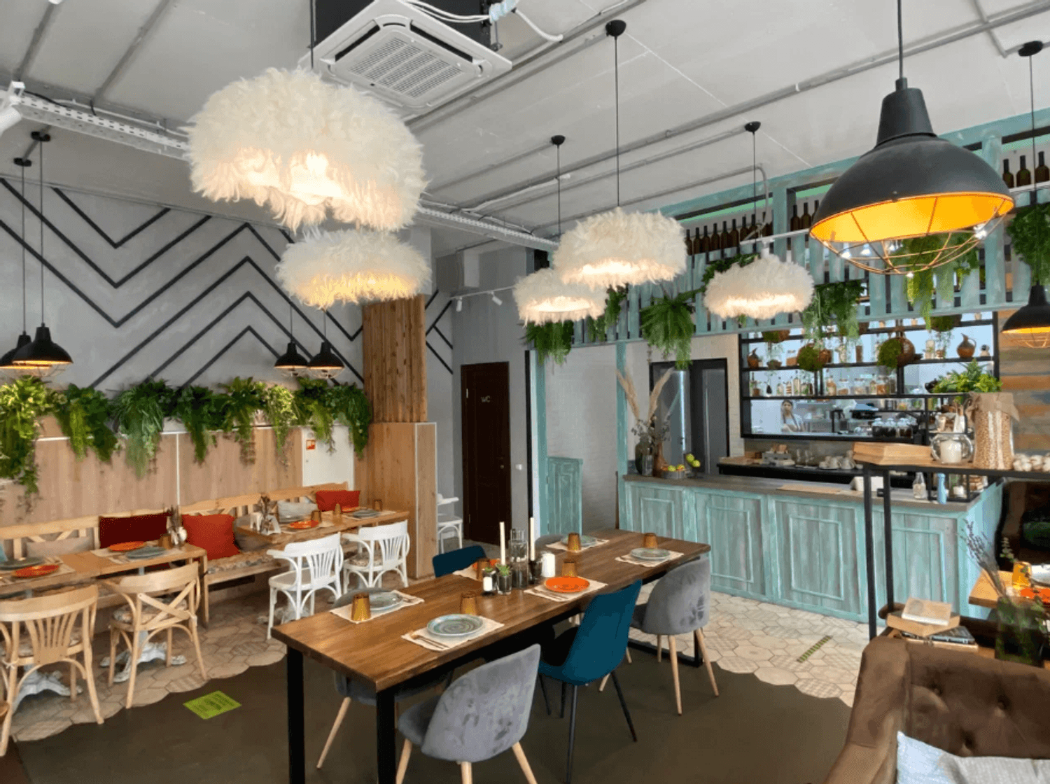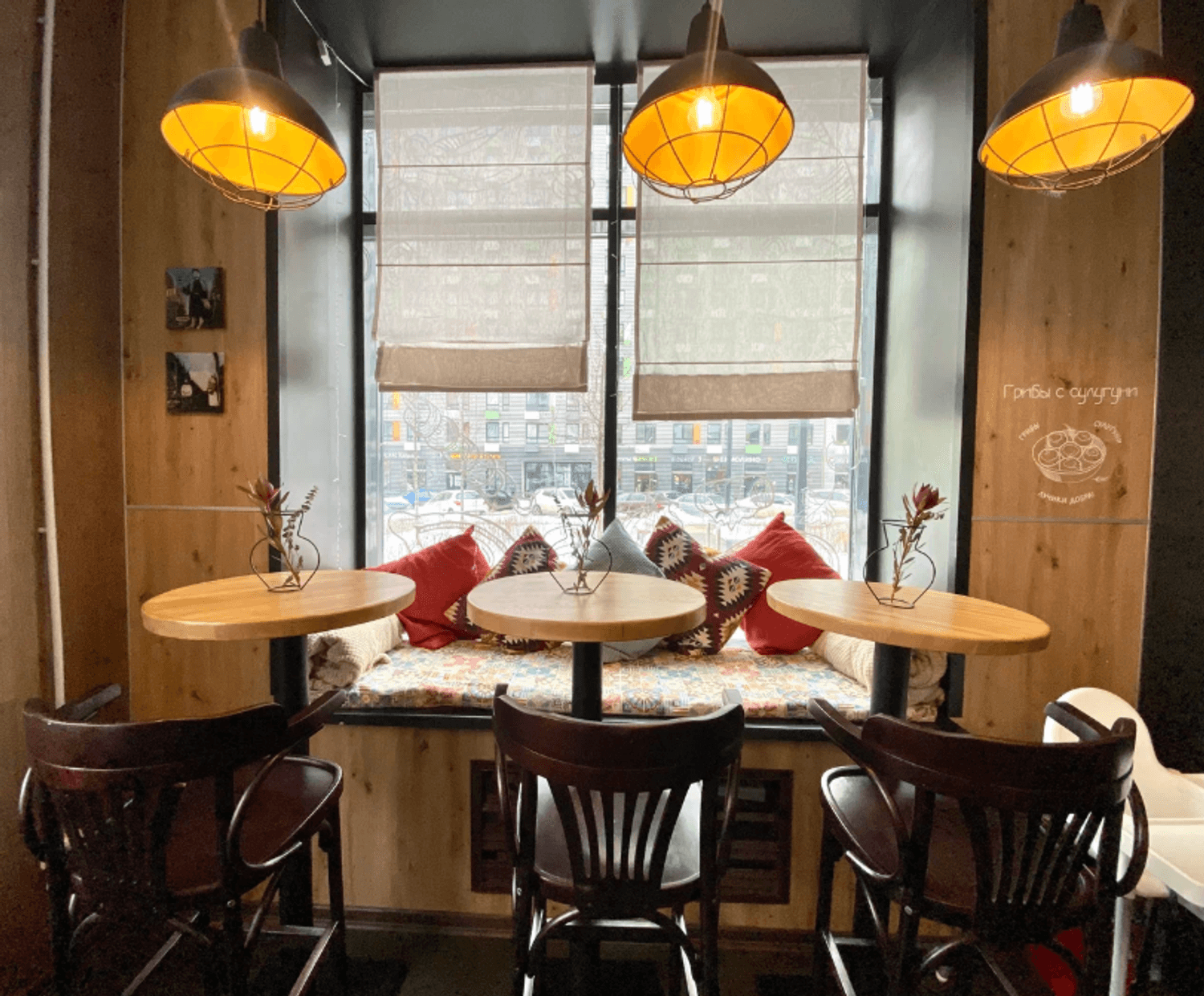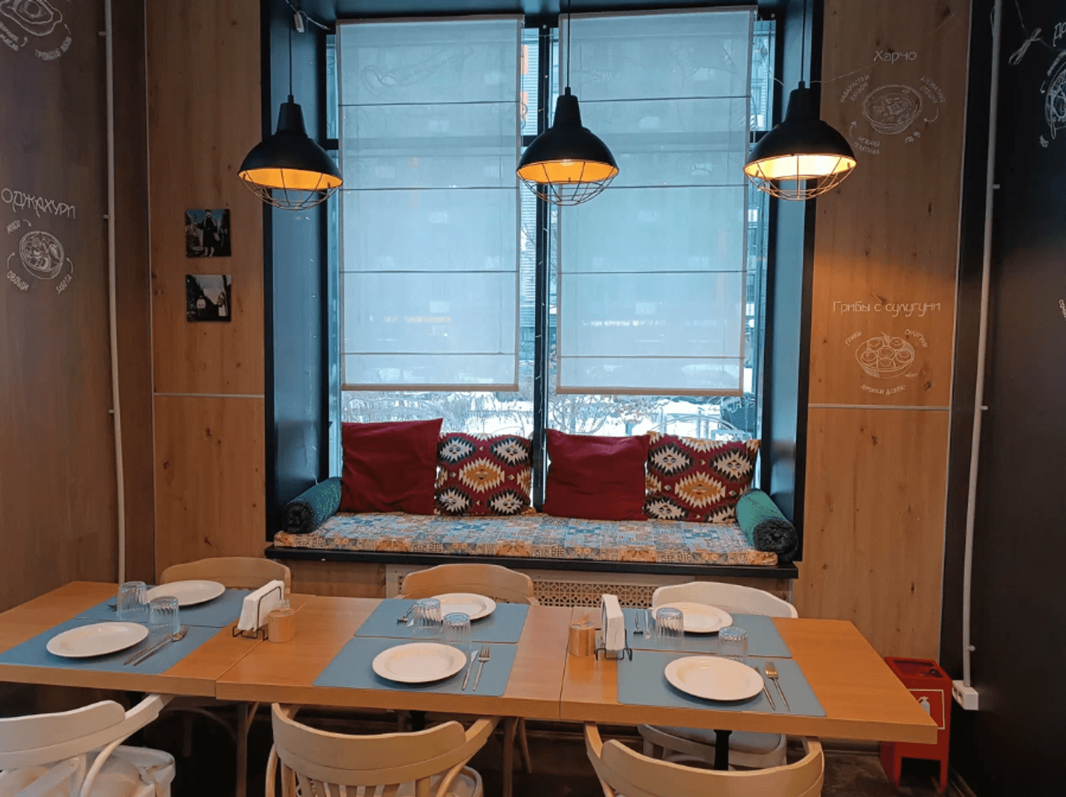 Атмосфера. Светлый зал оформлен как уютная гостиная: мягкие диваны с яркими подушками, стеллажи с книгами, живые растения и сухоцветы. Пространство создает ощущение грузинского дома, где можно провести продолжительный обед или ужин. Летом работает веранда.