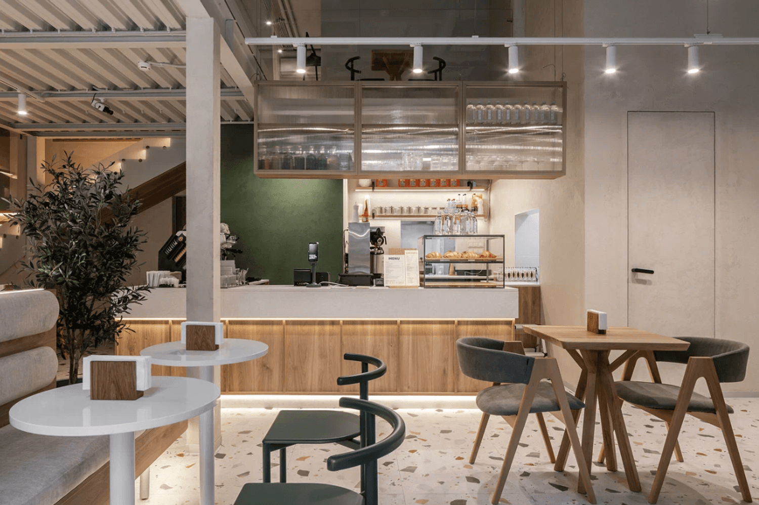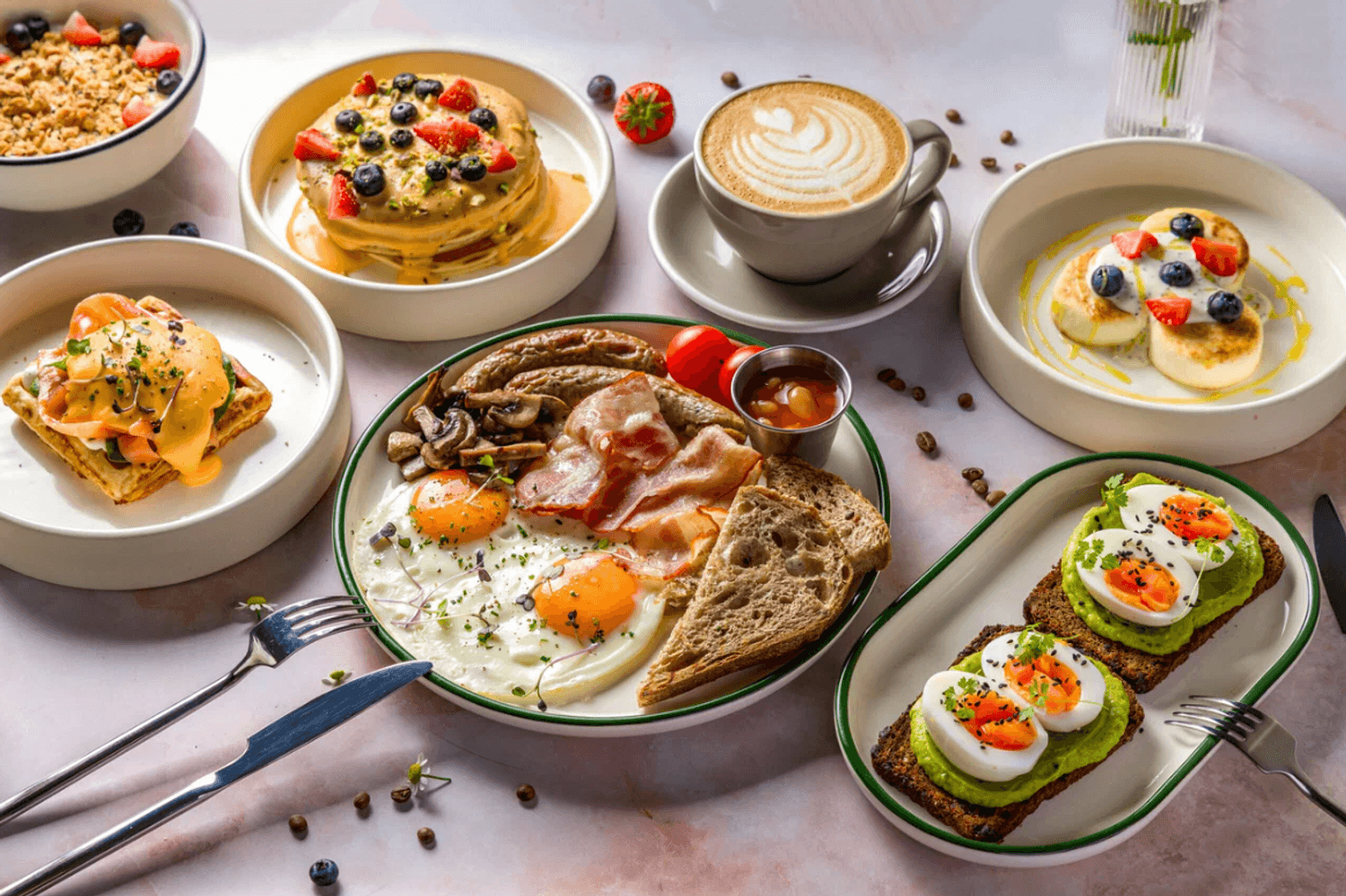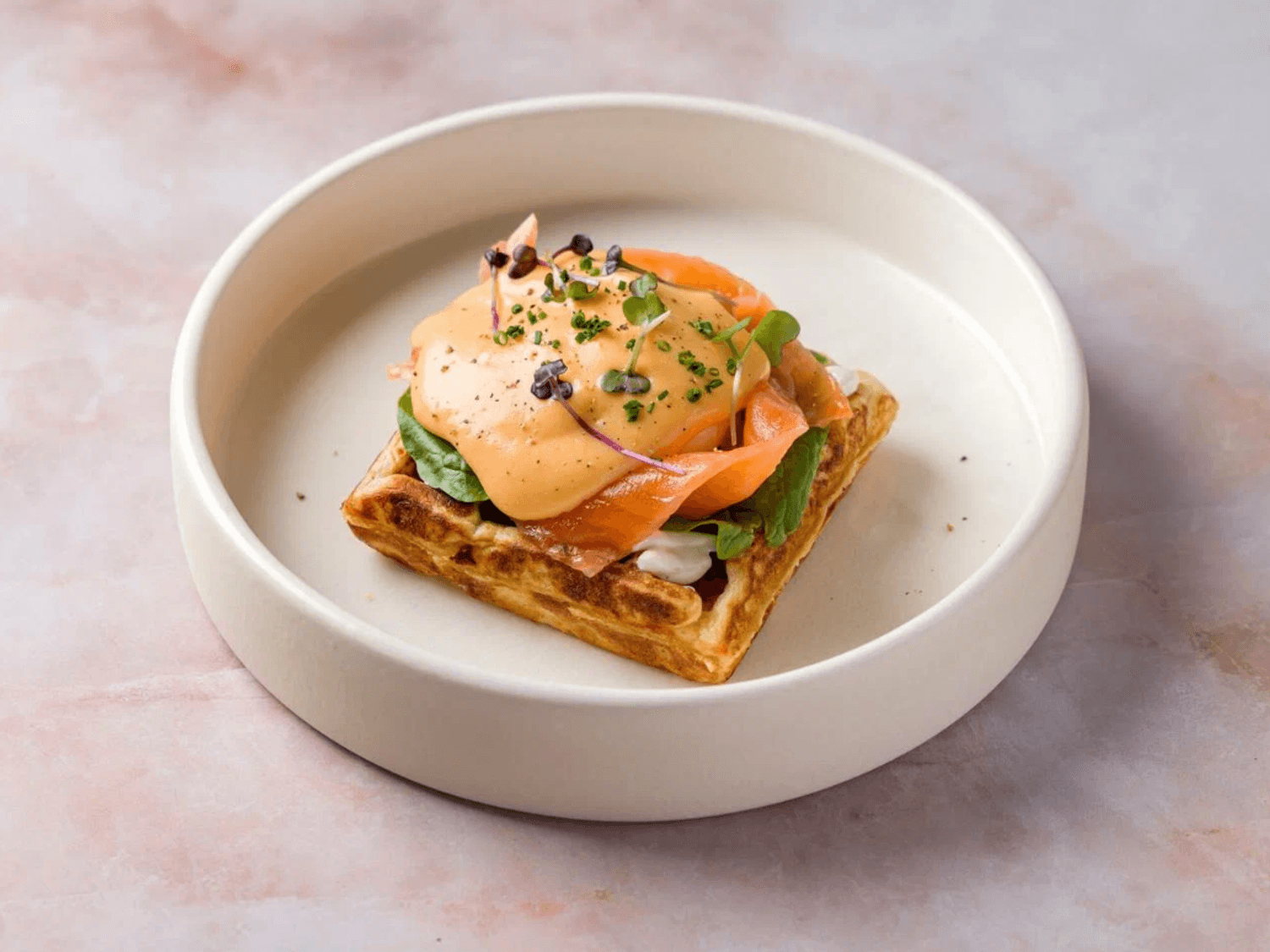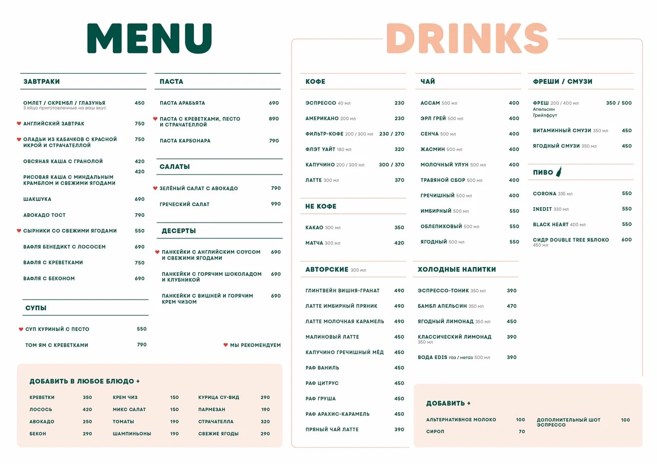 Еда и напитки. В меню — блюда на весь день: завтраки в виде кабачковых оладьев с икрой и страчателлой, вафлей с креветками и рисовой каши с чиа, шоколадом и бананом. Также предлагают пасту с креветками в сливочном соусе с песто и куриная грудка с соусом умами. На десерт заказывают панкейки: с горячим шоколадом и клубникой или английским соусом и свежими ягодами.