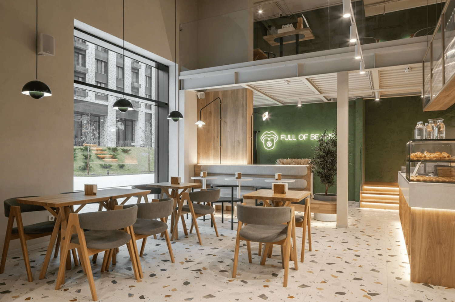 Атмосфера. Светлый зал наполнен оригинальными деталями: барная стойка и лестница с эффектной подсветкой, круглые светильники на зеленой стене, стеклянные панели ограждений и белый пол с хаотично расположенными фигурками.