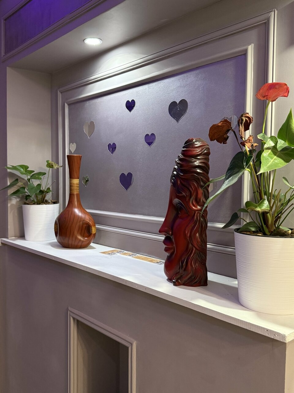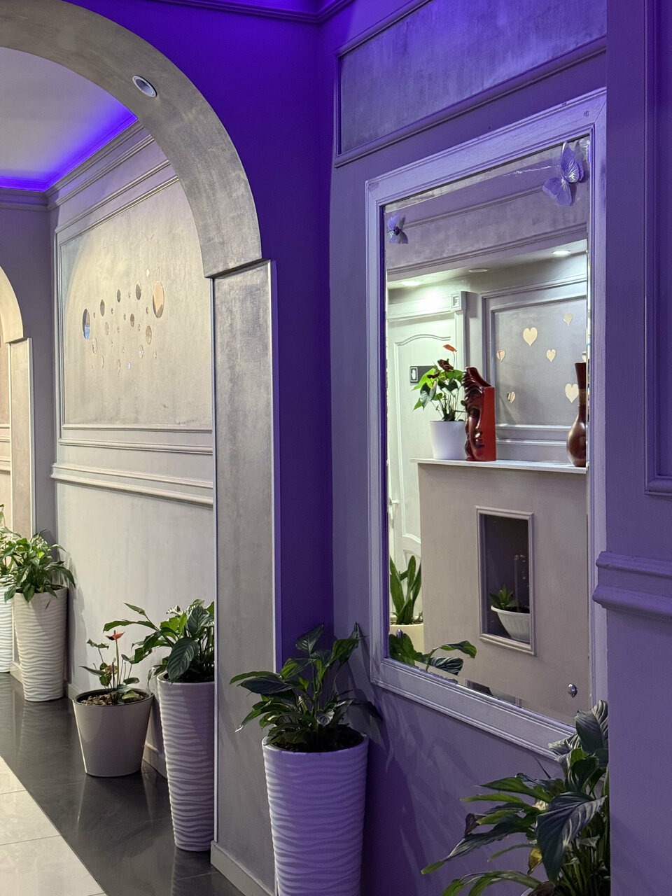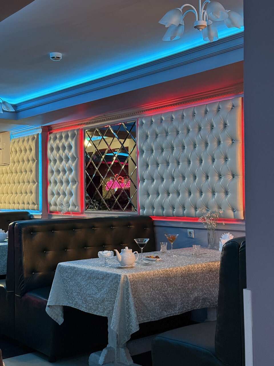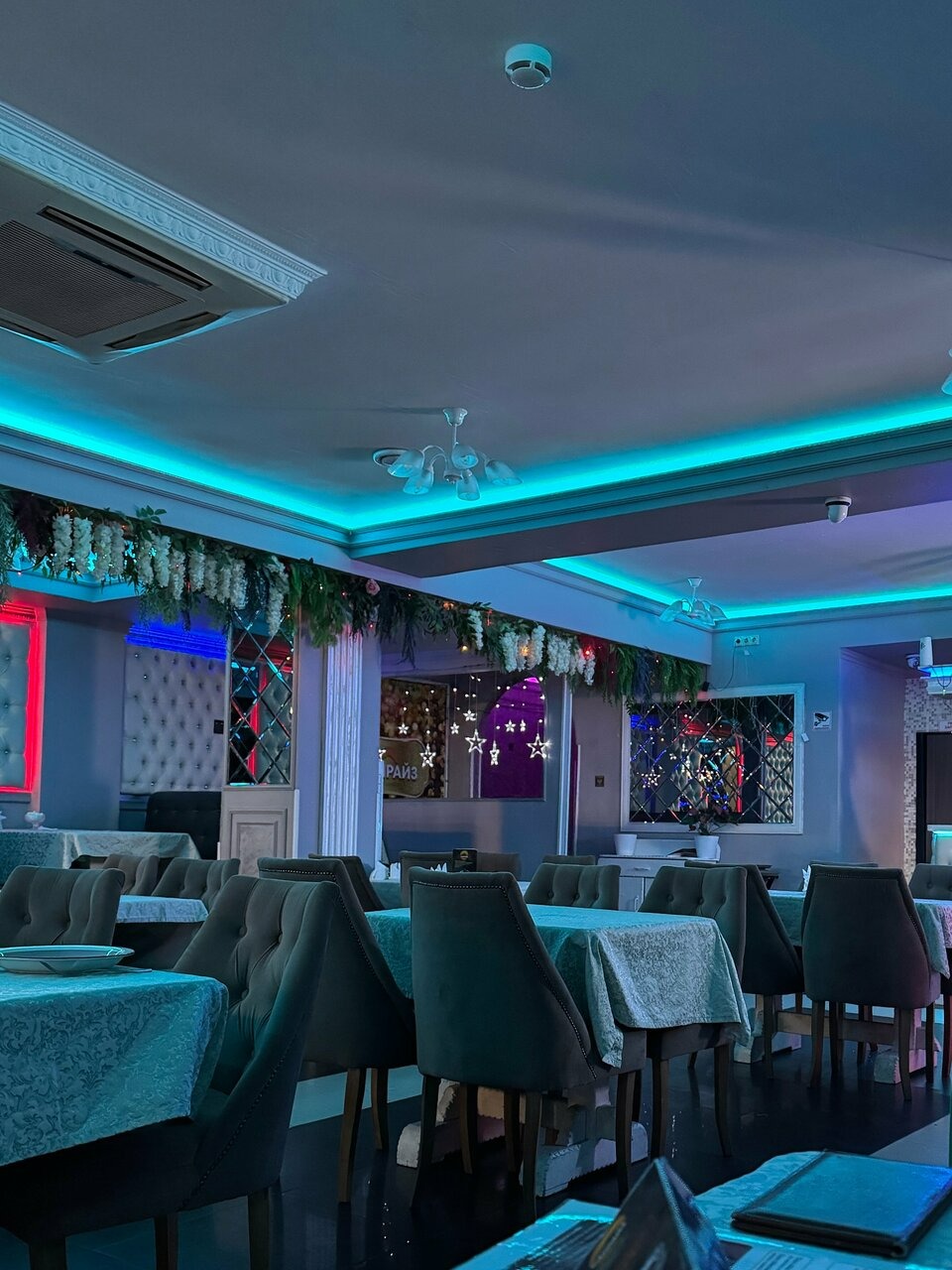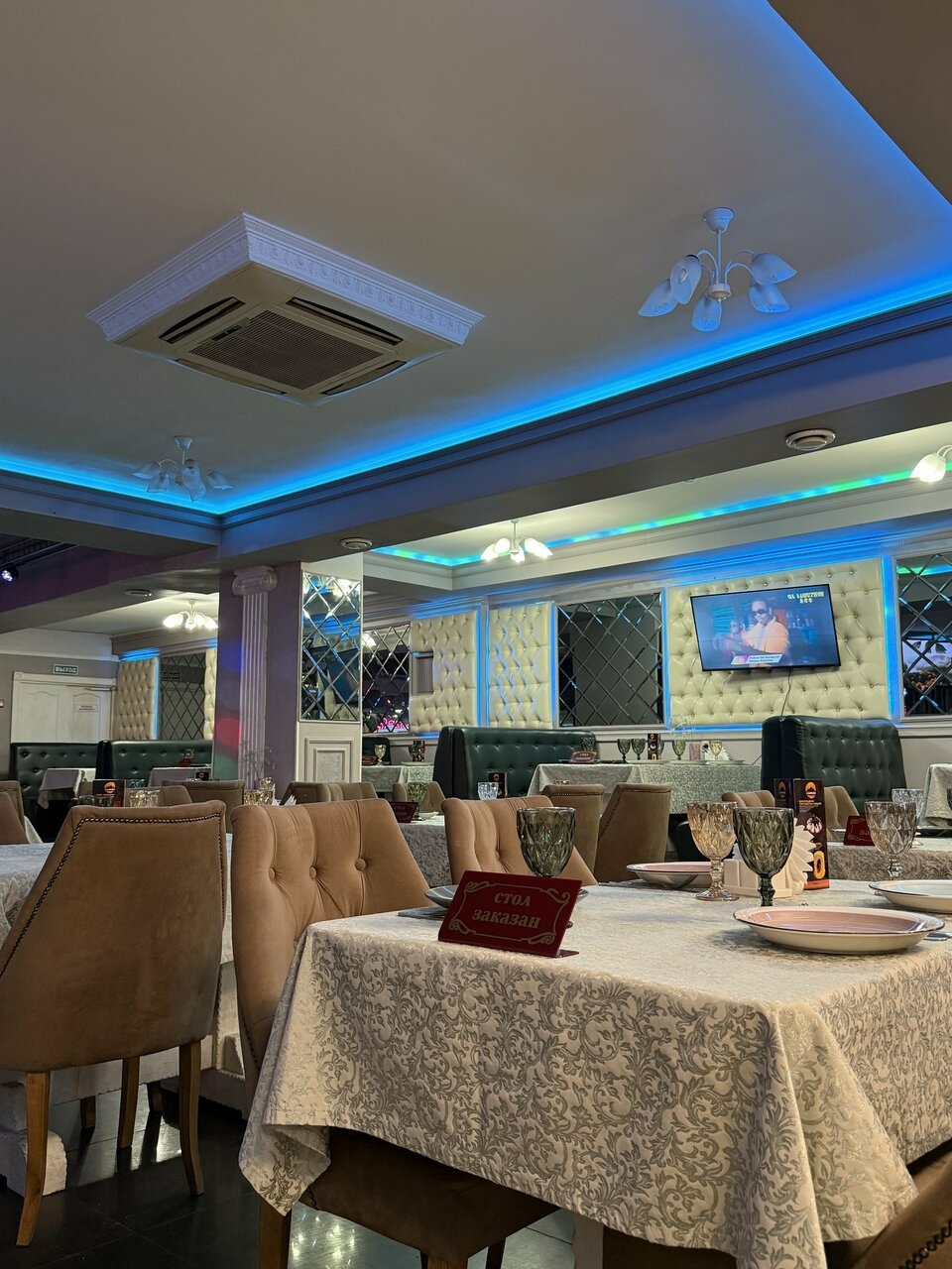 Атмосфера. Зал в светлой цветовой гамме с элегантными акцентами: белые колонны с зеркалами, зеркальные поверхности на стенах и стеганые мягкие вставки на стенах. Синяя подсветка и мебель бежевых оттенков создает праздничное настроение. В летний период гости могут насладиться отдыхом на крытой веранде.