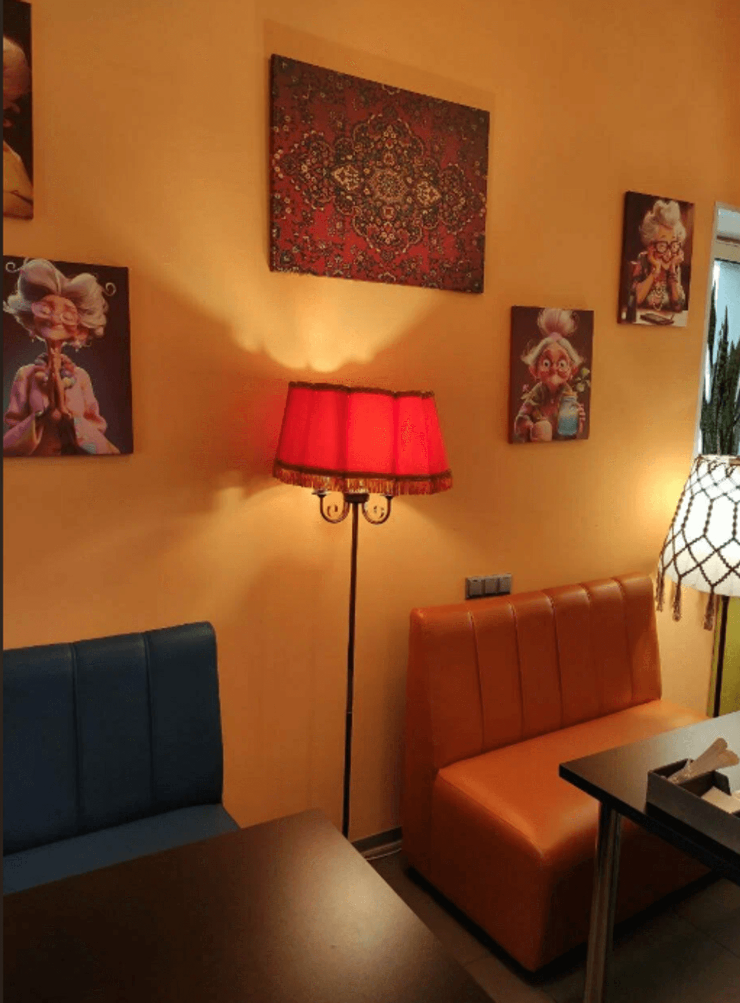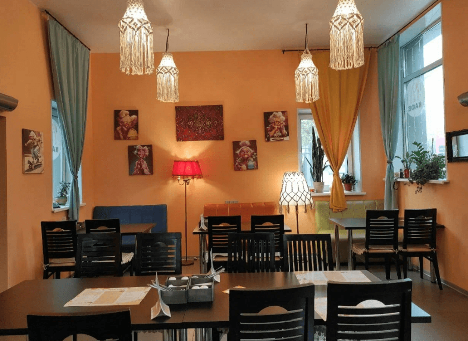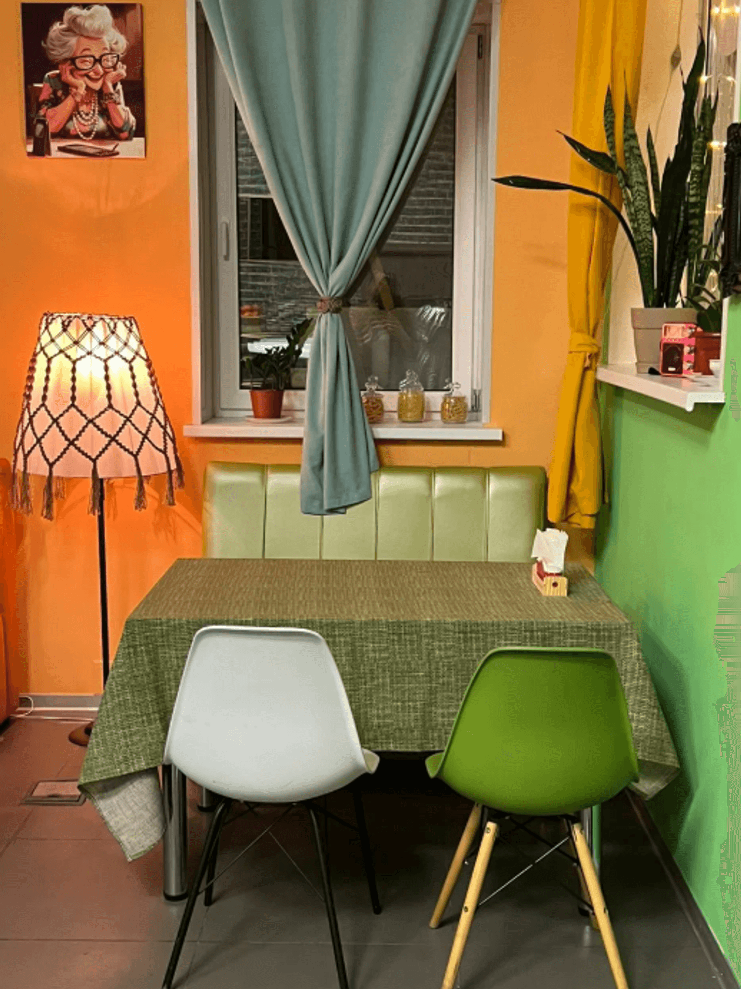 Атмосфера. Пространство дышит теплом и уютом: деревянные столы, вязаные скатерти, мягкий свет торшеров и старые картины на стенах. Здесь все просто и по-семейному, как в гостях у родственников, где можно расположиться на обед или шумный ужин с близкими.