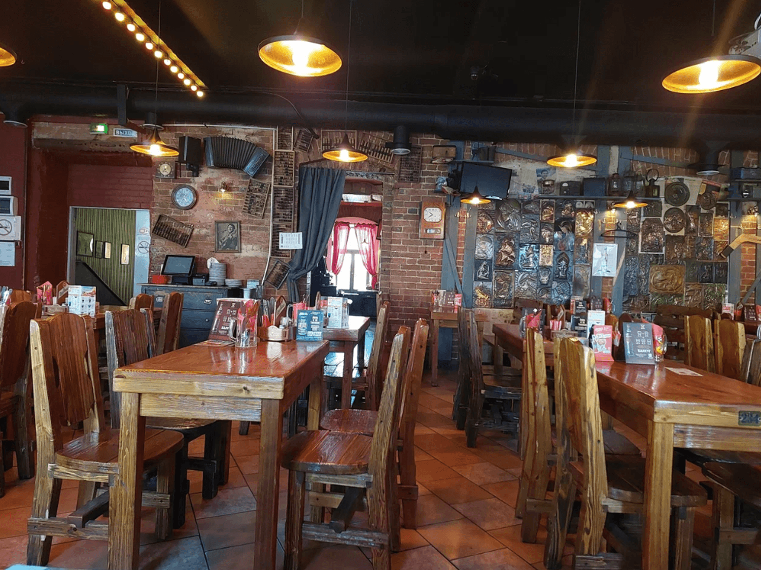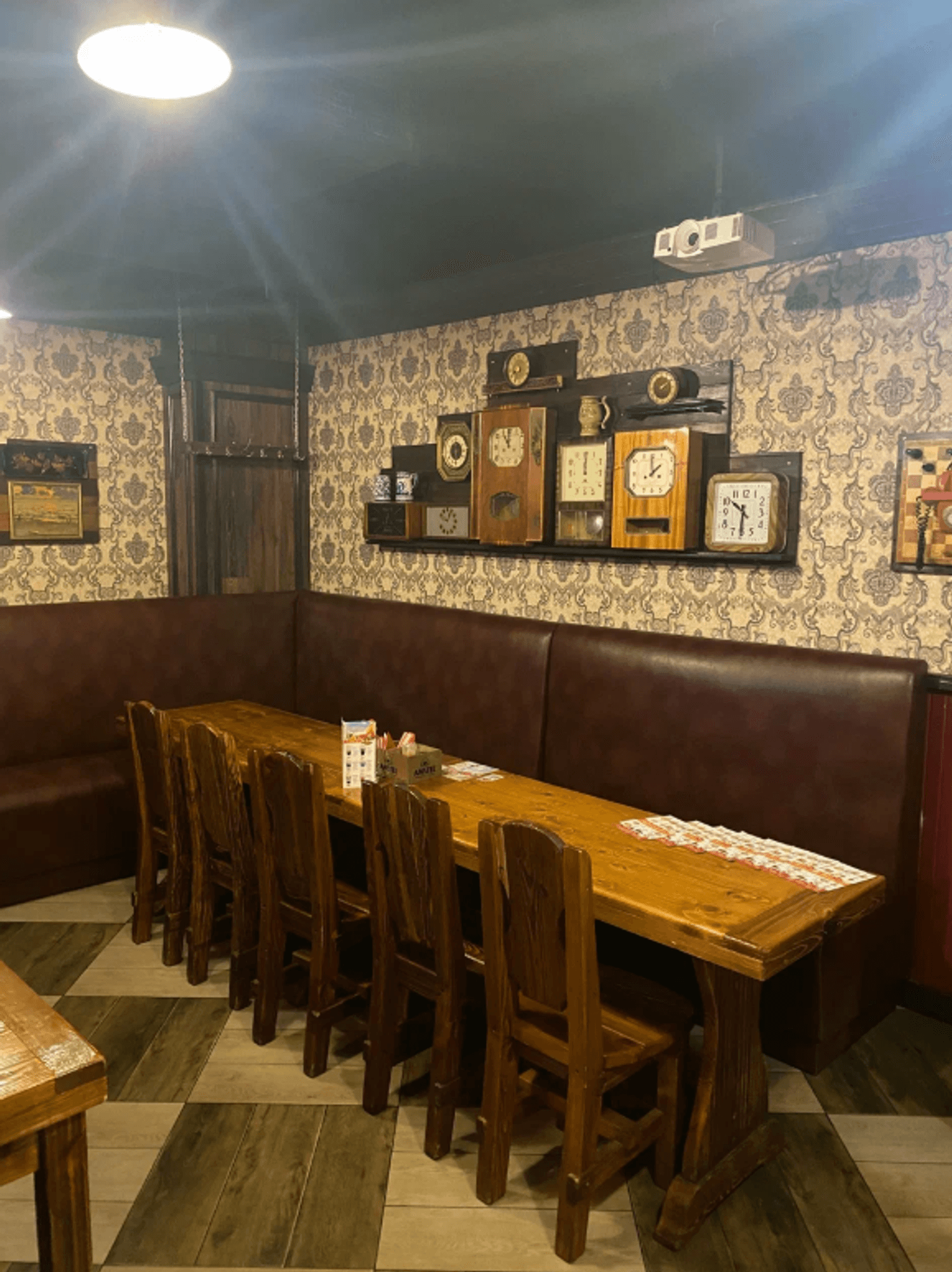 Атмосфера. Пространство в индустриальном стиле с кирпичными стенами и кожаными диванами дополнено яркими деталями: алое знамя, портрет Сталина, старый автомобиль на стене и даже коллекция утюгов. Завершает картину сервировка чая в граненых стаканах с подстаканниками, создавая атмосферу, в которой хочется предаться воспоминаниям.