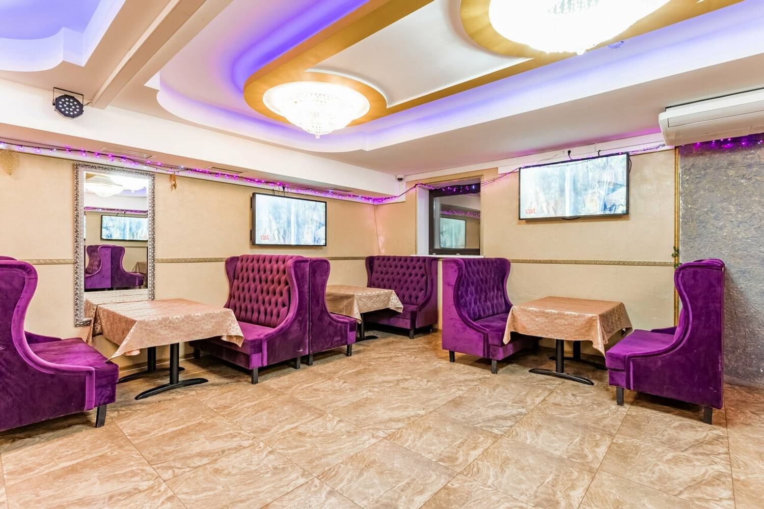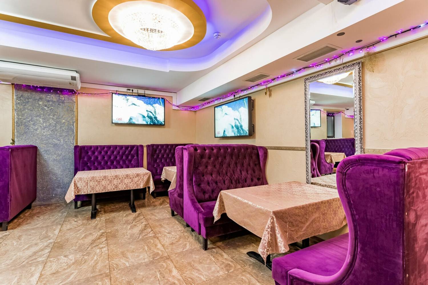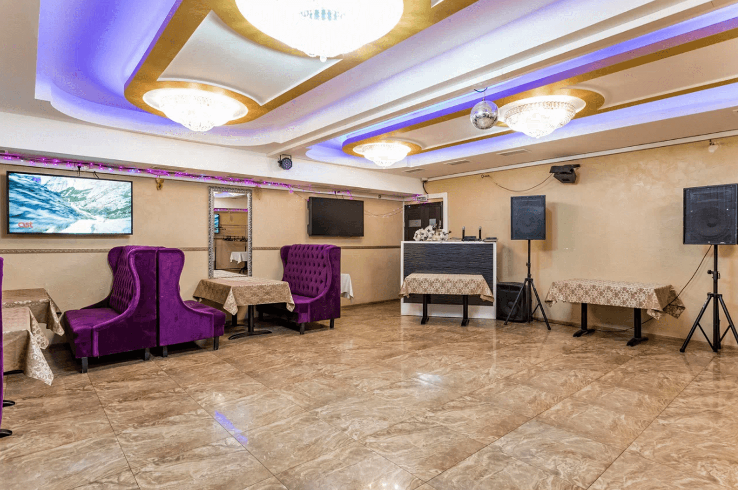 Атмосфера. Пространство разделено на несколько зон: банкетные залы, караоке, балкончик с мягкой зоной и детский уголок. Интерьер одного из залов выполнен в золотисто-пастельных тонах с темной деревянной мебелью и ярким светом, благодаря чему интерьер выглядит празднично. Второй зал более камерный, с мягкими пурпурными диванами и большими экранами.