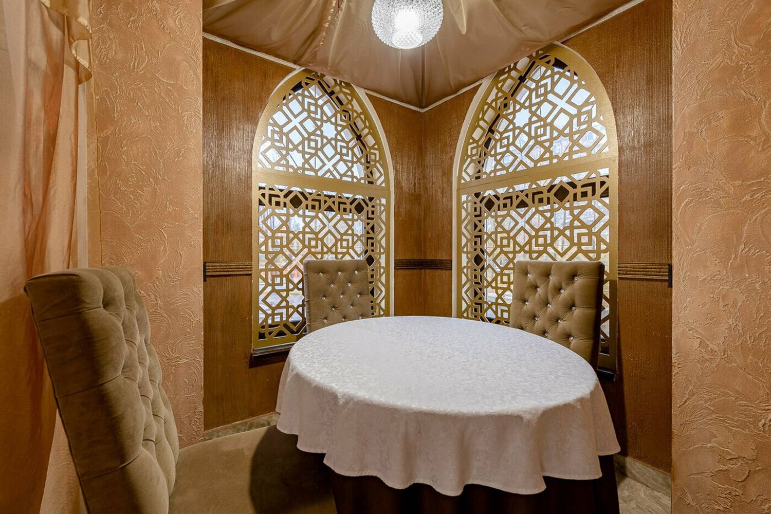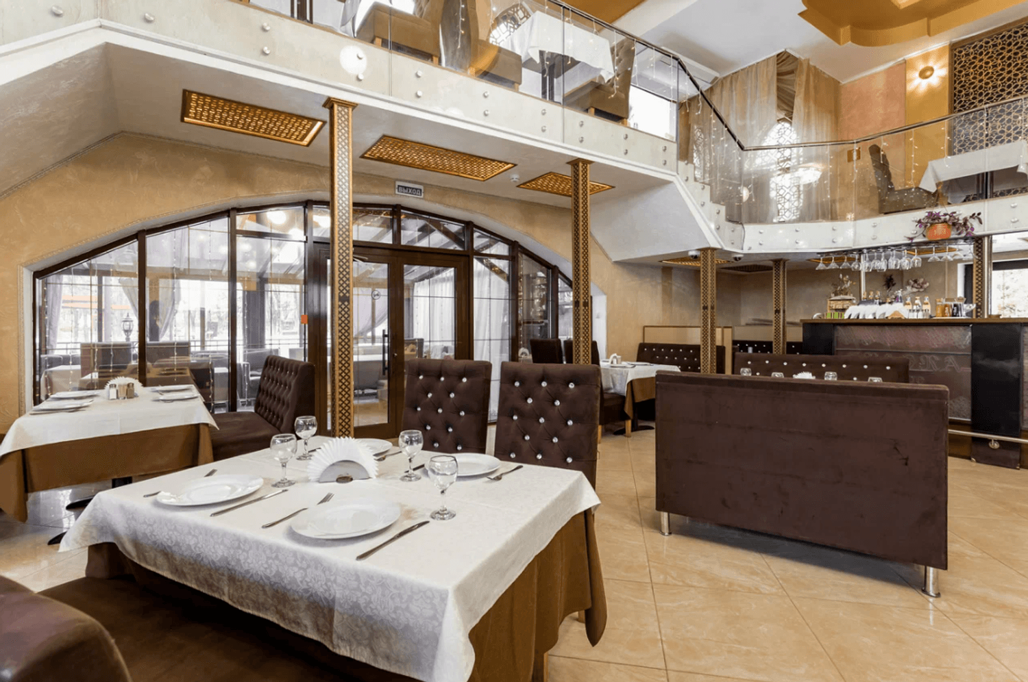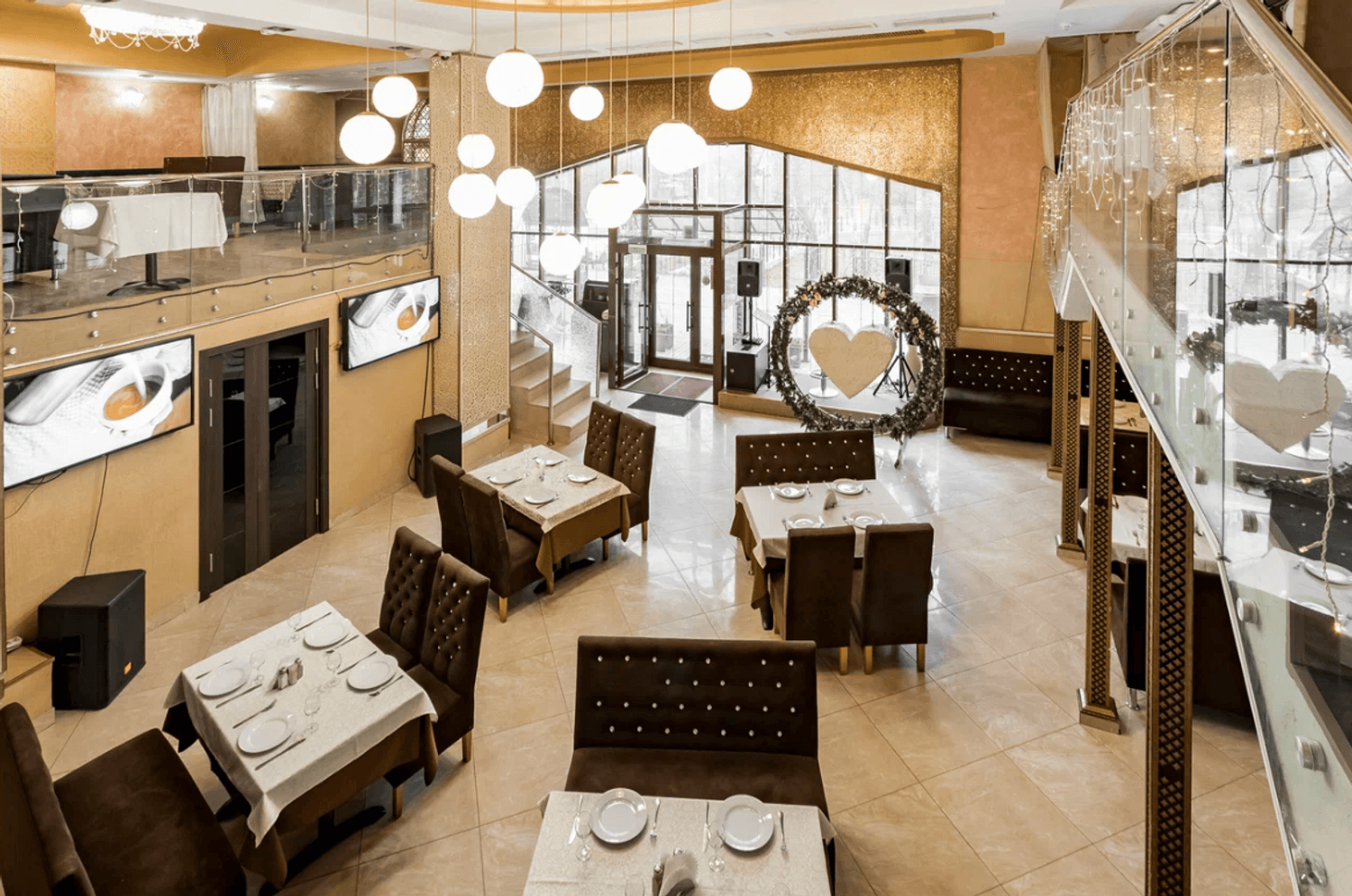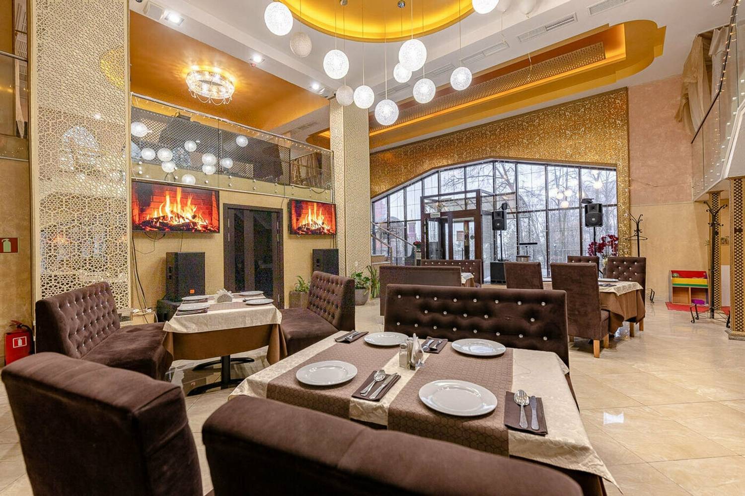 Атмосфера. Пространство разделено на несколько зон: банкетные залы, караоке, балкончик с мягкой зоной и детский уголок. Интерьер одного из залов выполнен в золотисто-пастельных тонах с темной деревянной мебелью и ярким светом, благодаря чему интерьер выглядит празднично. Второй зал более камерный, с мягкими пурпурными диванами и большими экранами.