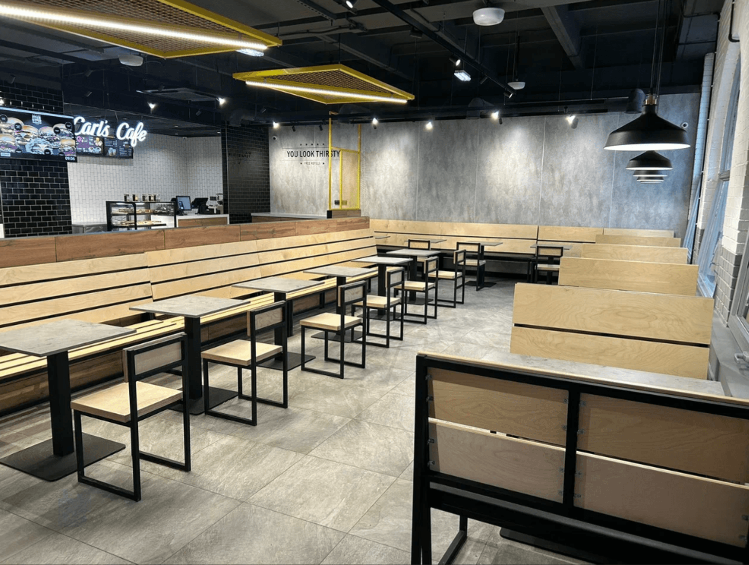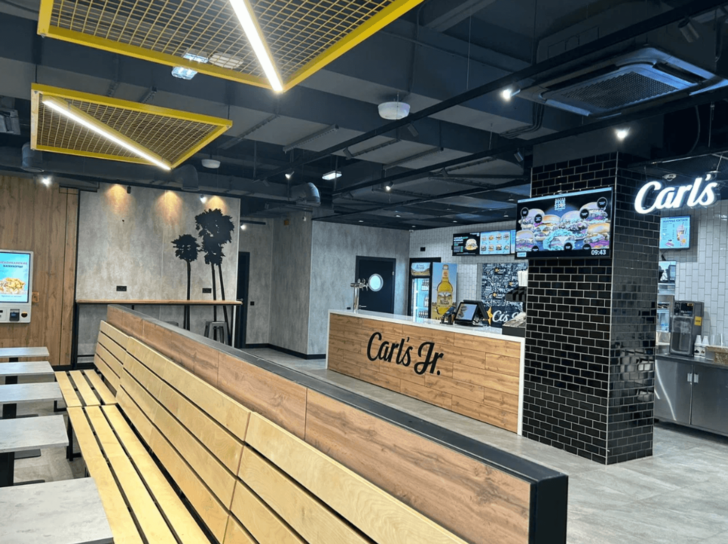 Атмосфера. Дизайн в индустриальном стиле с деревянной стойкой и черными люстрами. Рядом с деревянной стойкой акцентом стоит черная плиточная колонна.