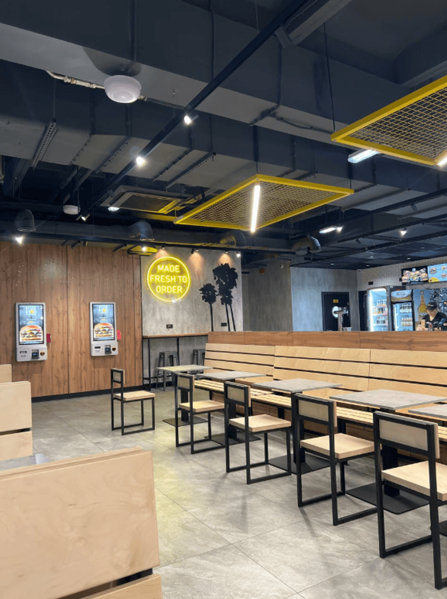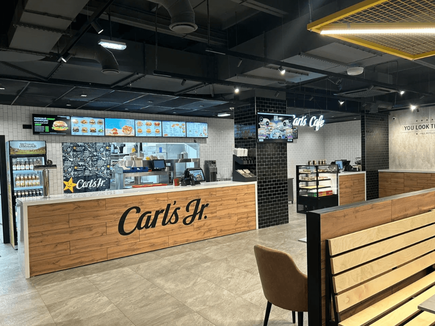 Еда и напитки. В меню — бургеры на углях: гуакамоле с сыром, гавайский, классик, вестерн. Также готовят закуски, например, фиш энд чипс, чили чиз фри, сырные палочки, креветки. куриные сэндвичи, картофель фри и наггетсы, тако салаты и чикен клаб сэндвич. Из напитков — кофе, пиво, сок и газировка.