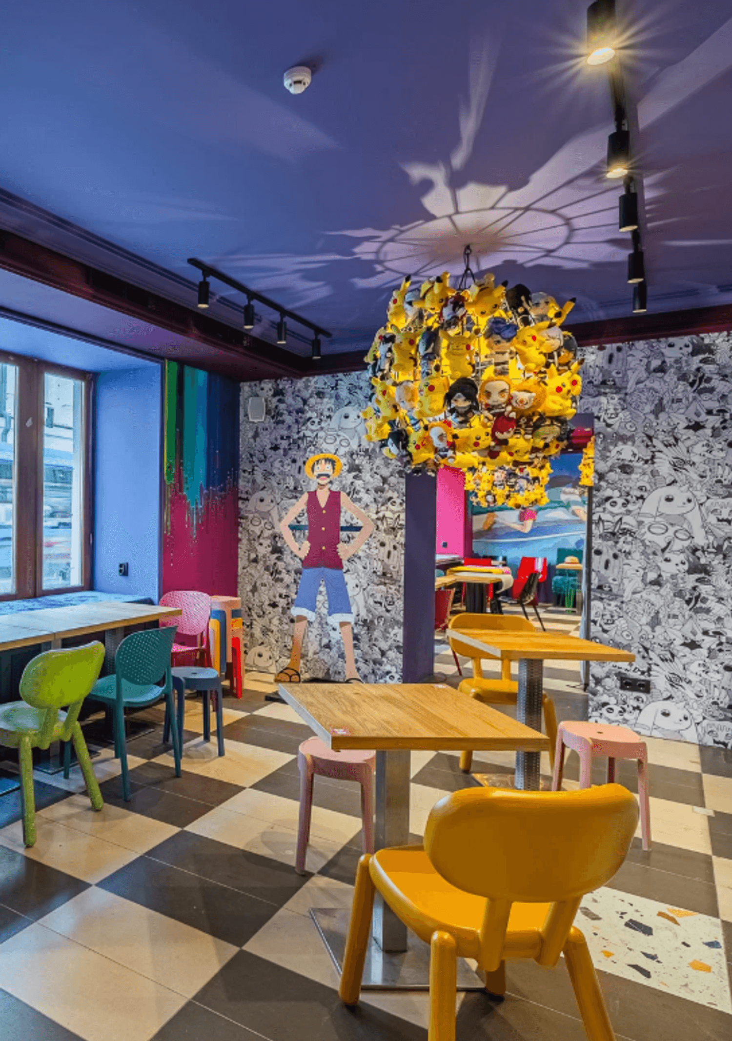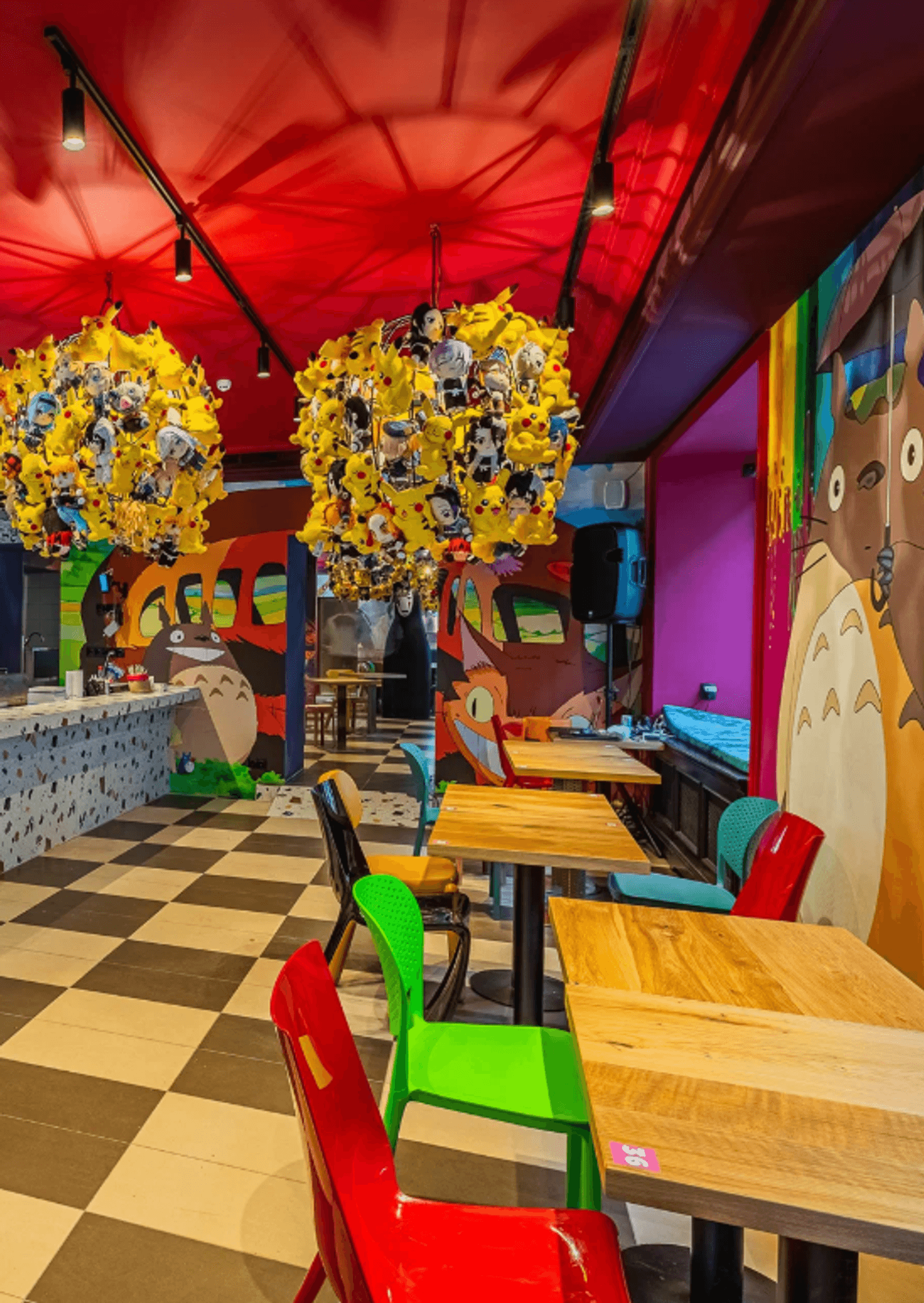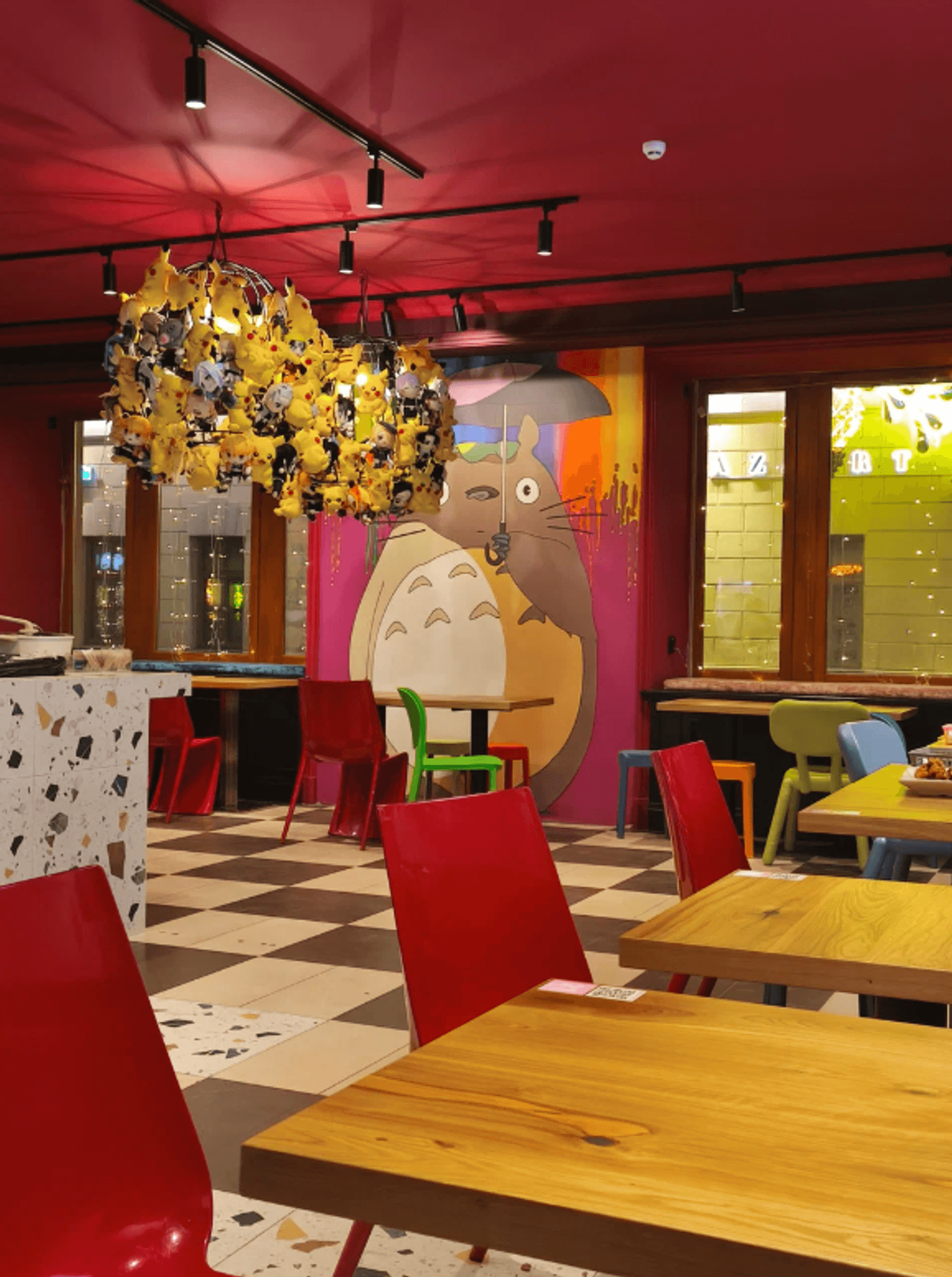Атмосфера. Пространство напоминает красочную аниме-вселенную: люстры украшены плюшевыми покемонами и другими аниме-игрушками, а также на стенах рисунки героев из аниме, например, Наруто и Миядзаки. Стойка заказов декорирована в стиле конфетти, а фигурки известных персонажей завершают образ места, где каждая деталь говорит на языке фанатов.