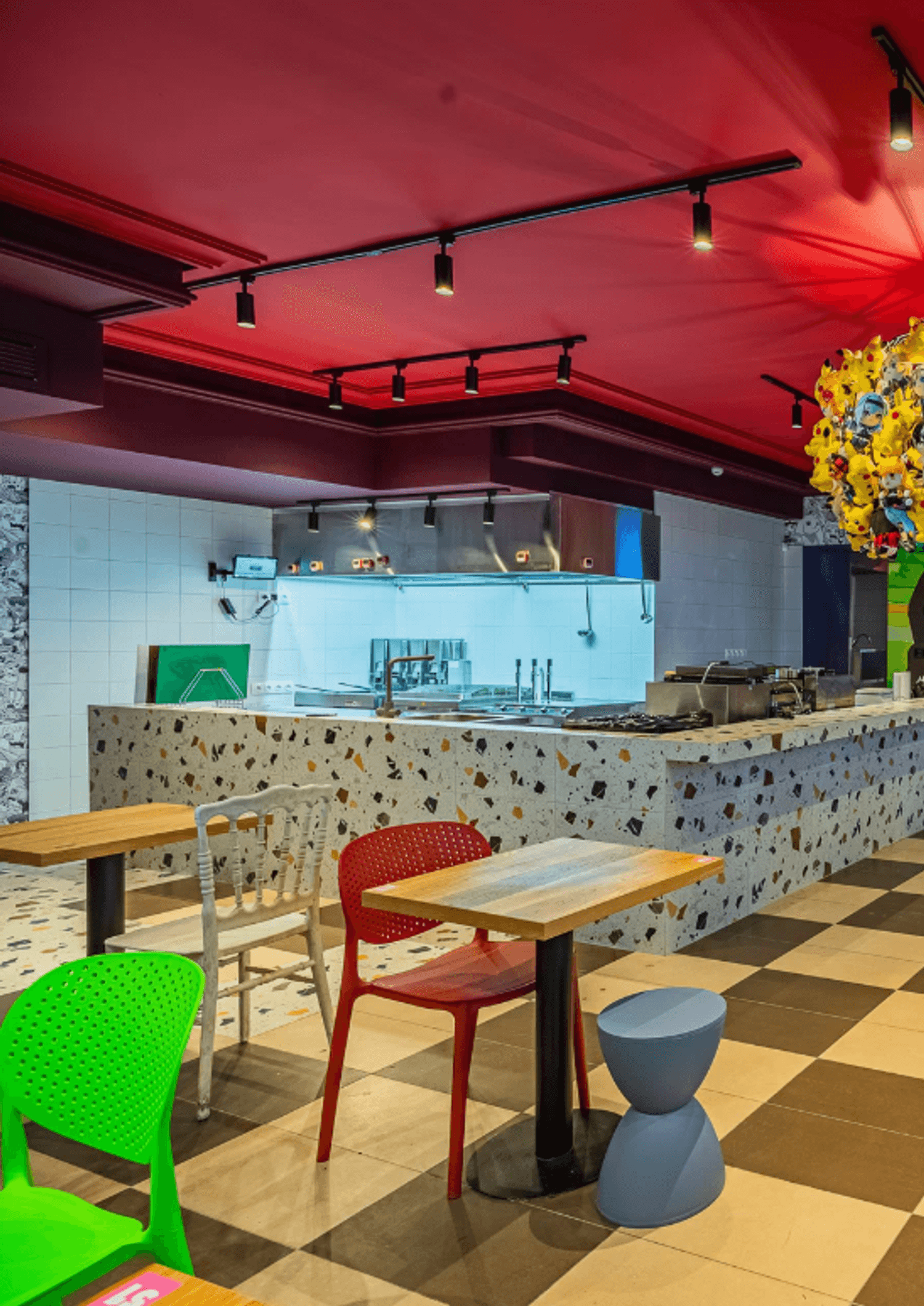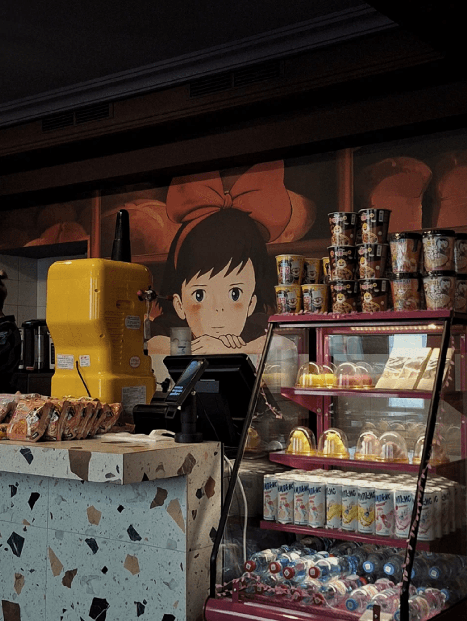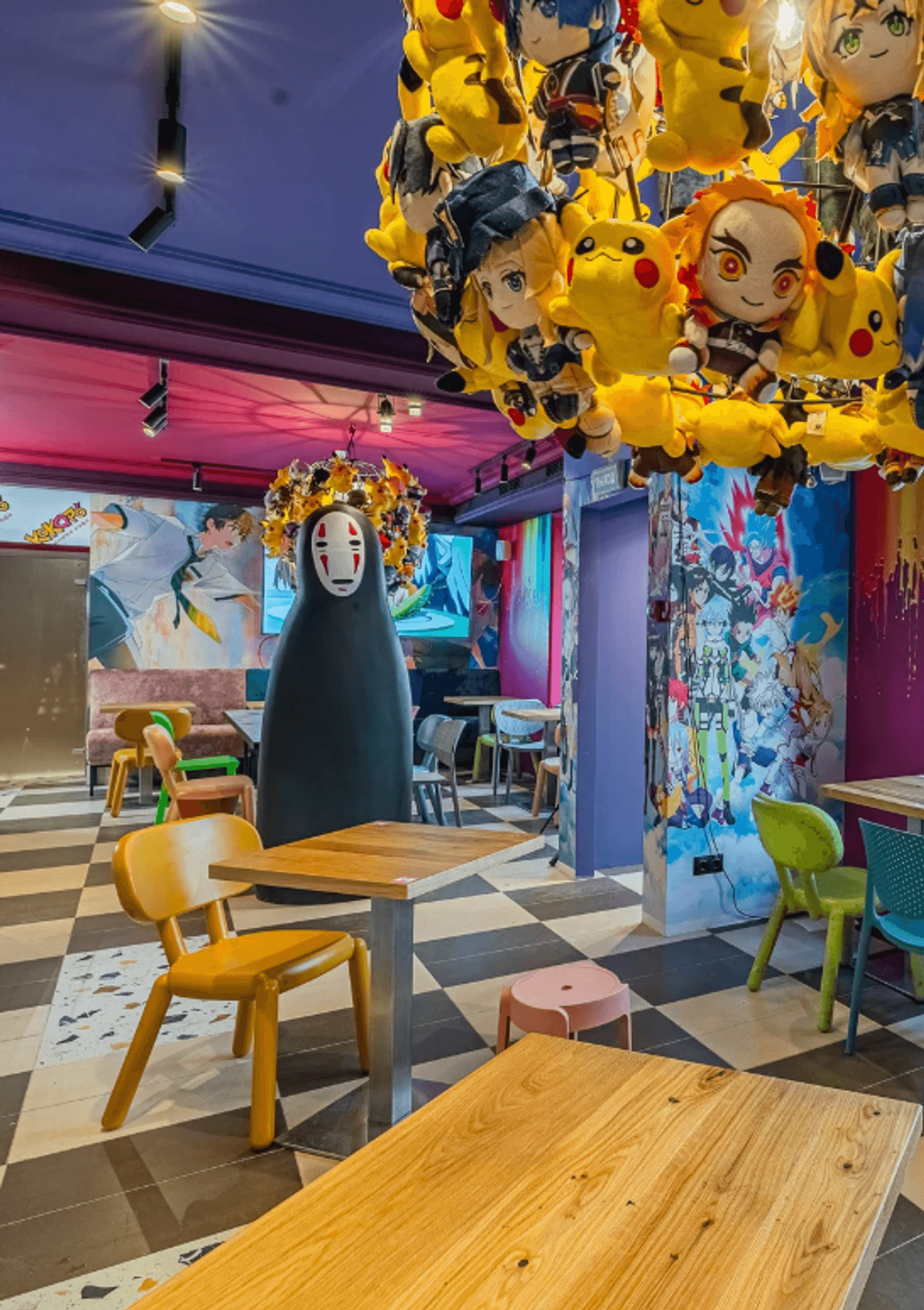 Атмосфера. Пространство напоминает красочную аниме-вселенную: люстры украшены плюшевыми покемонами и другими аниме-игрушками, а также на стенах рисунки героев из аниме, например, Наруто и Миядзаки. Стойка заказов декорирована в стиле конфетти, а фигурки известных персонажей завершают образ места, где каждая деталь говорит на языке фанатов.