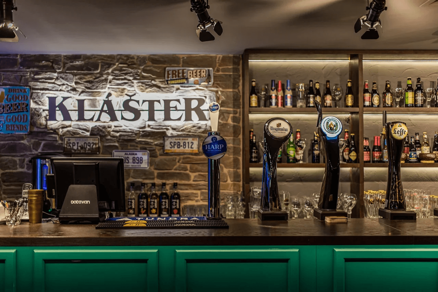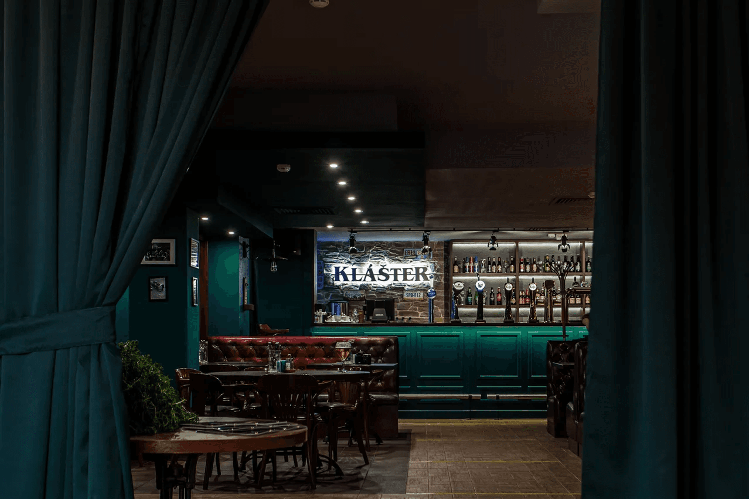 «Klášter» адресу Ленинский проспект, 11с1 — пивной бар с европейской кухней и камерной атмосферой.