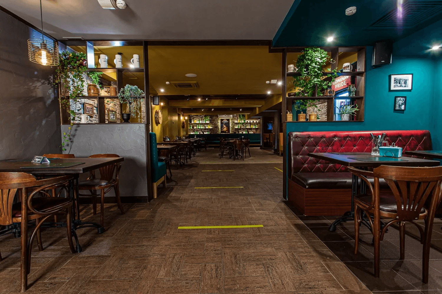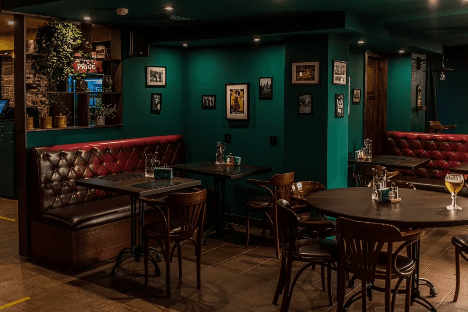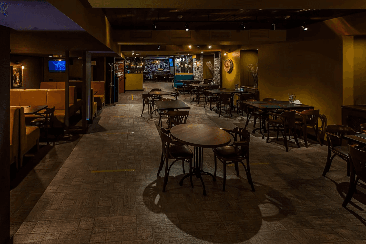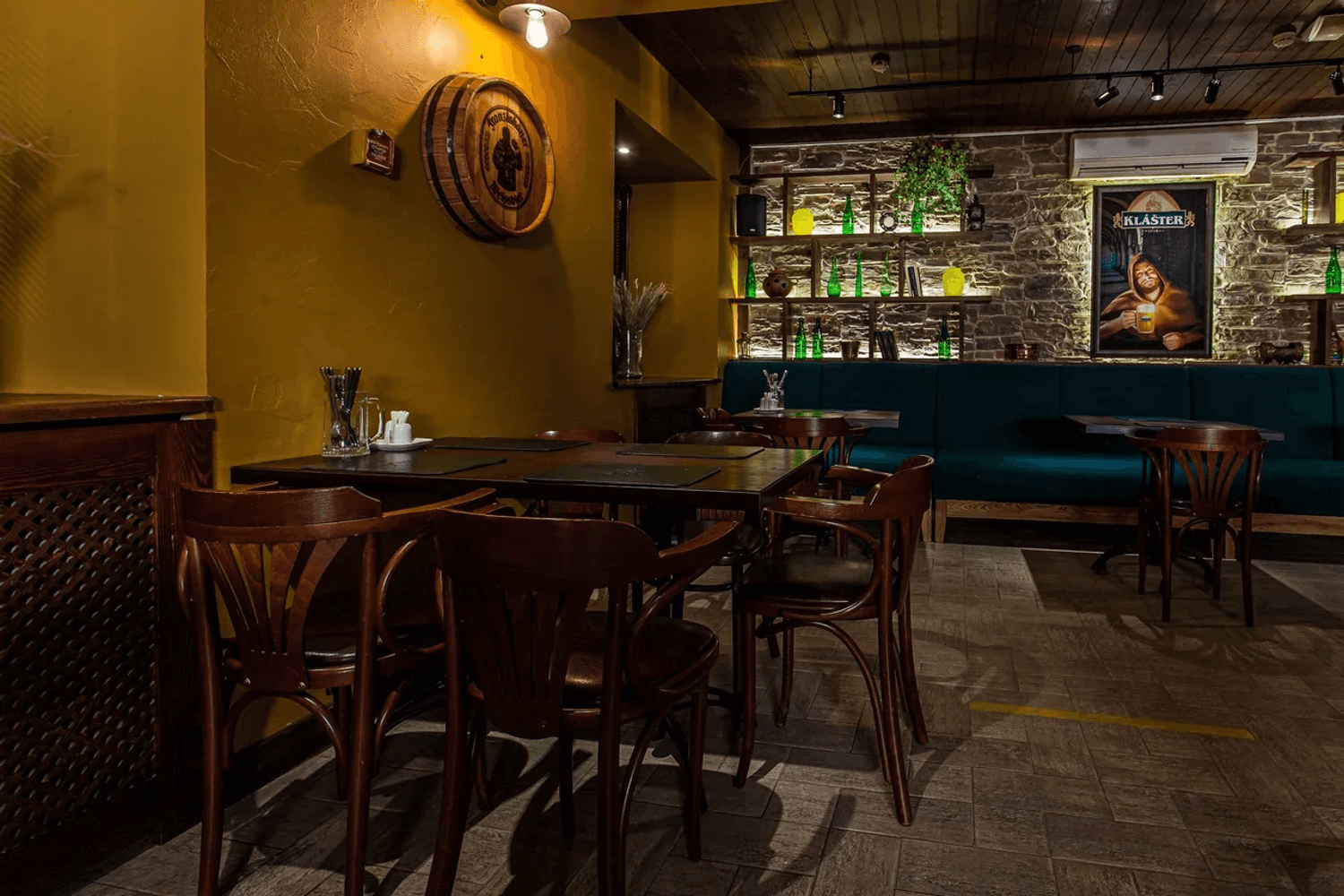 Атмосфера. Интерьер в стиле чешской пивной сочетает кирпичные стены, сводчатые потолки и деревянную мебель. Пространство разделено на зоны с разной цветовой гаммой — изумрудной, горчичной и серой, каждая из которых по-своему украшена: в одной зоне по стенам развешены донышки пивных бочек, а в другом — тематические картины. По вечерам здесь людно и динамично: проходят стендап-выступления и викторины.
