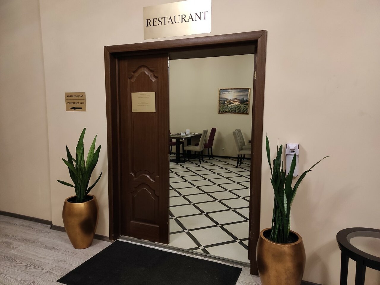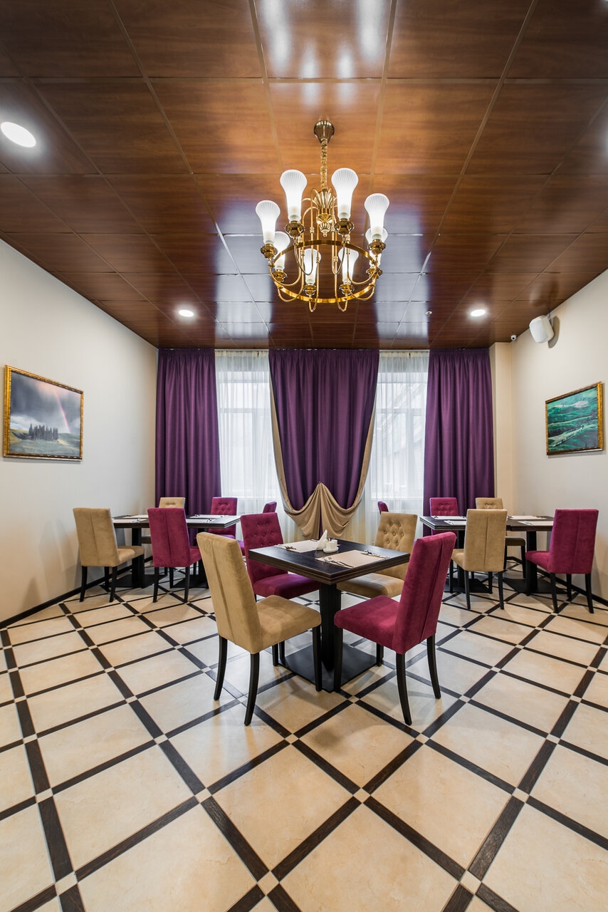 Атмосфера. Пространство с высокими потолками, деревянной мебелью и мягким освещением создает нейтральную и расслабляющую обстановку. Интерьер без ярких акцентов намеренно сделан ненавязчивым, чтобы гости могли сосредоточиться на общении или деловой беседе.