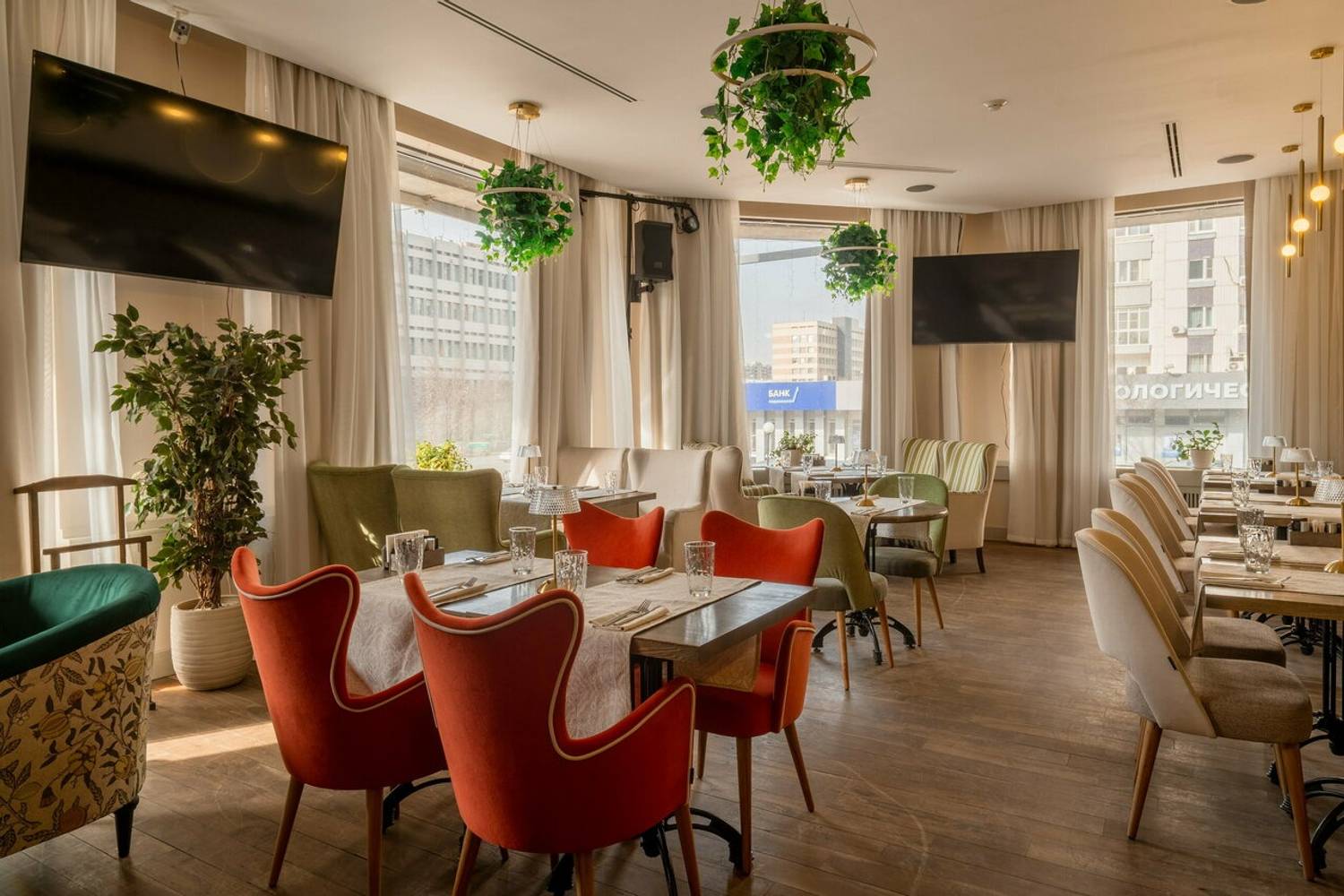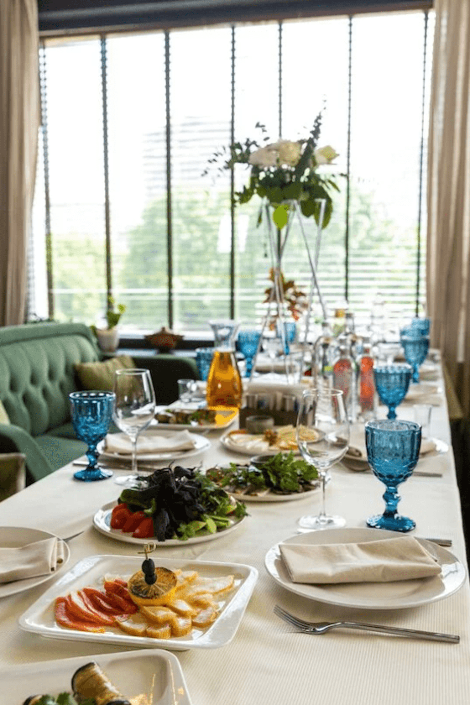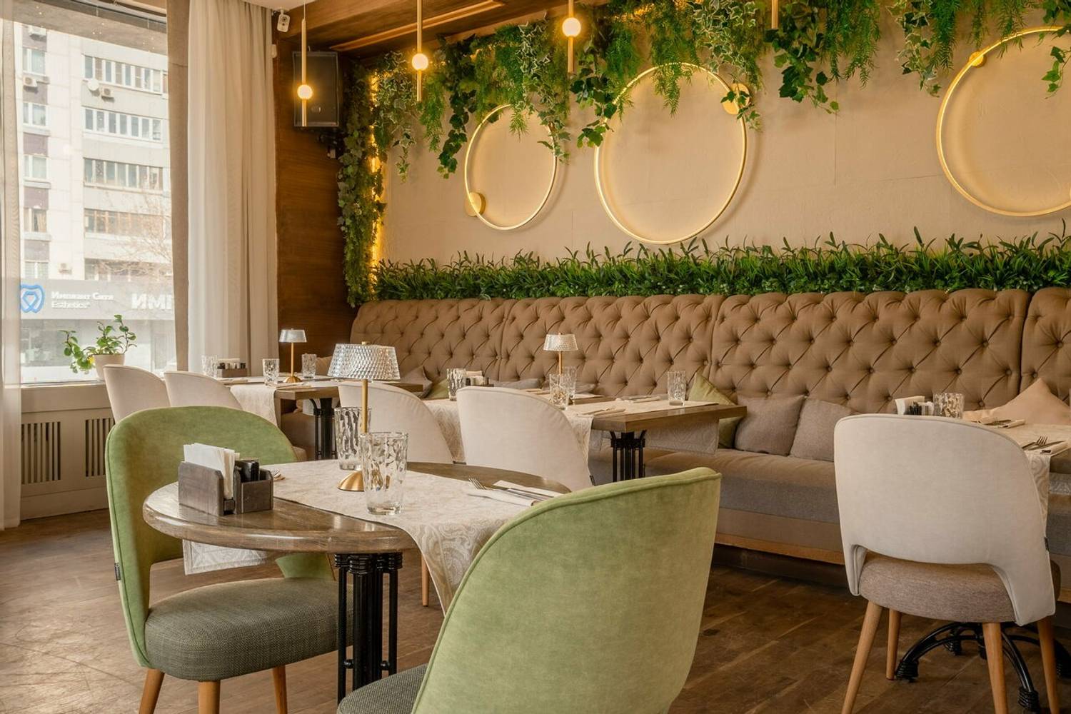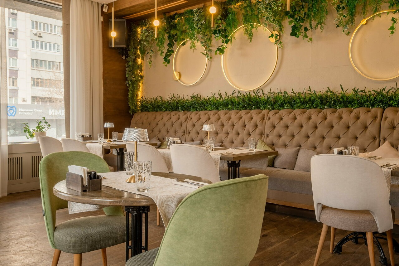 Атмосфера. Первый зал встречает светлым, воздушным интерьером с большими окнами и живыми растениями — здесь легко почувствовать себя в уютном итальянском кафе. Второй зал просторнее, с выразительными элементами грузинского стиля, необычным потолком и небольшой сценой. В теплое время года открывается летняя веранда. Ресторан подходит для разных событий: от камерных встреч до банкетов, свадеб и корпоративных мероприятий.