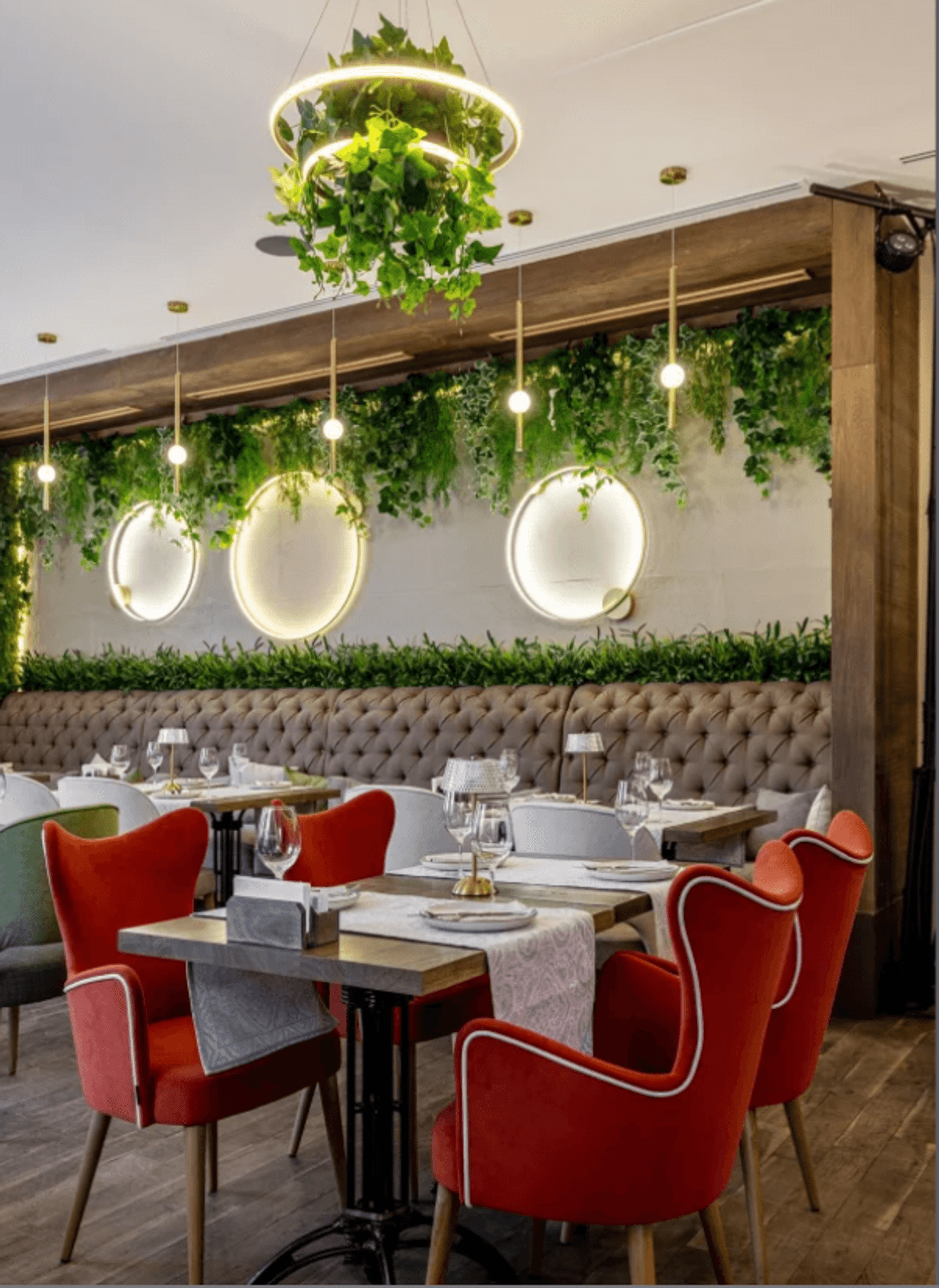 Внутри — два зала. Первый — светлый и уютный, с большими окнами, зеленью и атмосферой Италии. Второй — более просторный, с грузинским колоритом, необычным потолком и небольшой сценой. В теплый сезон открывают летнюю веранду.