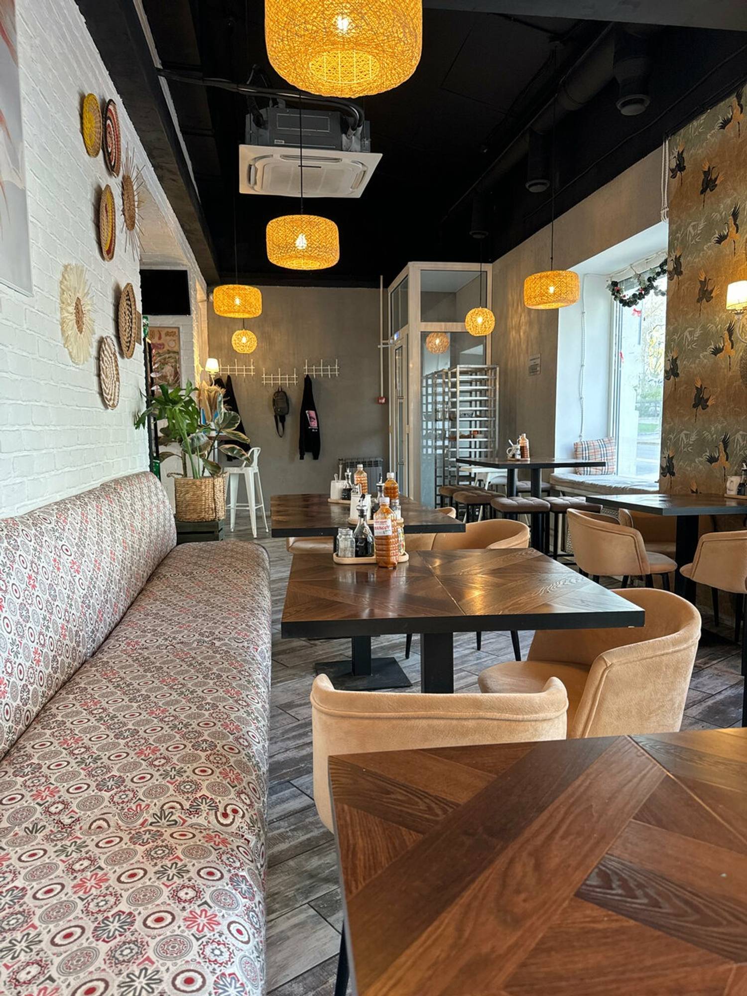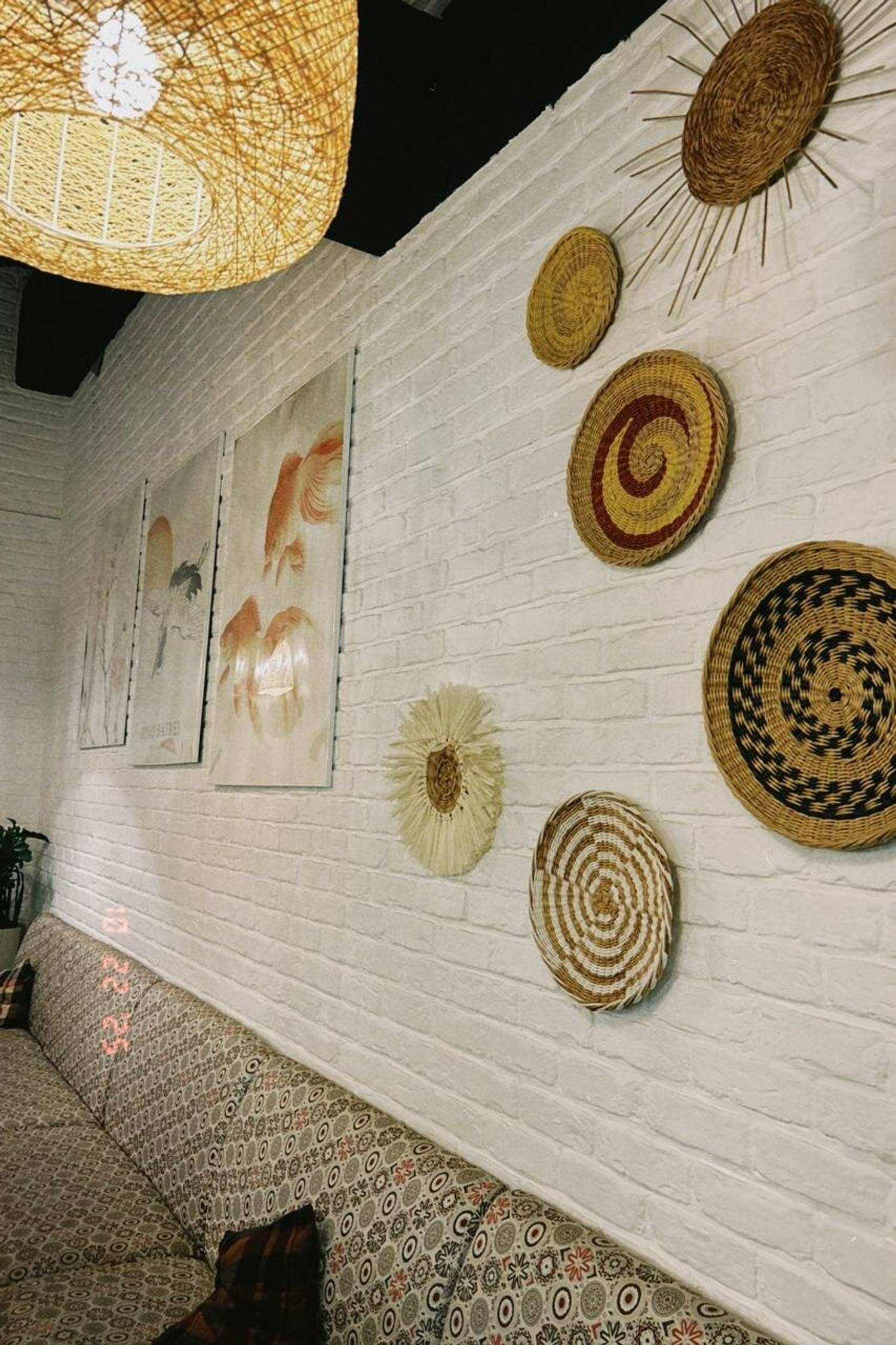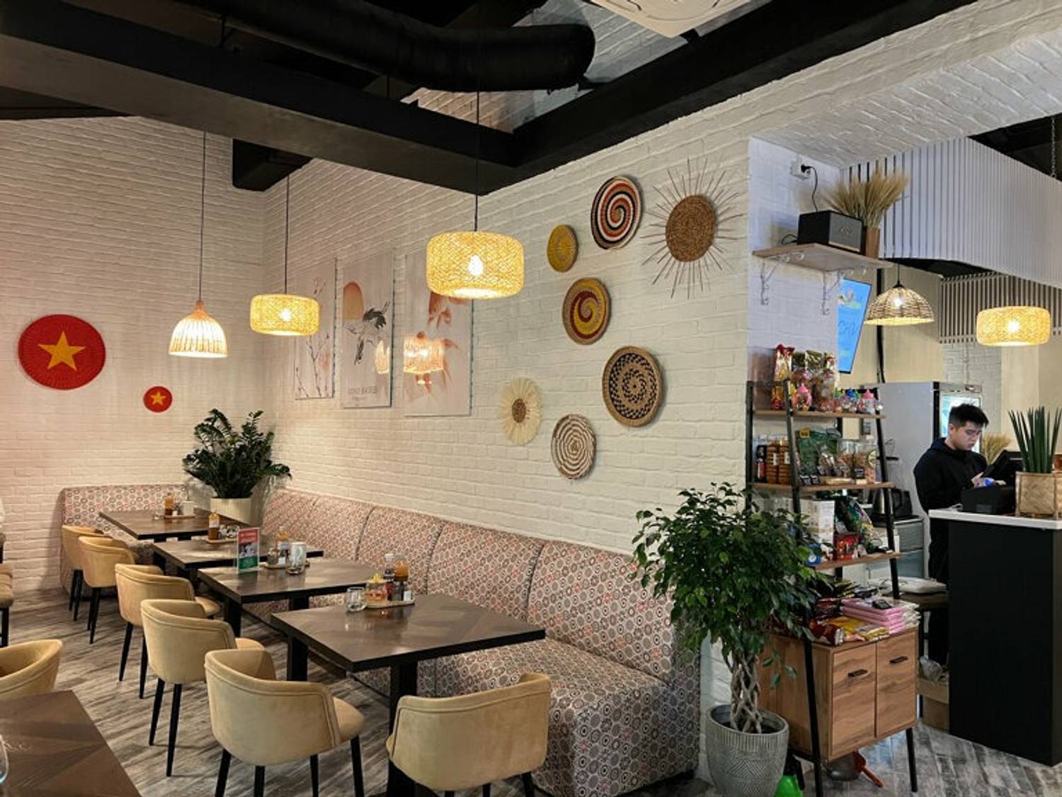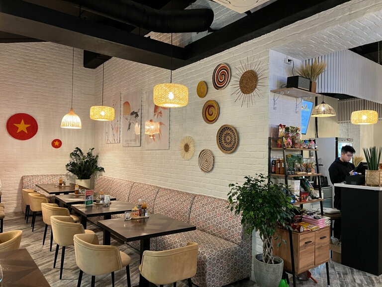 Атмосфера. Неоновые надписи с изображениями вьетнамских блюд как на окнах, так и на стенах, а в дополнение к ним картины и панно из травы, декоративные тарелки с национальным характером. На подоконниках устроили мягкие посадочные места с подушками. Разбавляют интерьер растения в белых кадках.