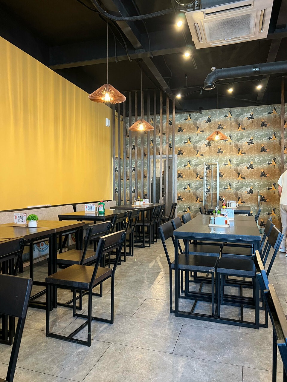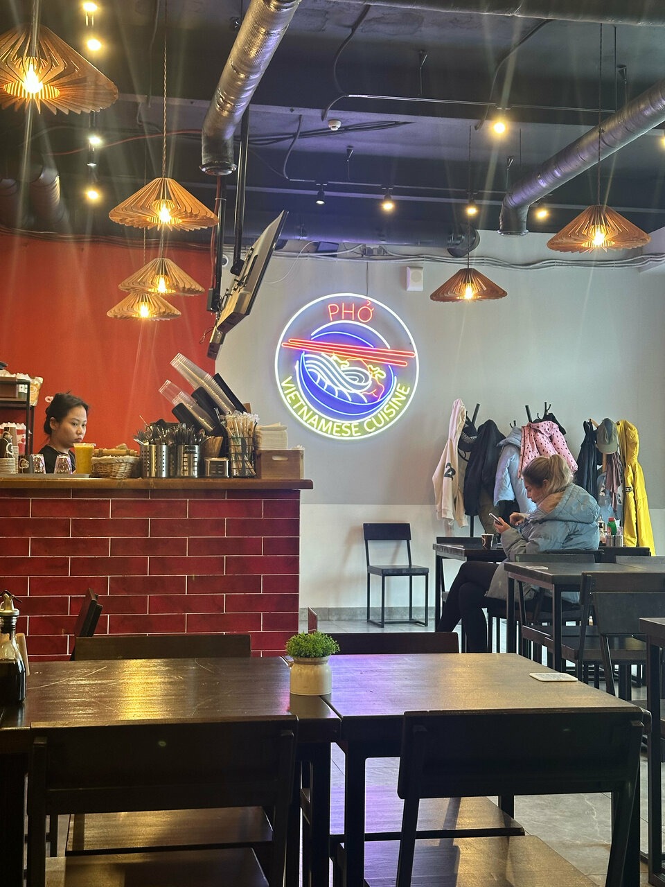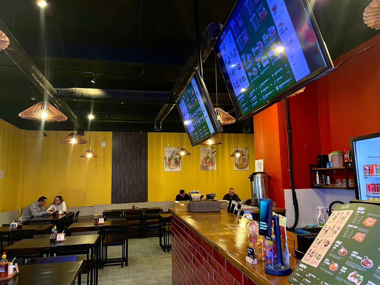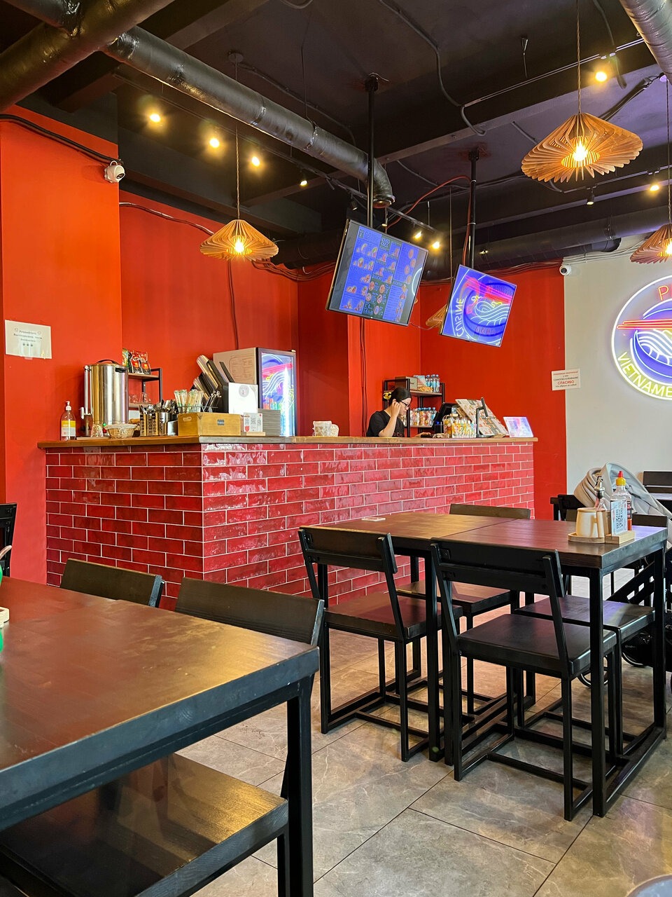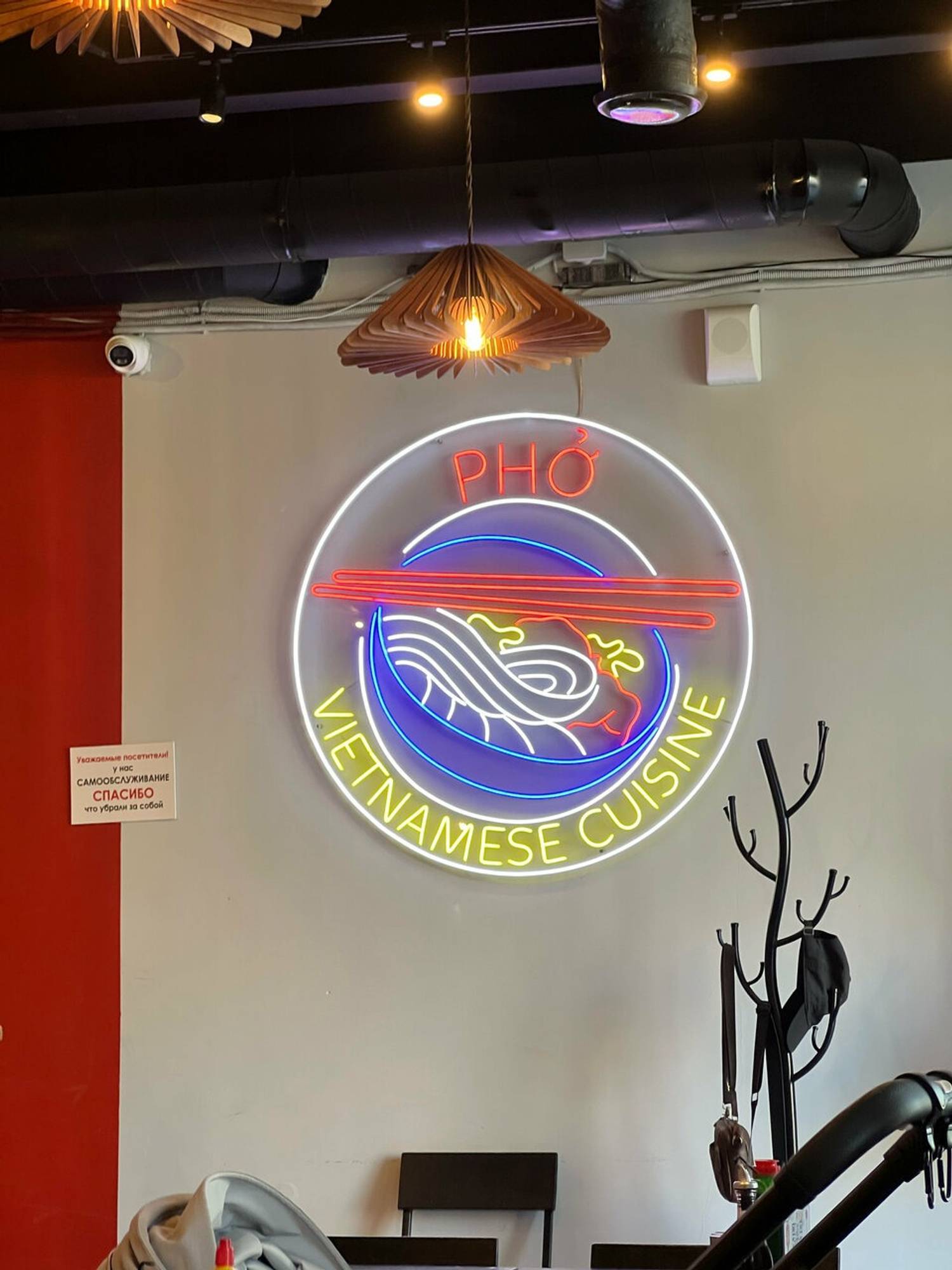 Атмосфера. Первой притягивает взгляды кирпичная стойка, а следом — большое неоновое круглое панно с изображением традиционного супа. Внутри красные и желтые стены, а из мебели черны столы и стулья.