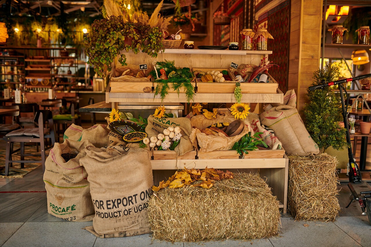 Еда и напитки. В меню — классические грузинские блюда: хачапури по-аджарски, по-имеретински, хинкали с мясными и сырными начинками, шашлыки из мяса и дичи, долма и овощные рулеты. На десерт предлагают карамельный чизкейк и яблочный штрудель.
