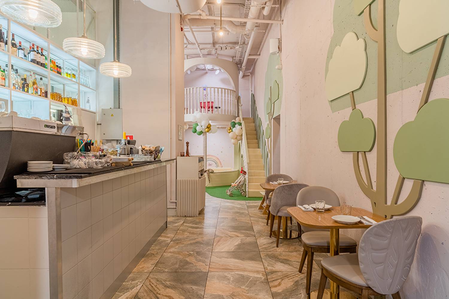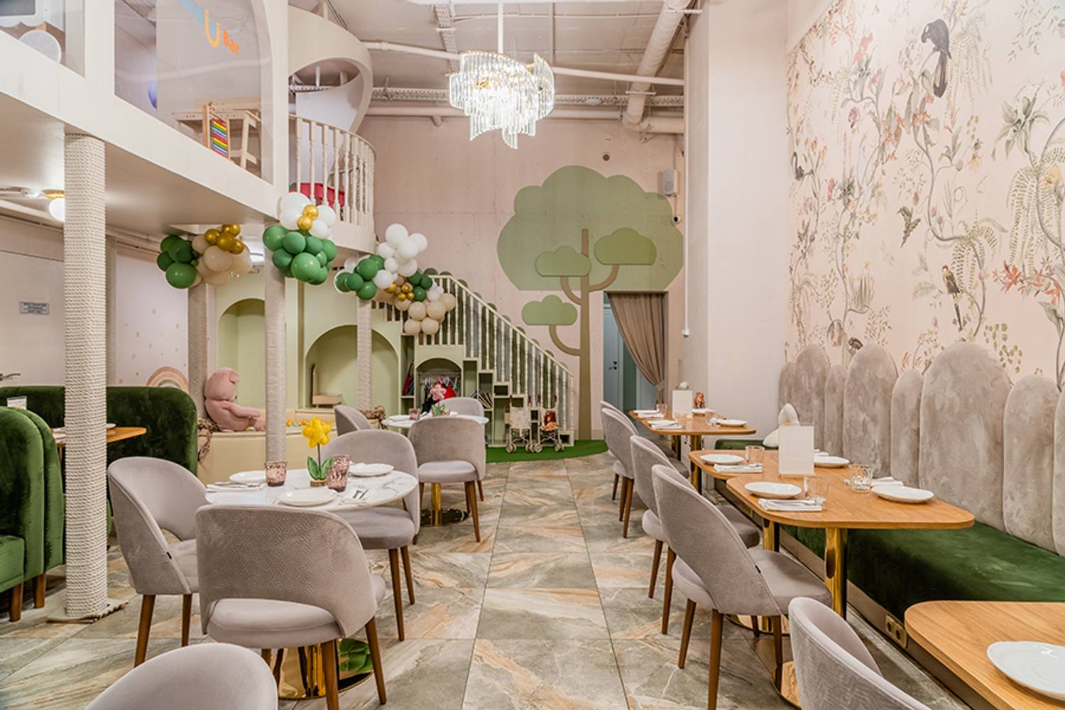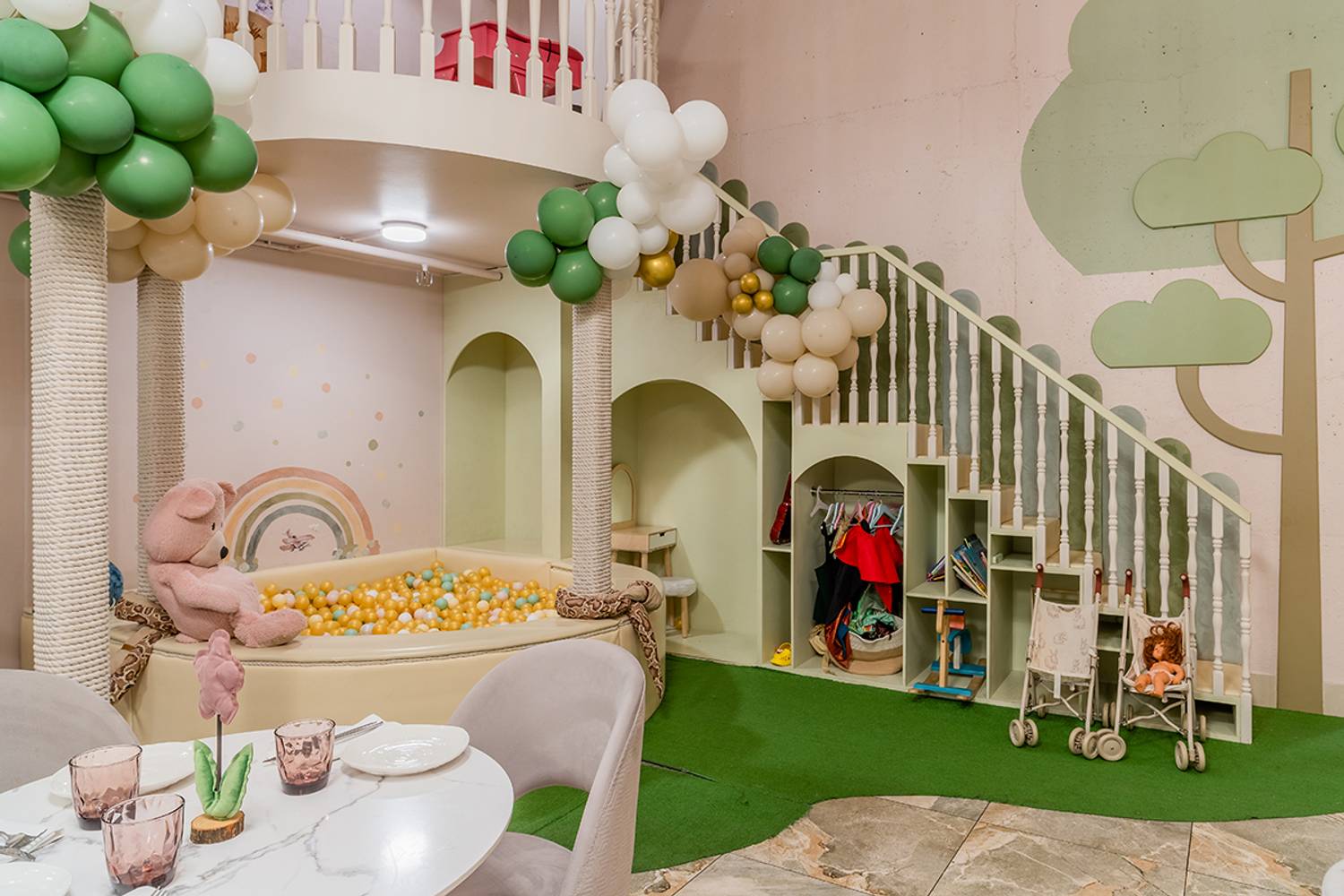 Внутри — просторный светлый зал в пастельных тонах. Центр зала отвели под уютные столики с мягкой мебелью, а по периметру устроили игровые зоны: сухой бассейн, мини-кухня, палатки, машинки и многое другое. С детьми играют няни, а взрослые могут спокойно поесть и отдохнуть.