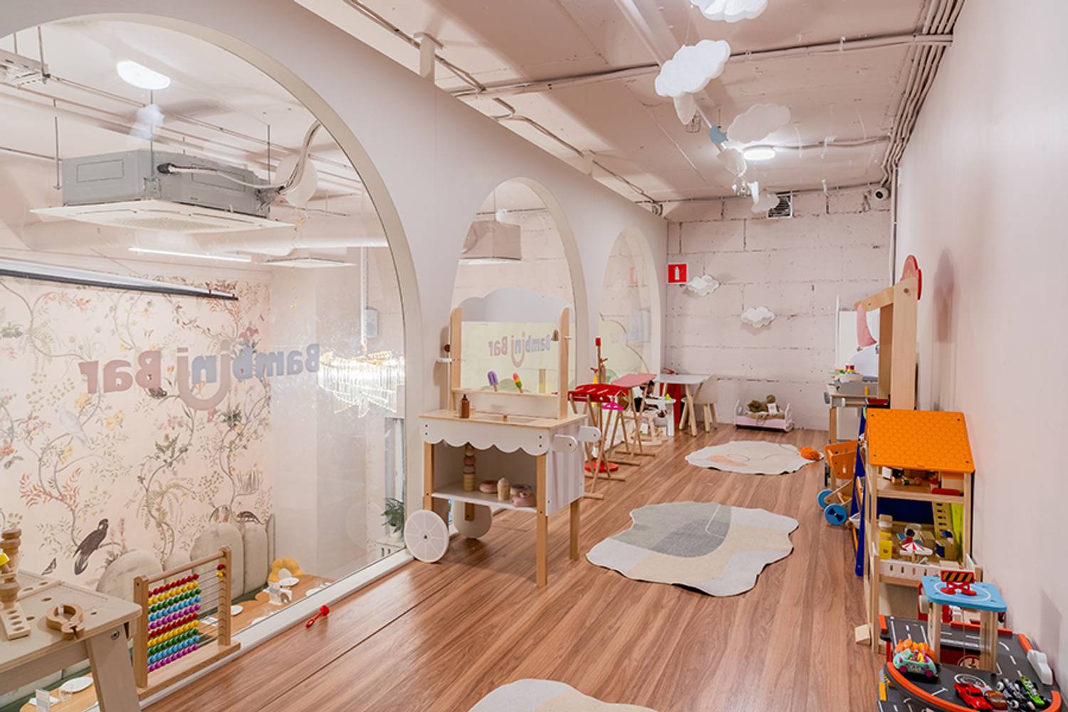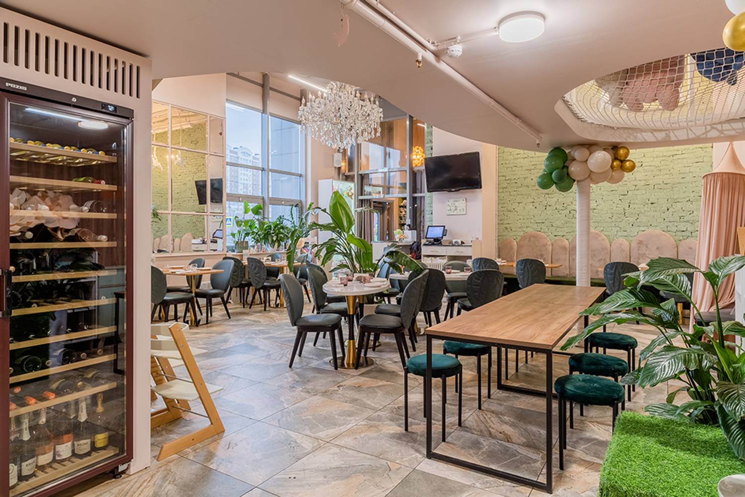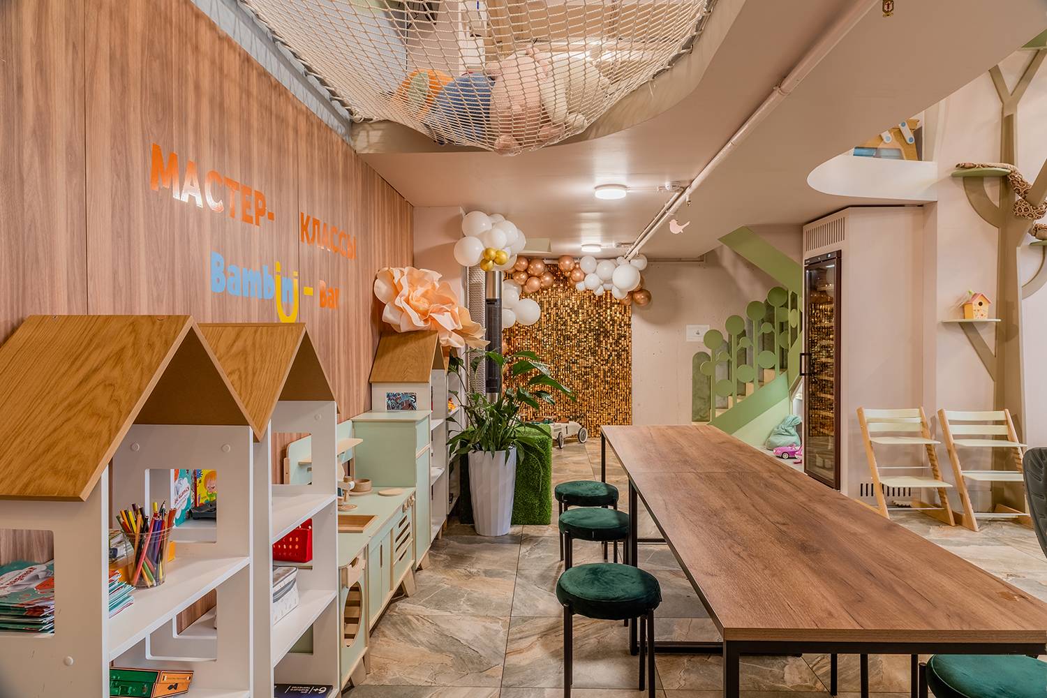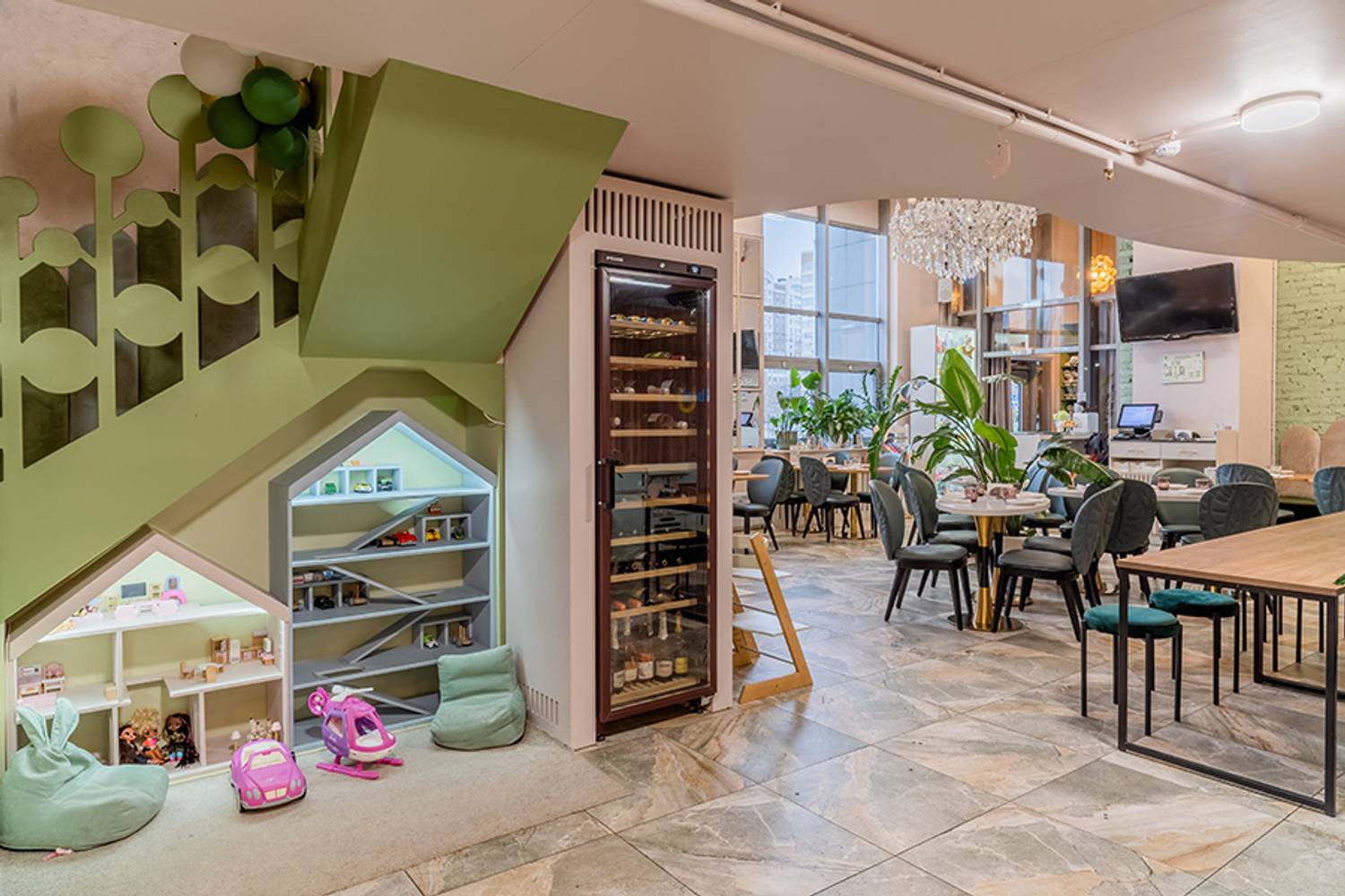 Внутри — просторный светлый зал в пастельных тонах. Центр зала отвели под уютные столики с мягкой мебелью, а по периметру устроили игровые зоны: сухой бассейн, мини-кухня, палатки, машинки и многое другое. С детьми играют няни, а взрослые могут спокойно поесть и отдохнуть.