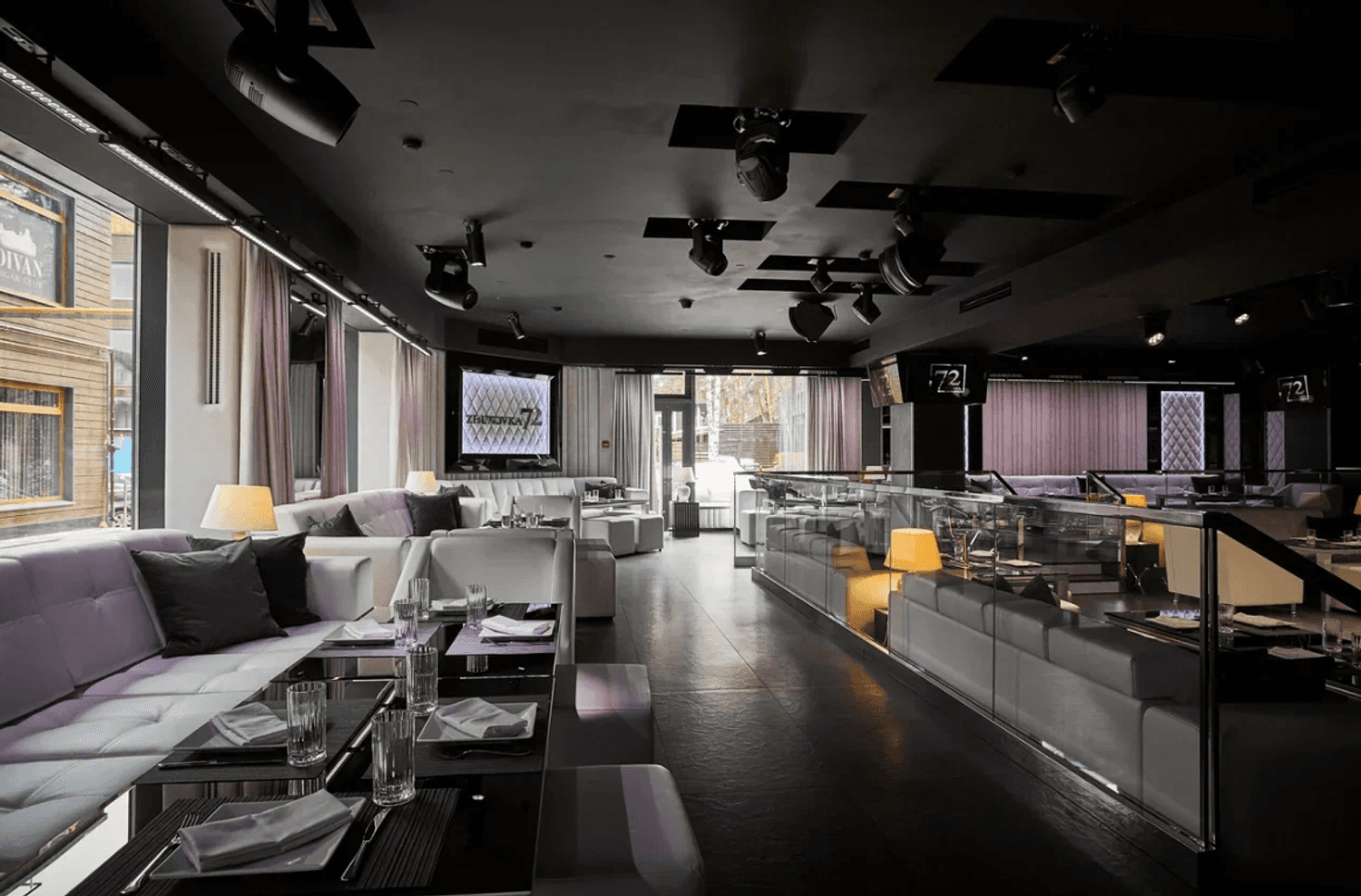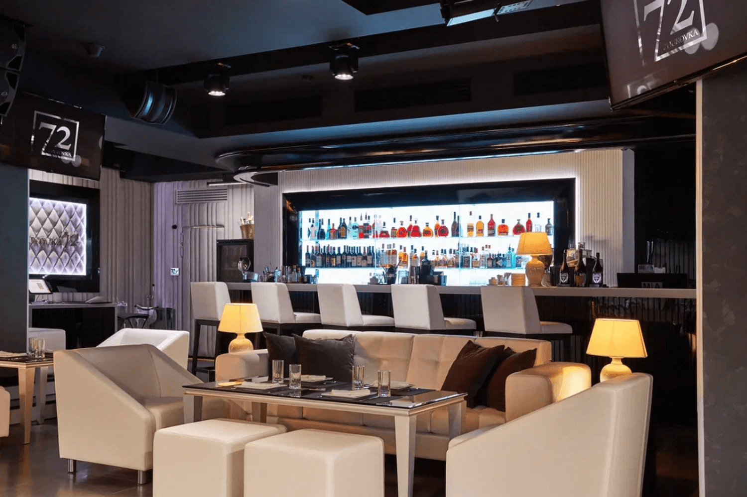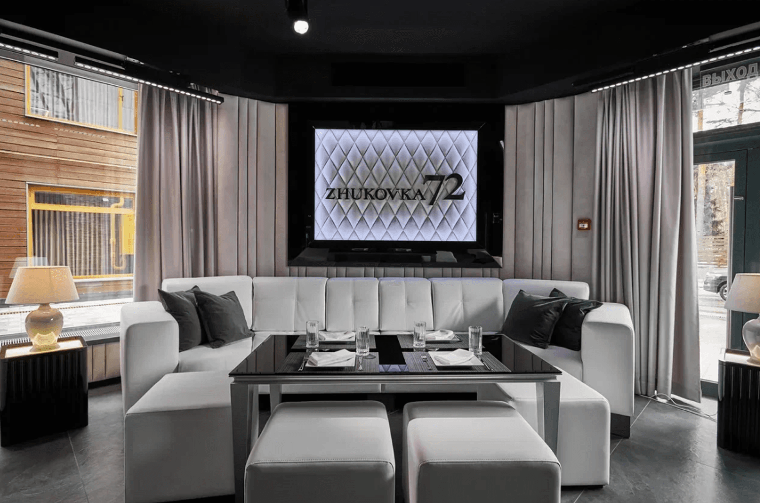 Атмосфера. Интерьер в эффектной черно-белой гамме с контрастной мебелью, тканевыми драпировками и театральной подсветкой создает ощущение приватного театра. Пространство разделено стеклянными перегородками, а современное звуковое оборудование и огромные экраны дадут вам с комфортом насладиться звуком и видеорядом.