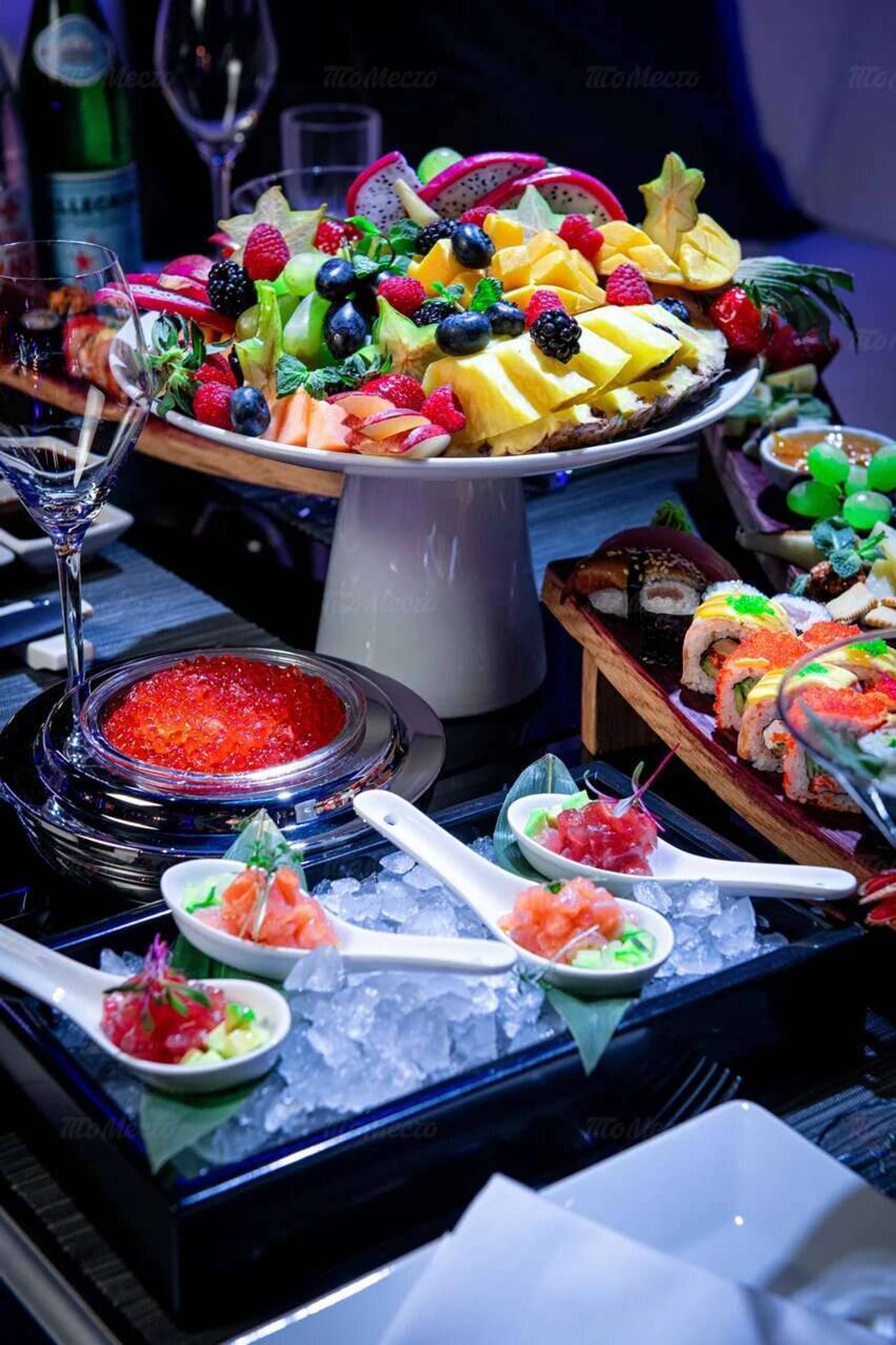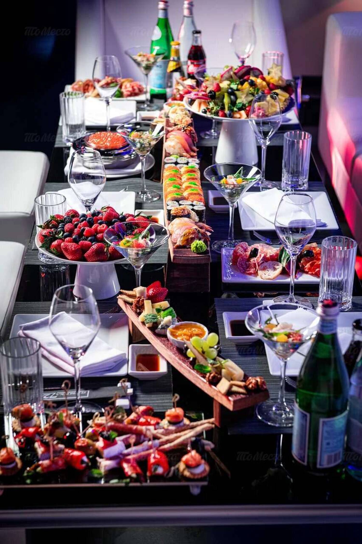 Еда и напитки. В меню — изысканные блюда европейской кухни: карпаччо из мраморной говядины, вителло тоннато, брускетты с уткой и камамбером. Среди главных хитов — паппарделле с белыми грибами, салат «Цезарь» и впечатляющее плато с морепродуктами. На десерт можно заказать ассорти конфет или сыров.