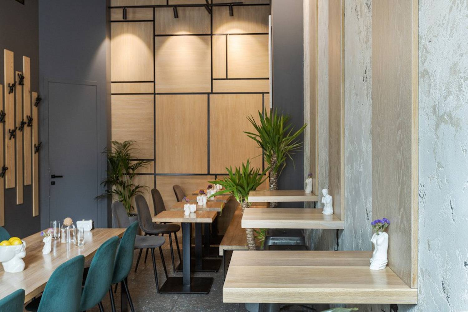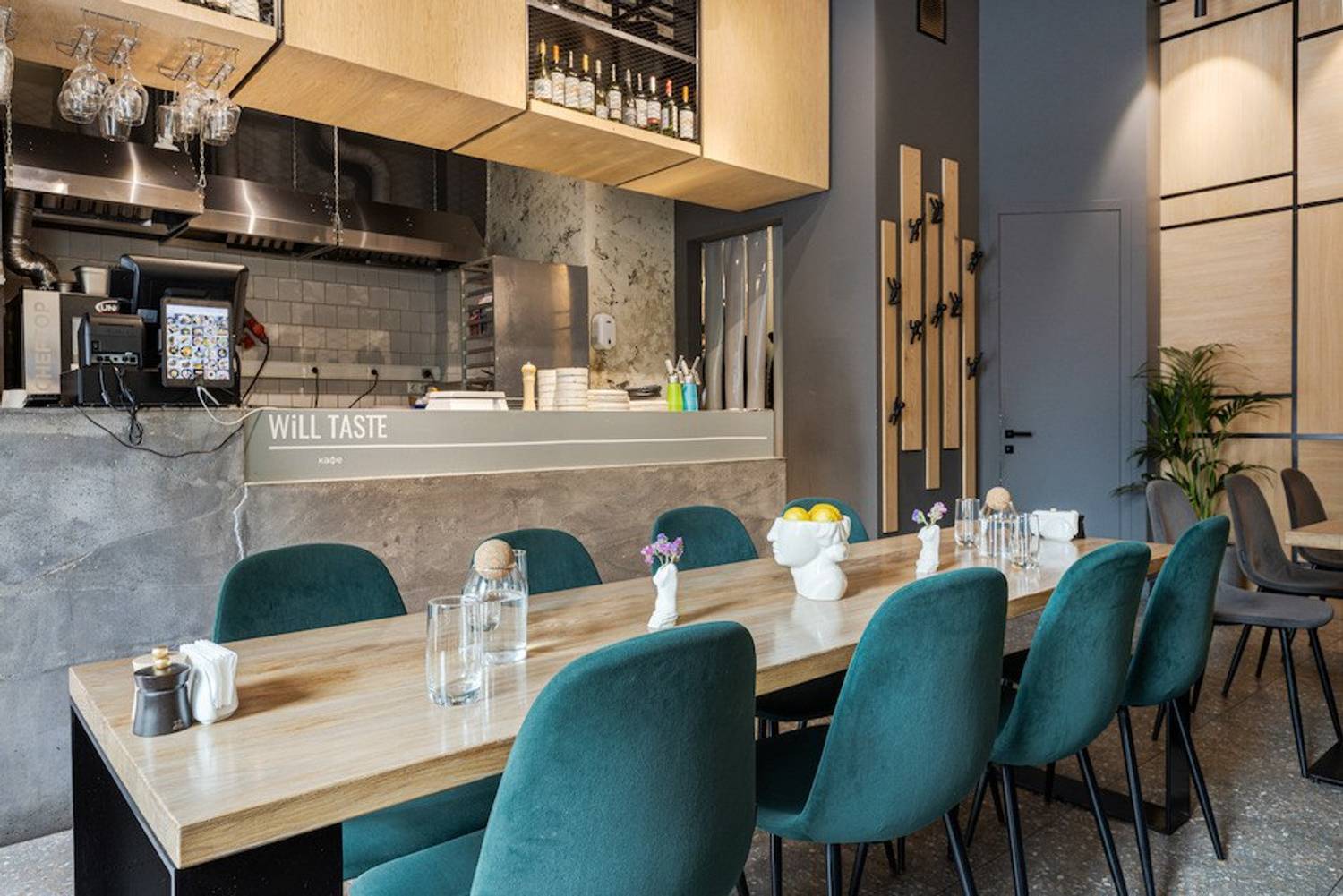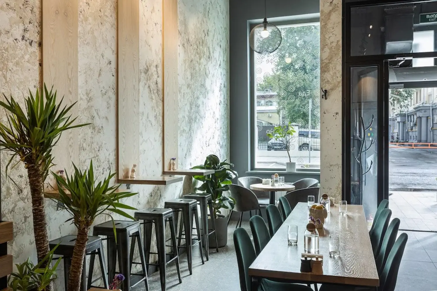Атмосфера. Светлое пространство с панорамными окнами и спокойной палитрой серо-бежевых тонов создает ощущение легкости. Интерьер дополняют изумрудные акценты, высокие растения в кадках и авторская керамика. На полках расставлены миниатюрные фигурки, а открытая кухня и несколько зон — от уютных столиков у окон до общей лаунж-зоны — позволяют каждому гостю найти комфортный уголок.